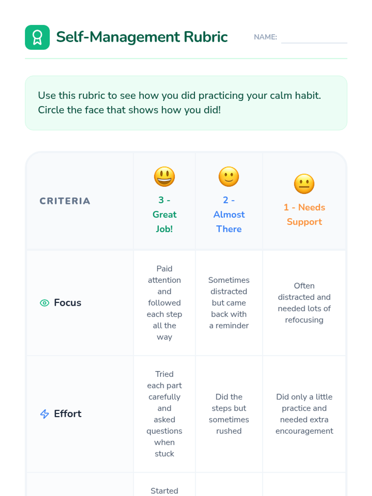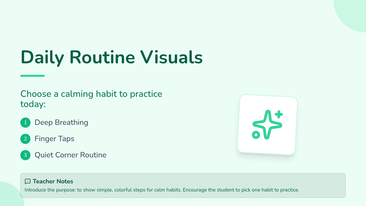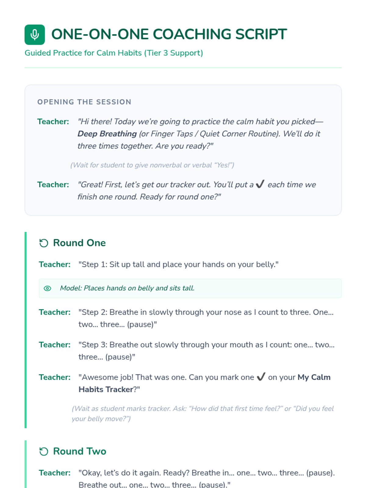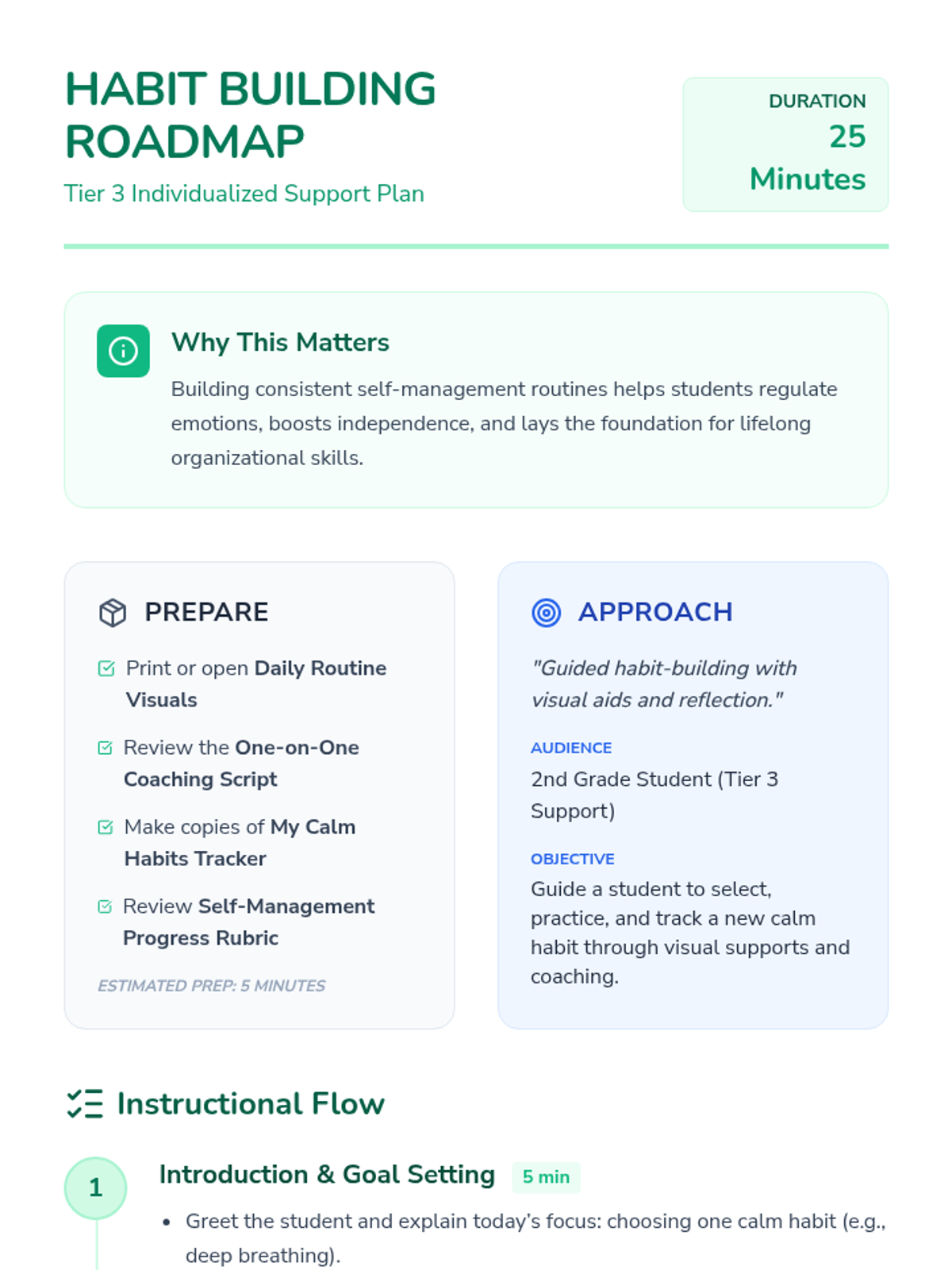 A short pithy individualized plan to help a 2nd grade student develop consistent self-management routines through guided habit-building. This Tier 3 lesson provides one-on-one support, emphasizing personal goal setting, visual cues, and progress tracking across a 25-minute session.