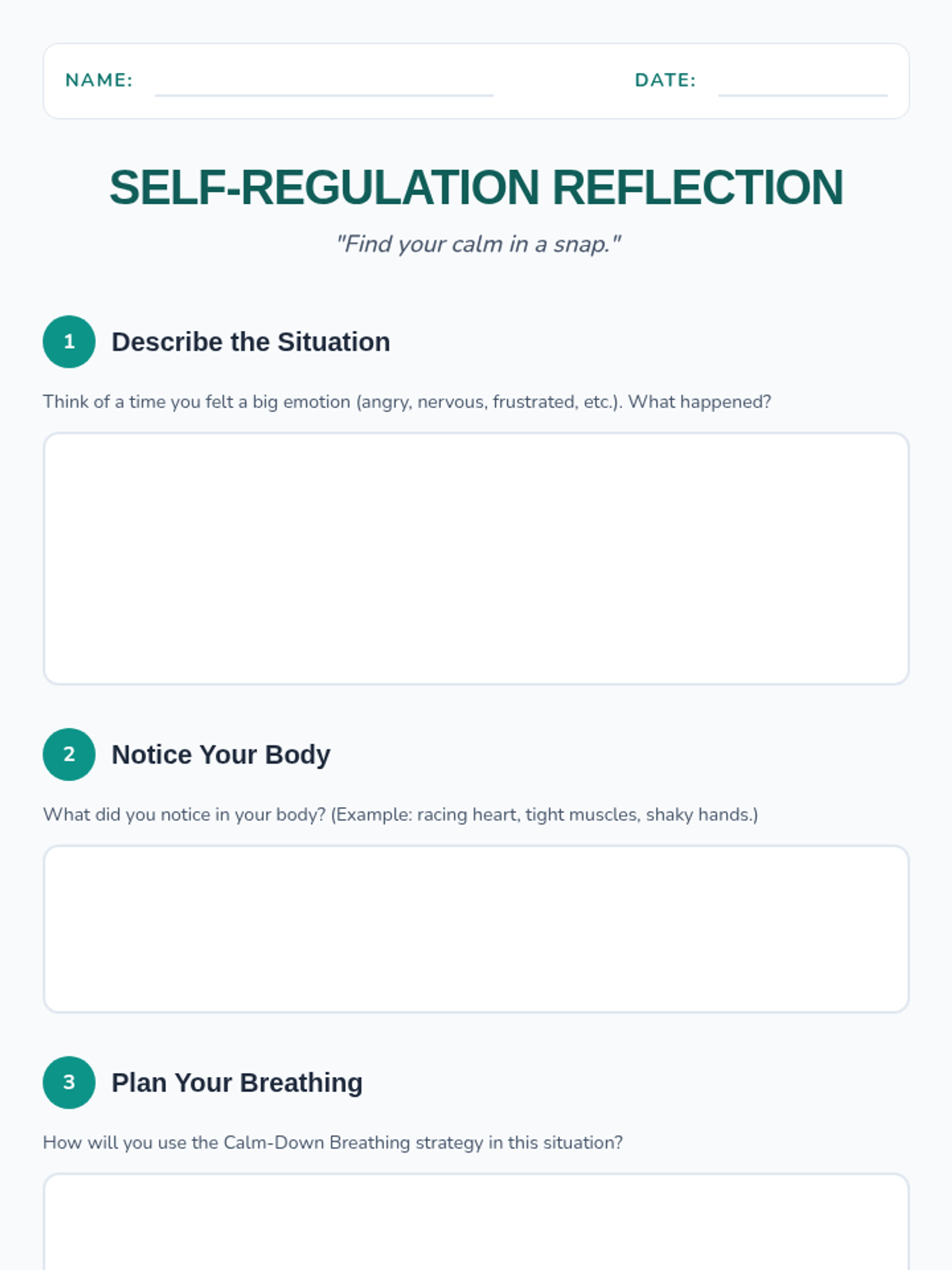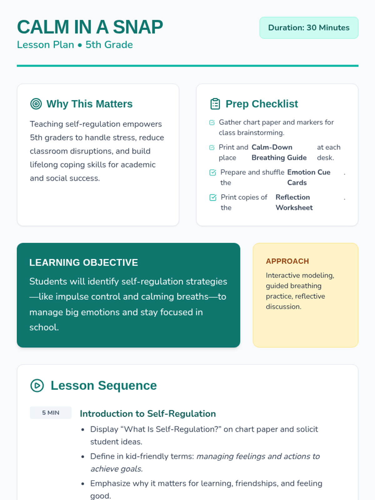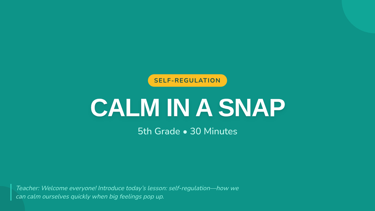 A 30-minute lesson for 5th graders on self-regulation strategies, featuring interactive modeling of box breathing and reflective practice to manage big emotions.