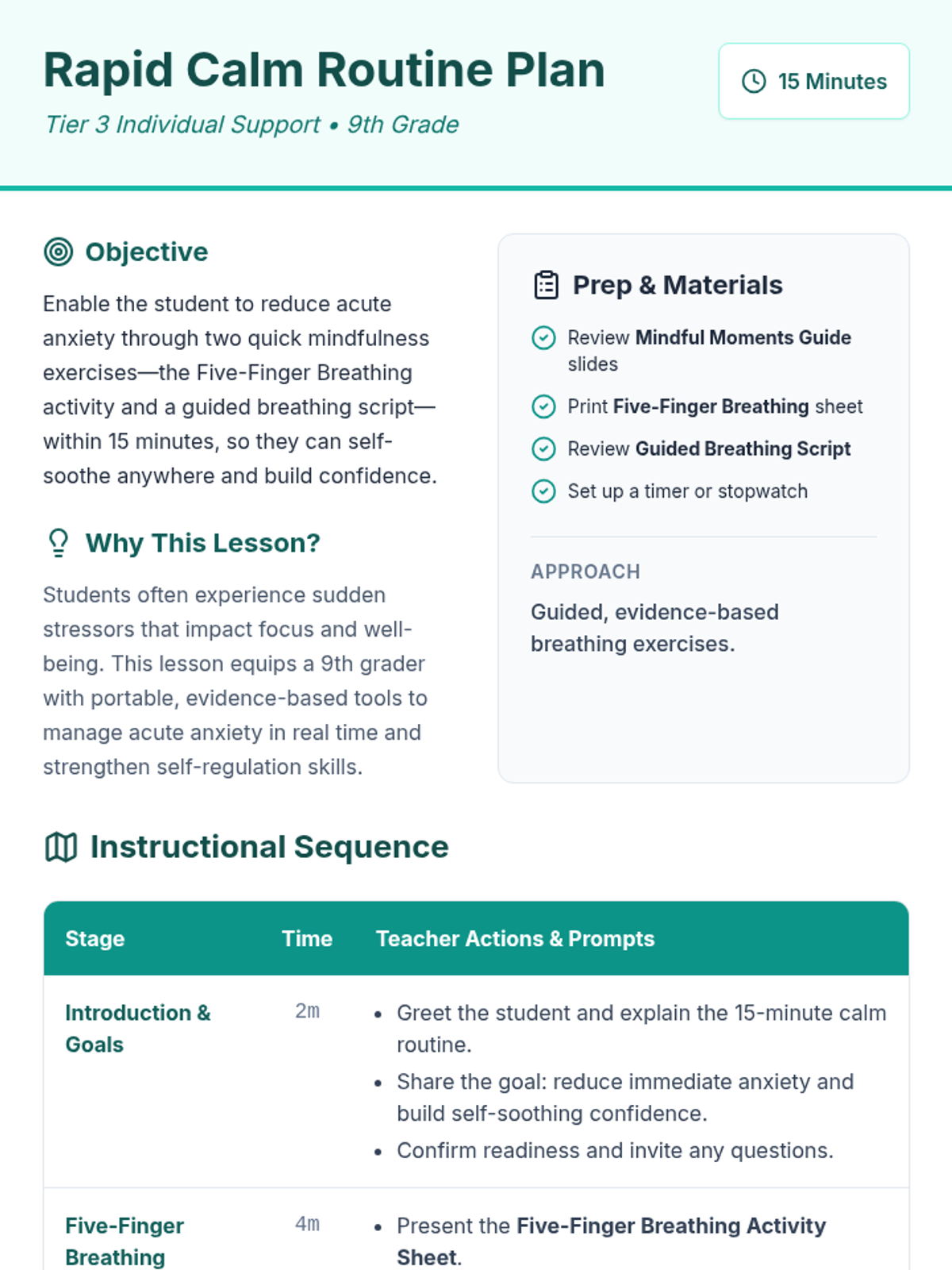 A quick, evidence-based 15-minute Tier 3 mindfulness session for 9th graders to manage acute anxiety through breathing techniques.