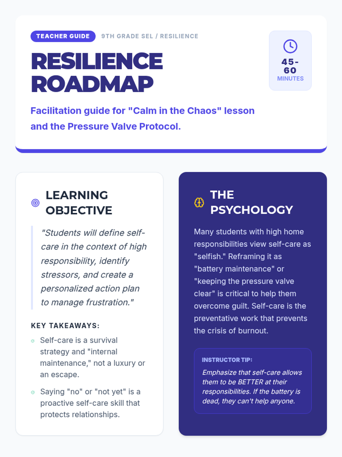 A lesson focused on equipping 9th-grade students with practical tools to manage high-pressure environments at home and school through a structured personal self-care plan.