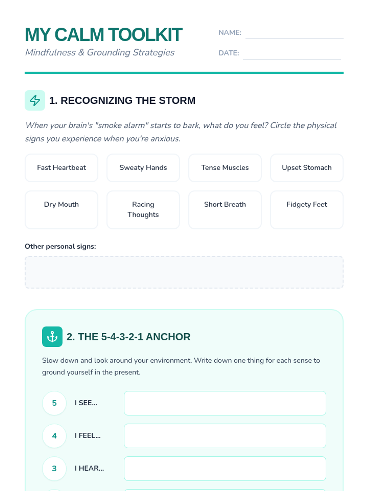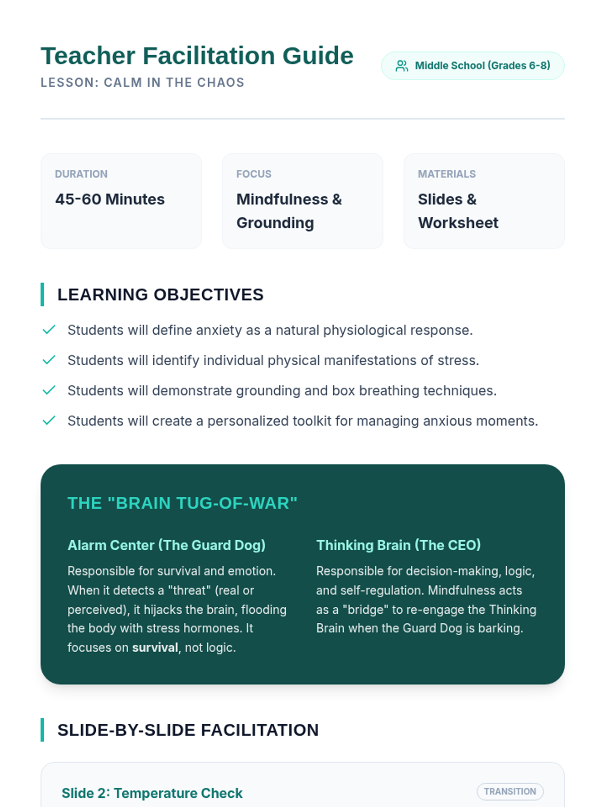 A middle school lesson introducing students to anxiety-reduction through mindfulness and grounding techniques, featuring practical exercises like box breathing and the 5-4-3-2-1 method.