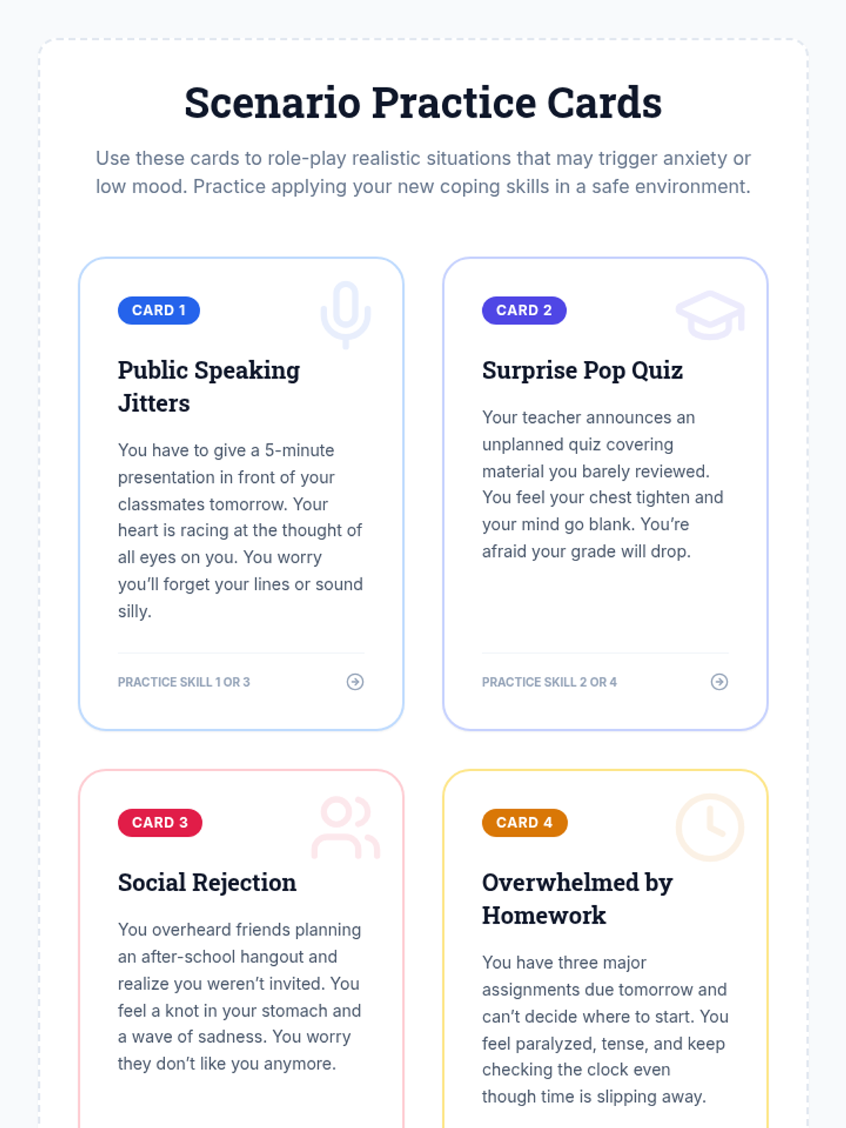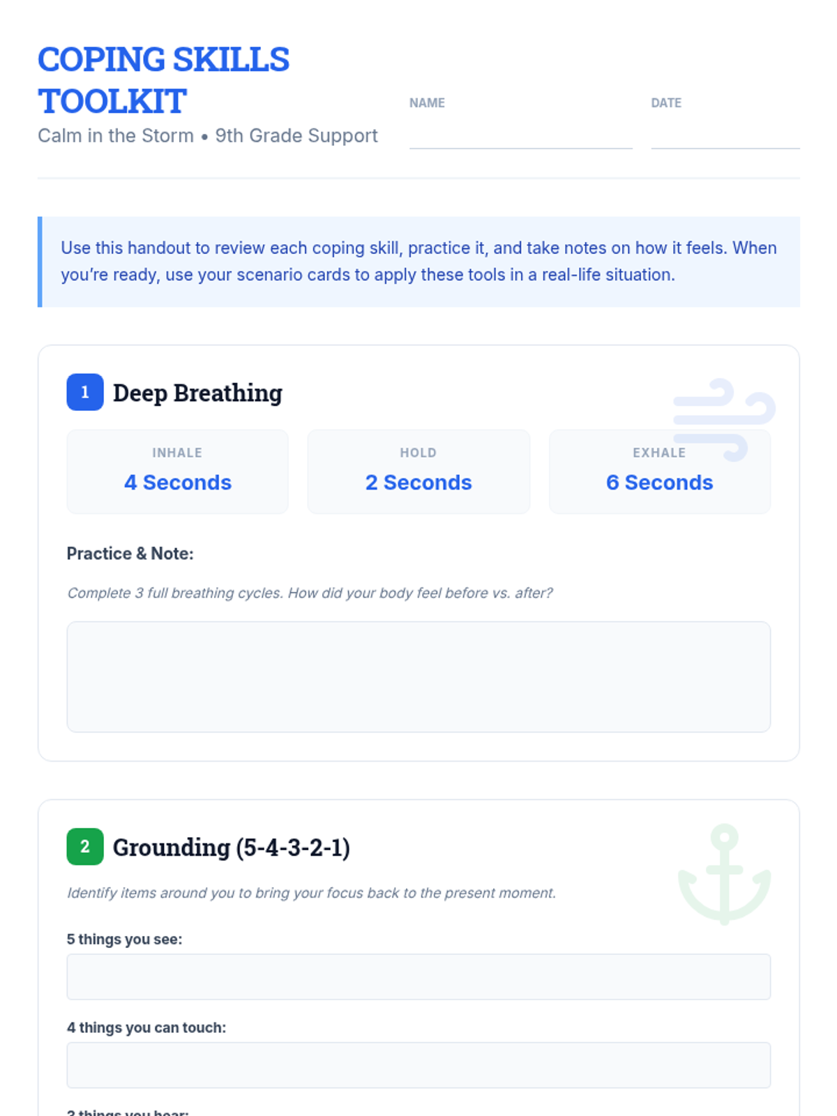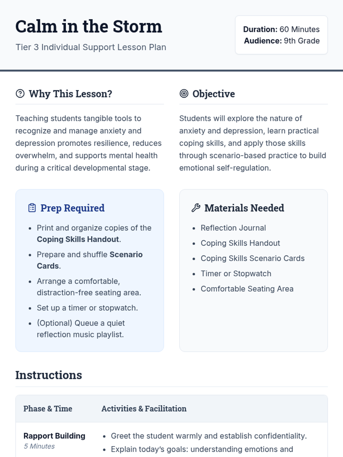This 60-minute, Tier 3 individual support lesson for 9th graders helps students explore anxiety and depression, learn practical coping skills, and practice scenario-based strategies to navigate mental health challenges effectively.