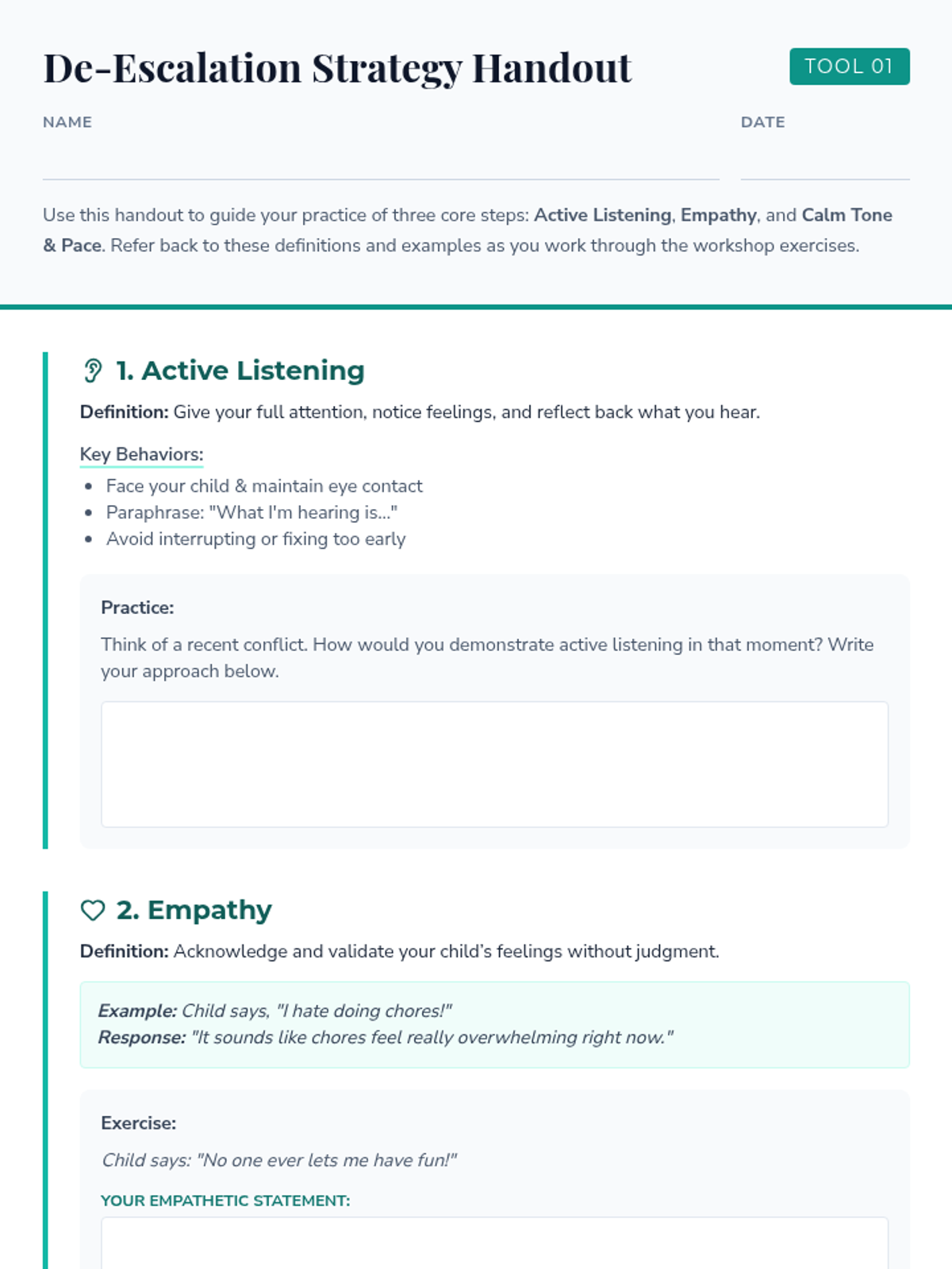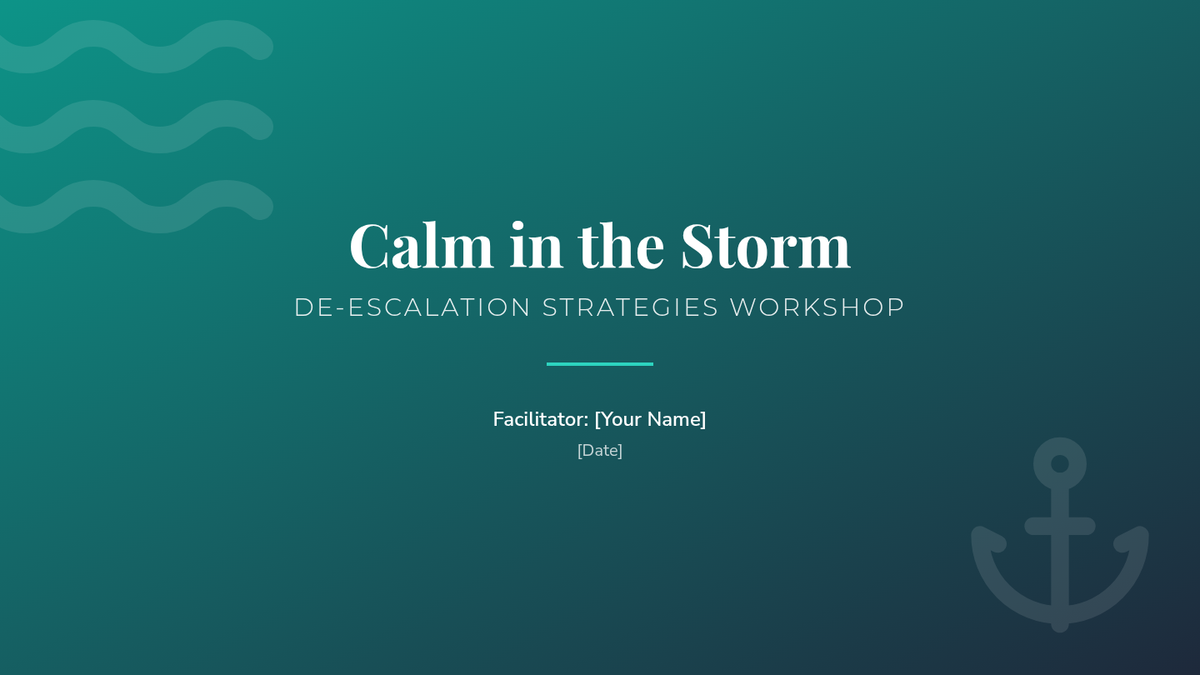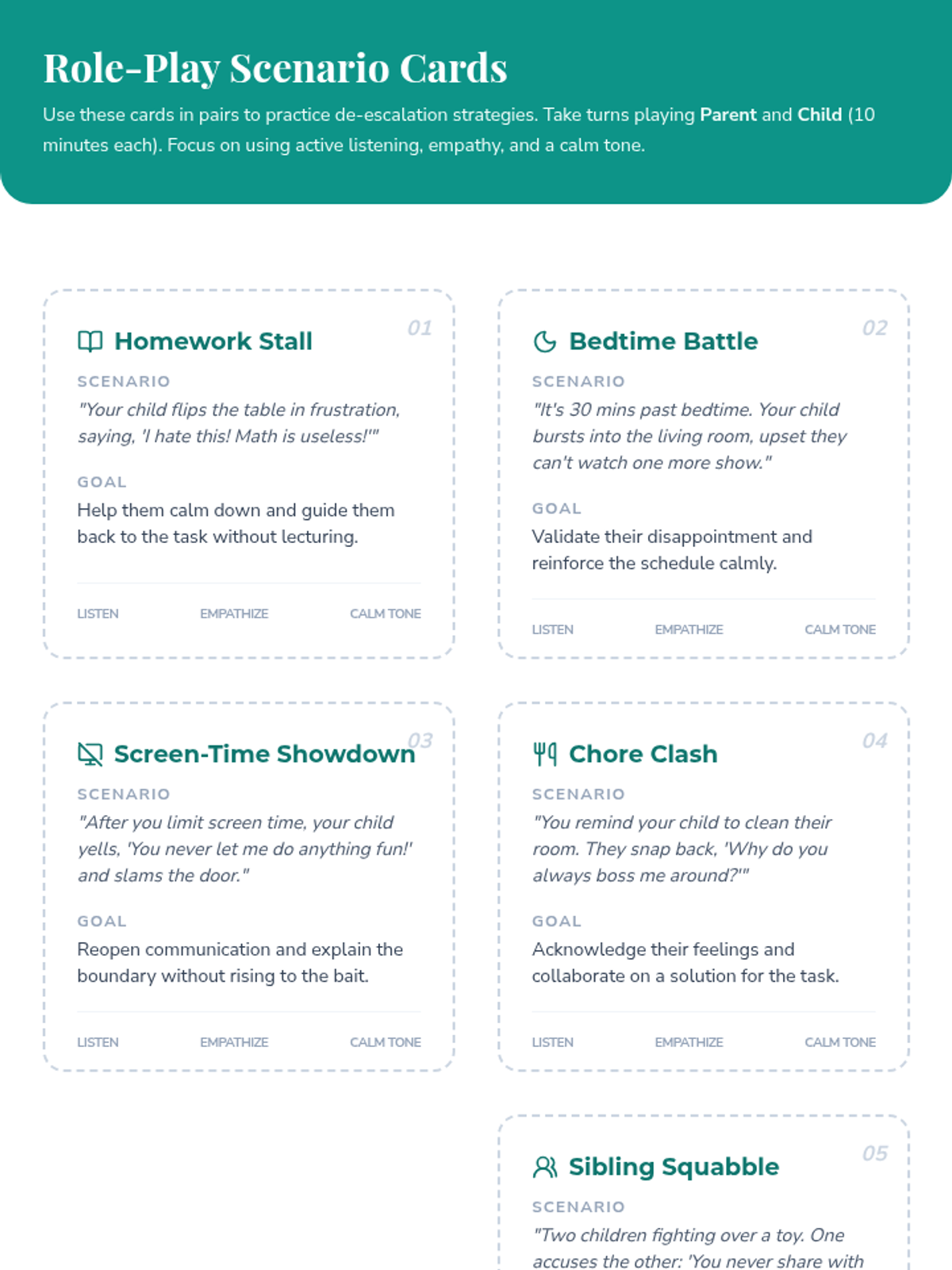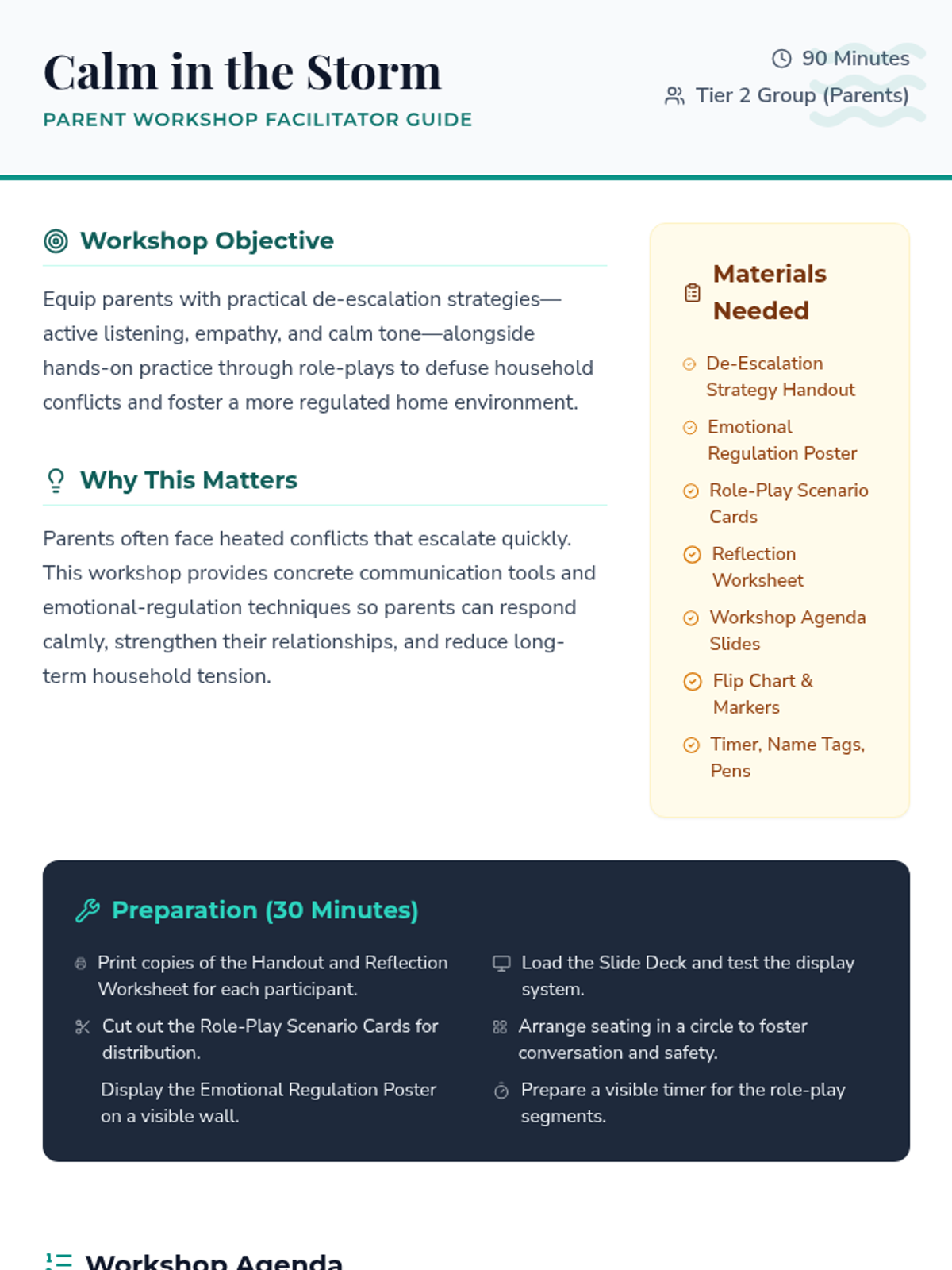 A 90-minute workshop for parents focused on de-escalation techniques and emotional regulation to manage household conflicts calmly and effectively.