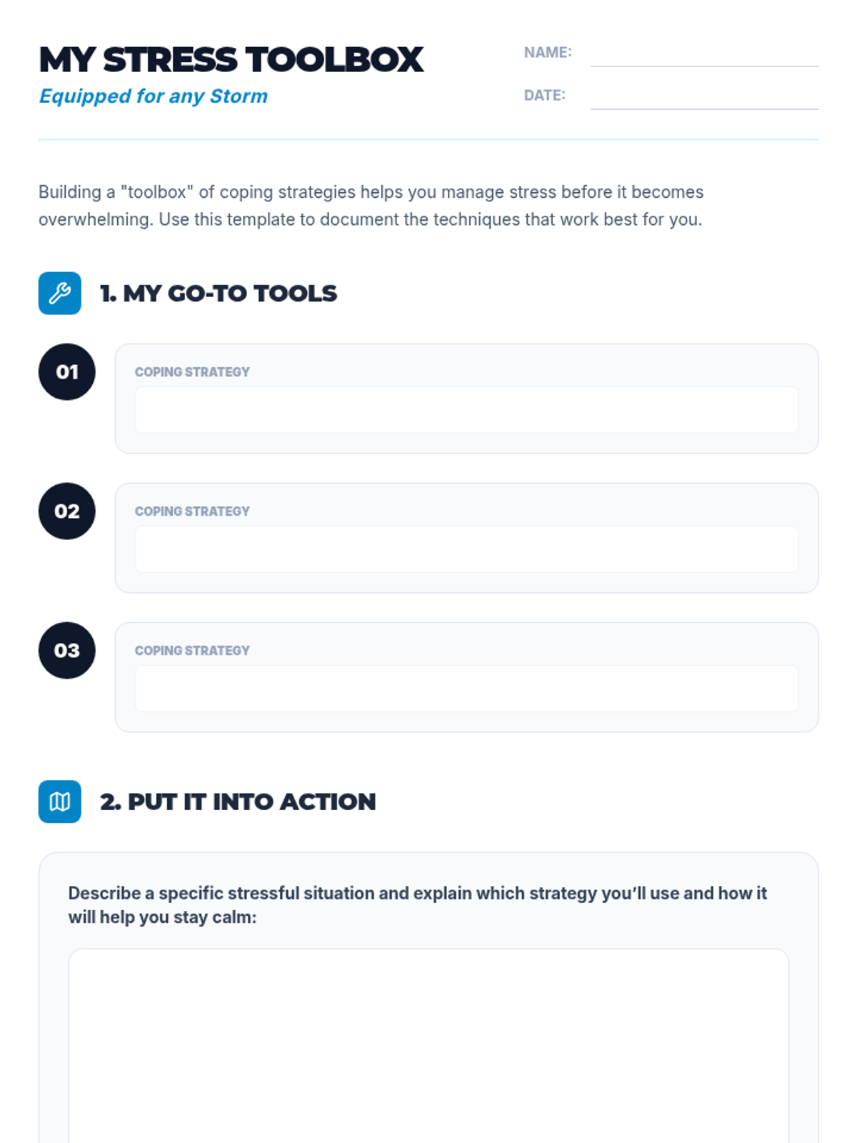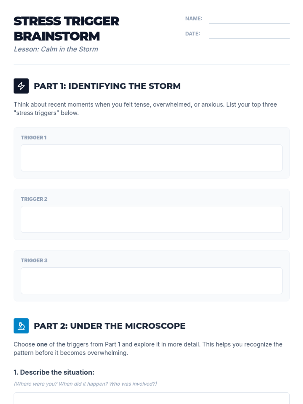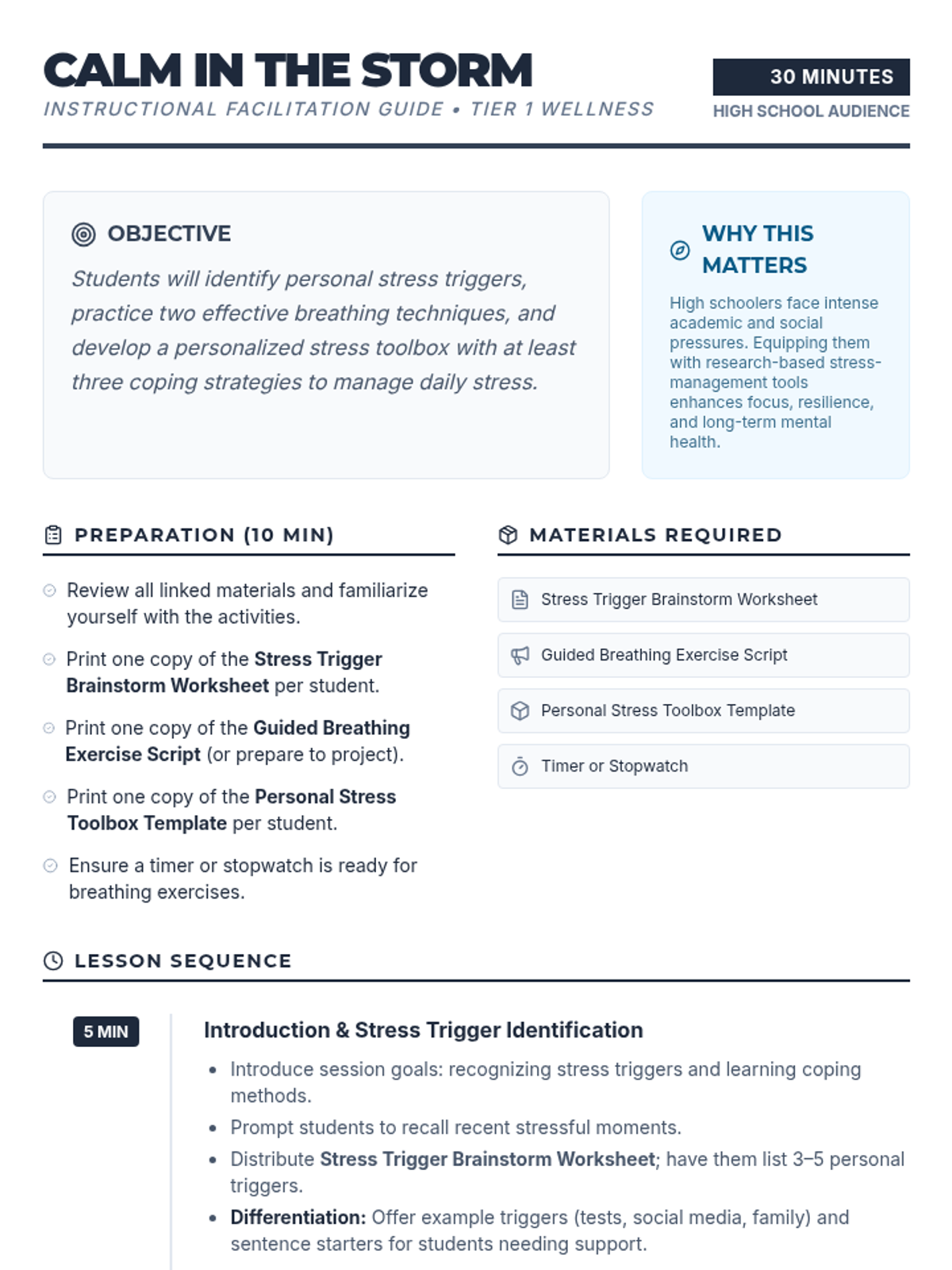 A 30-minute high school lesson focused on identifying stress triggers, practicing breathing techniques, and creating a personalized stress management toolbox.