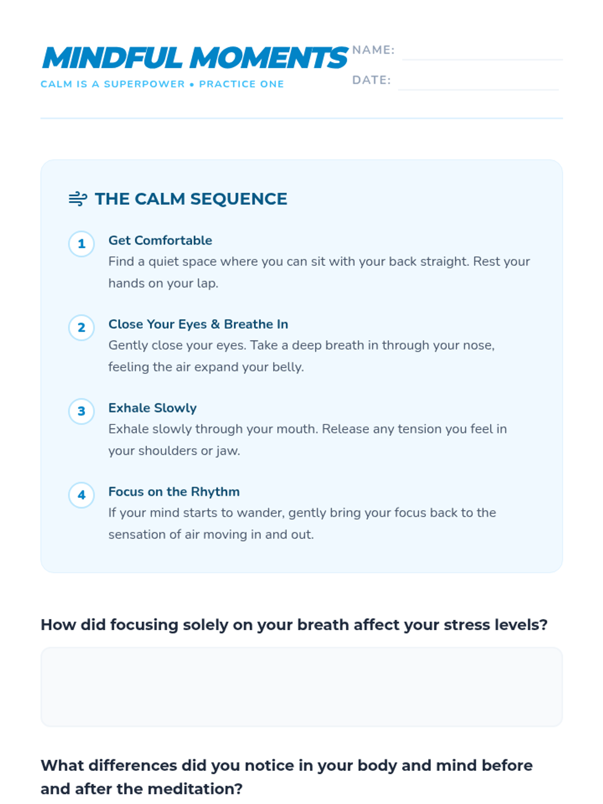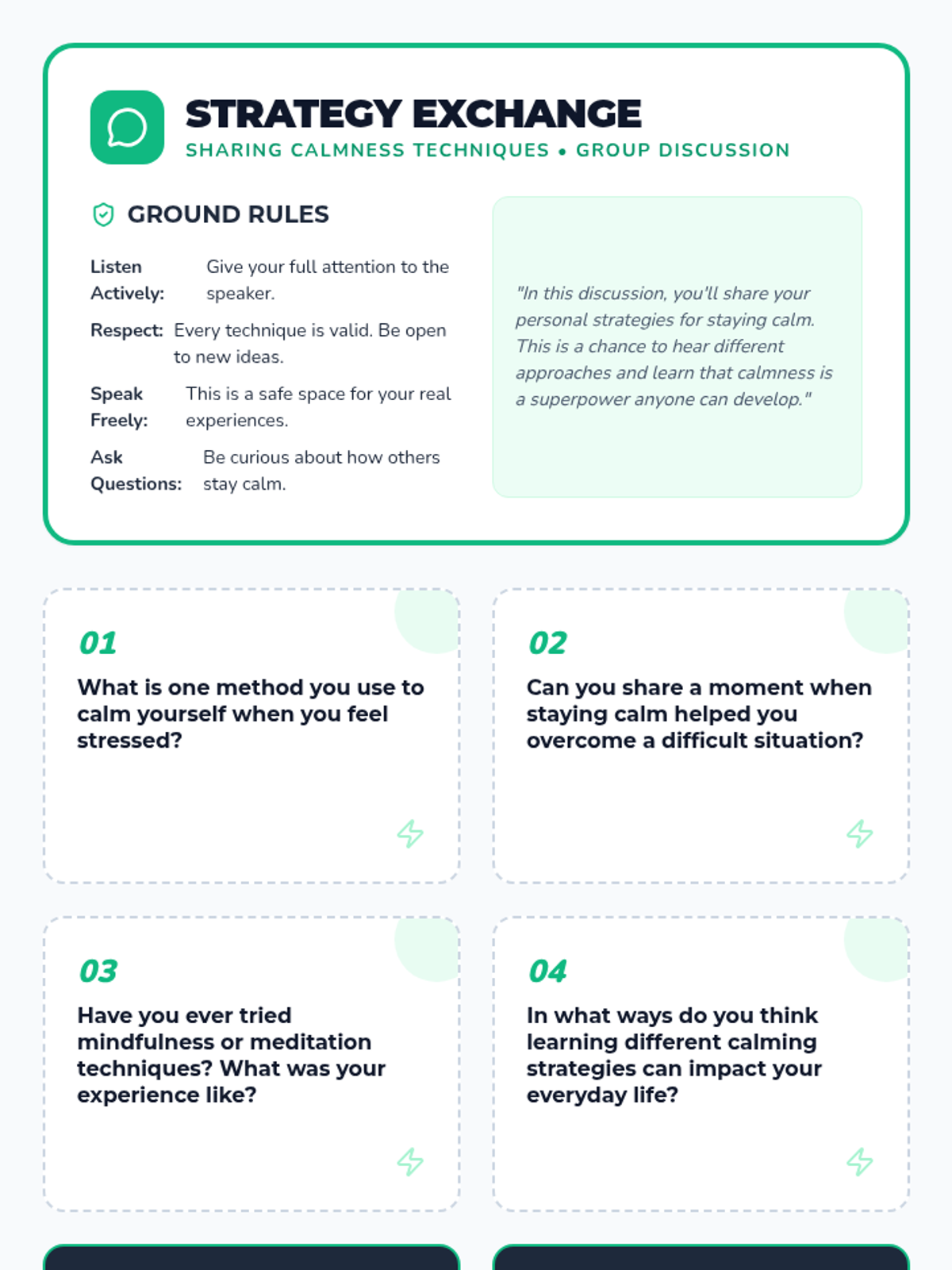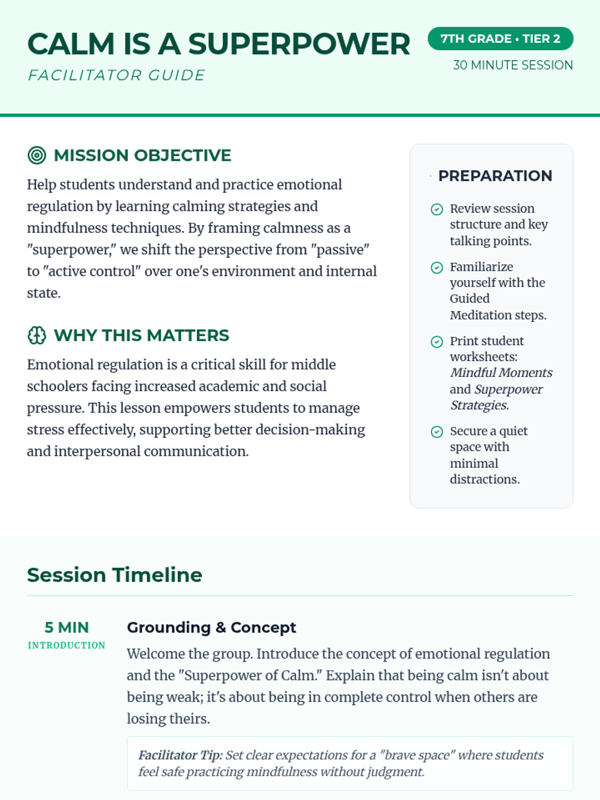 A small-group social-emotional learning lesson for 7th graders focused on emotional regulation and mindfulness. Students learn to view calmness as a 'superpower' for managing stress and making better decisions.