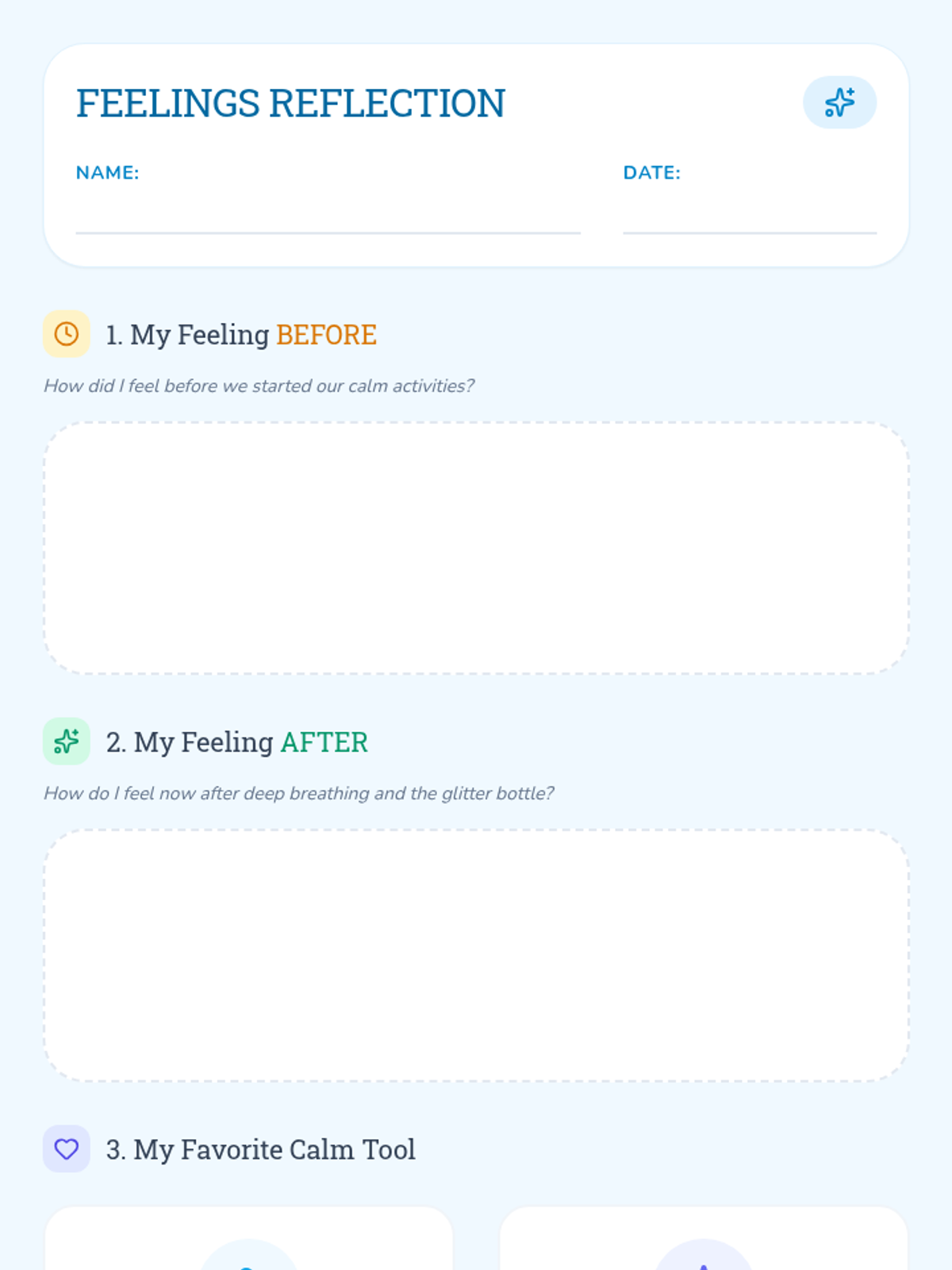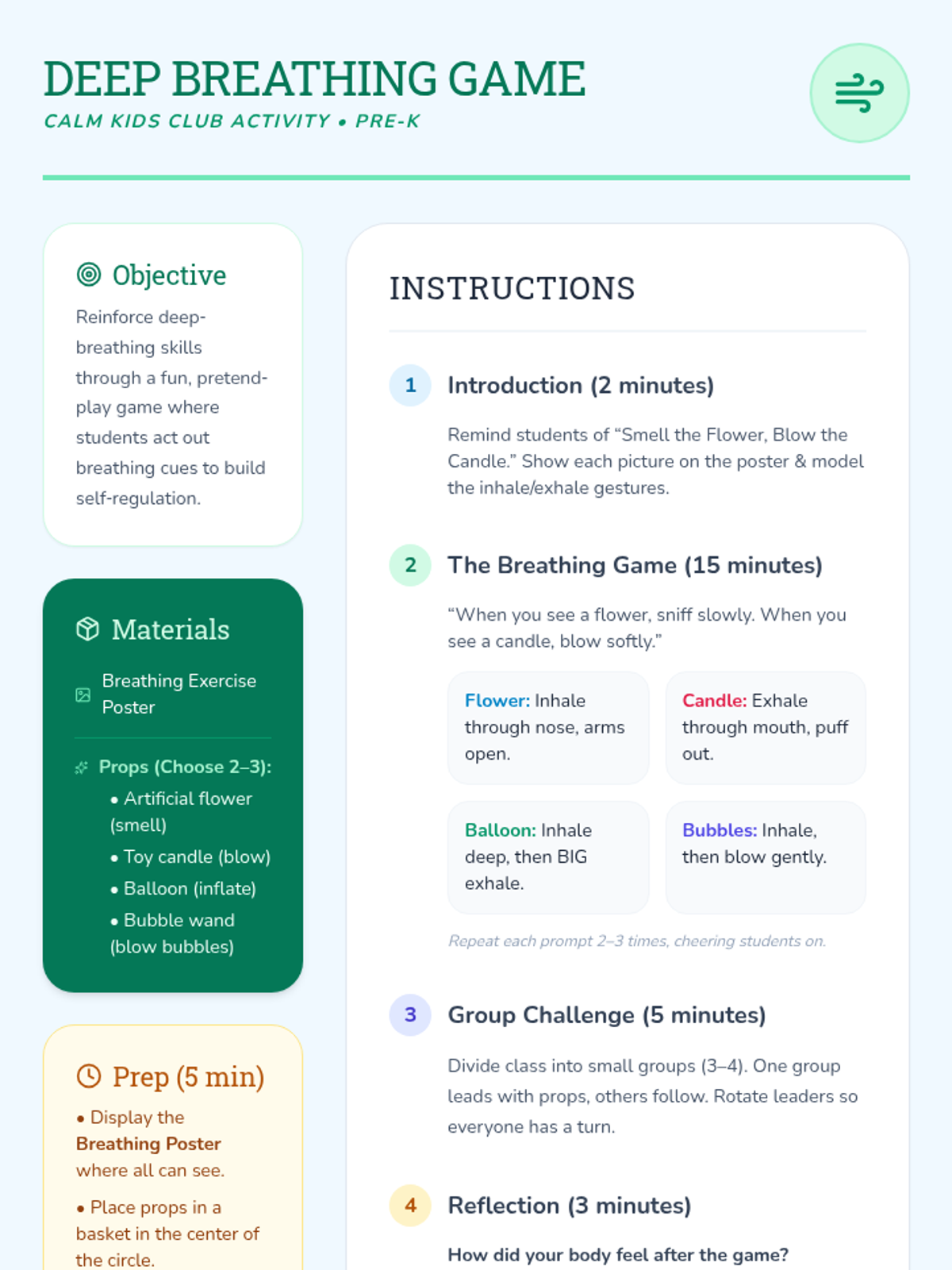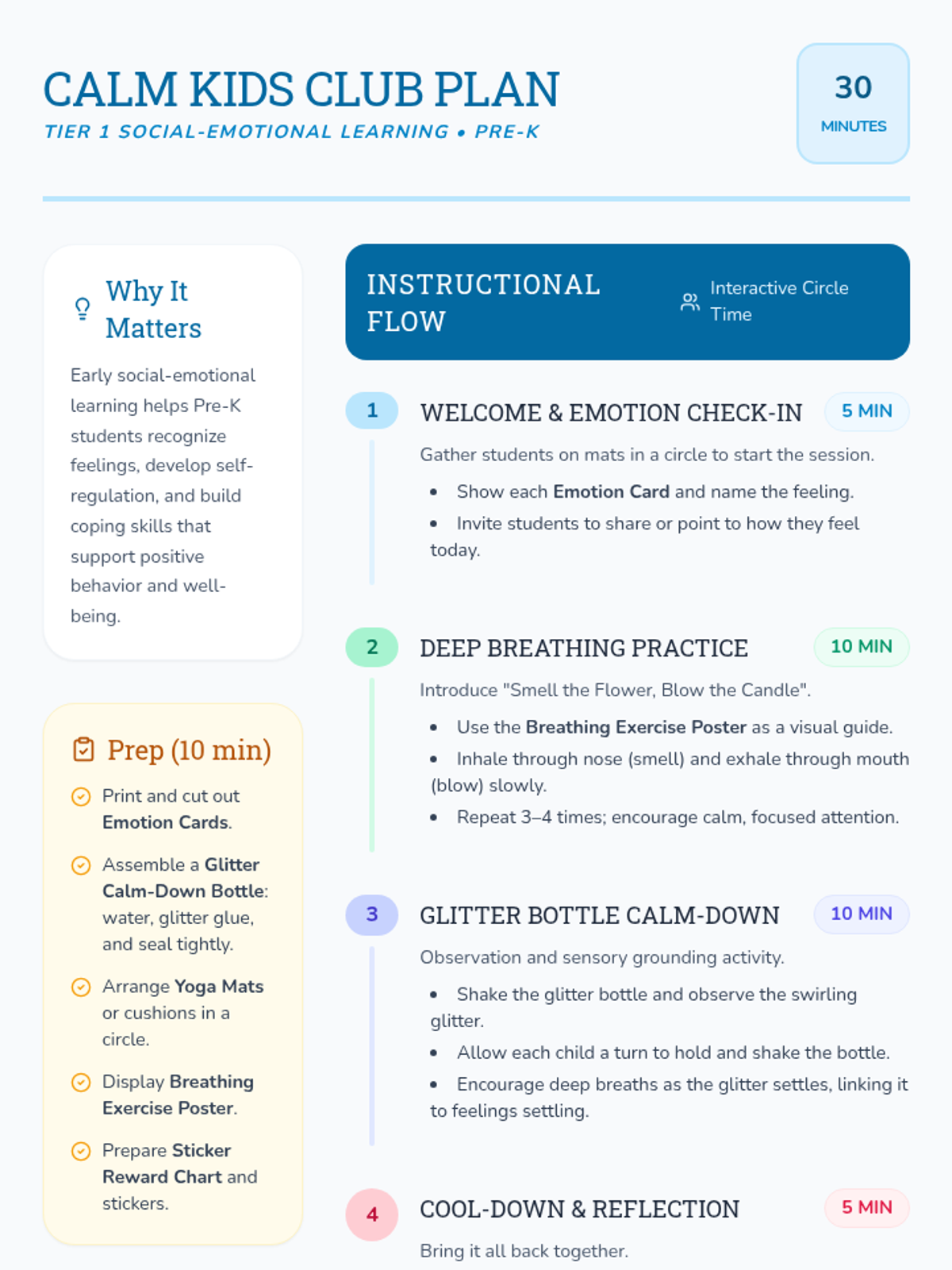 A 30-minute Pre-K lesson where students explore emotions, learn simple stress management strategies, and practice calming techniques like deep breathing and glitter bottle observation.