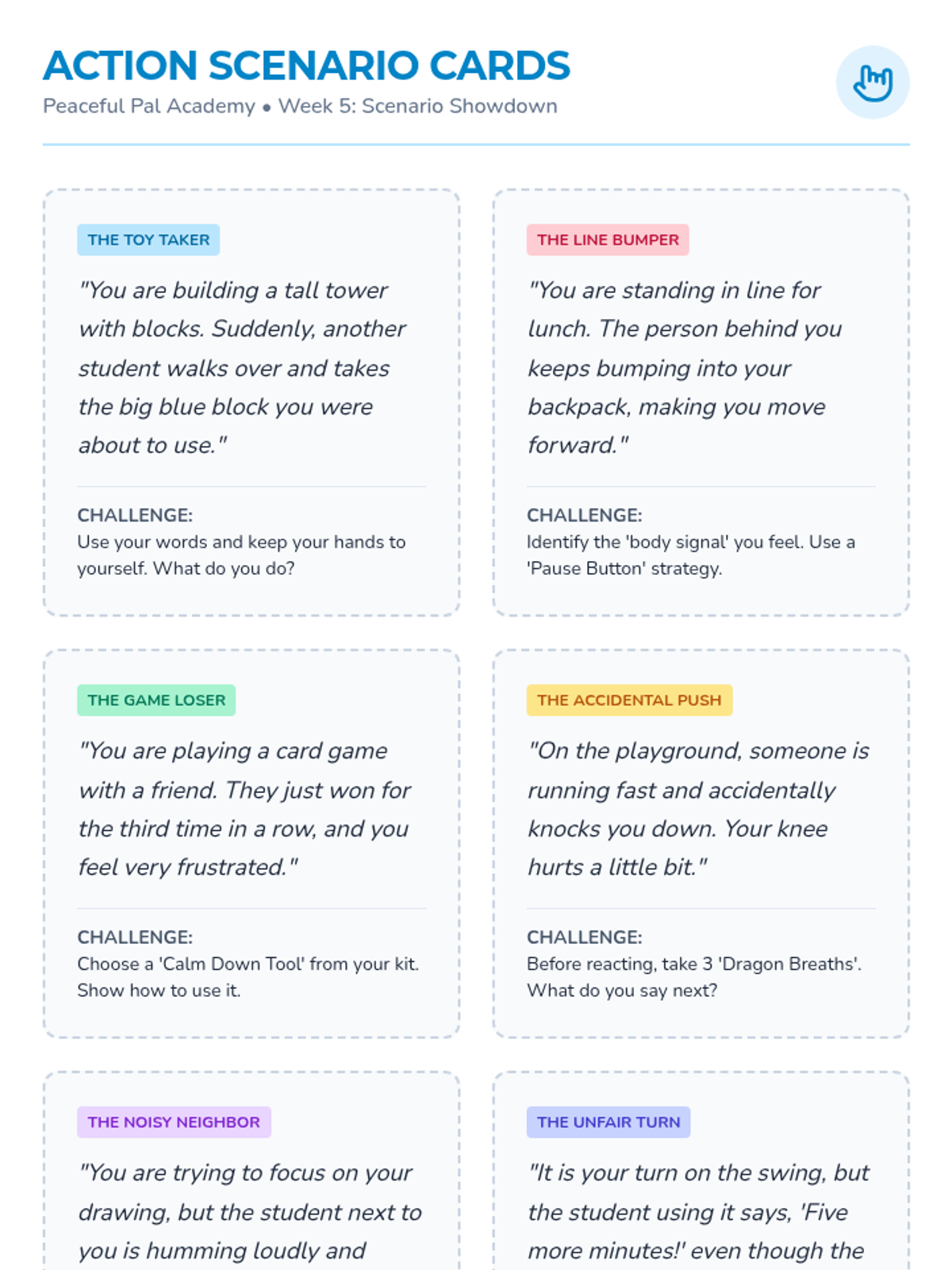 A focused lesson for early elementary students to identify triggers for physical aggression and practice calming strategies like deep breathing and asking for help.