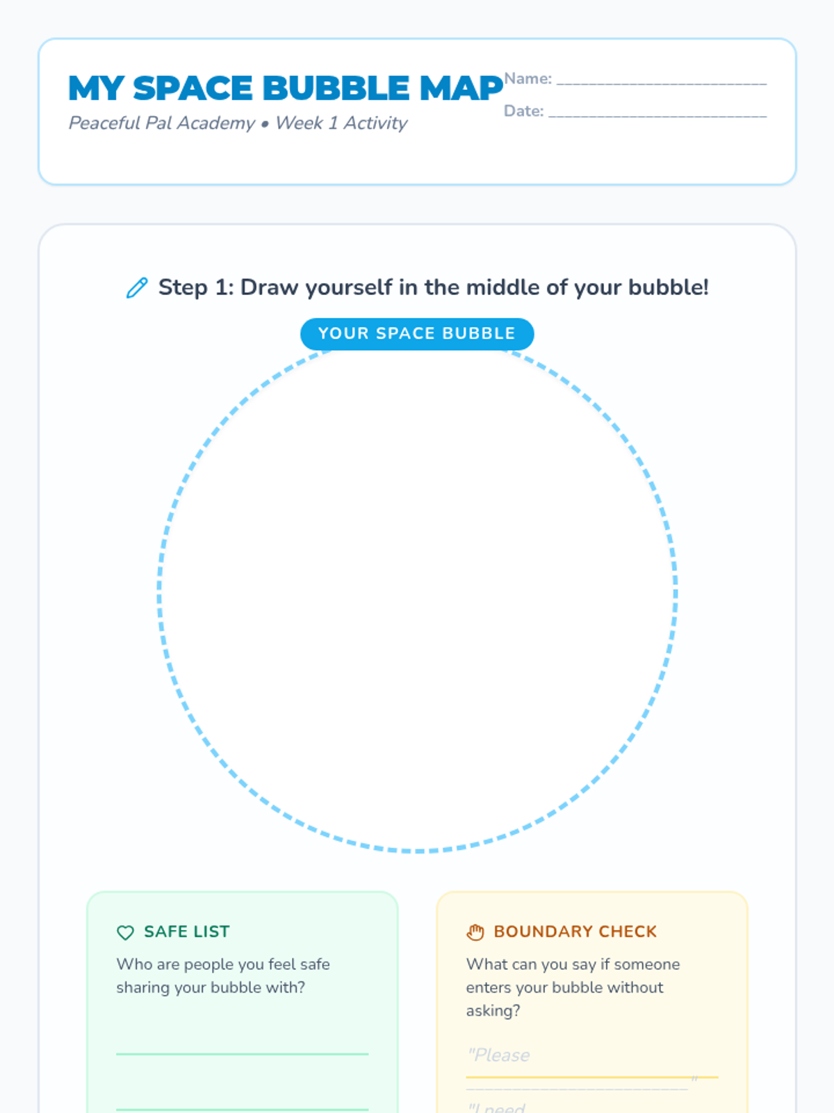 Students learn the concept of personal space and the 'Space Bubble' to understand where their body ends and others' begin.