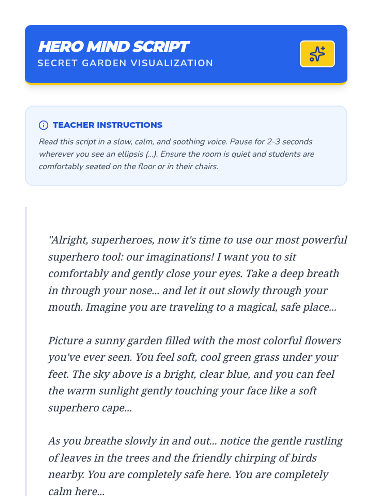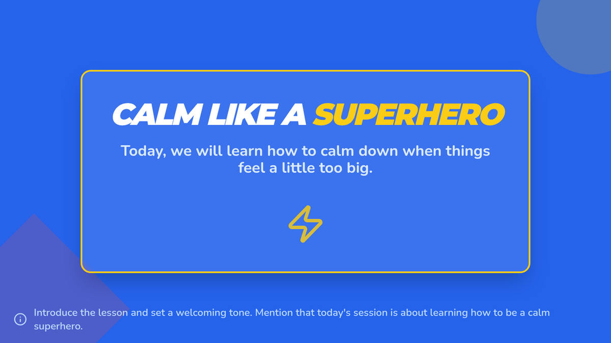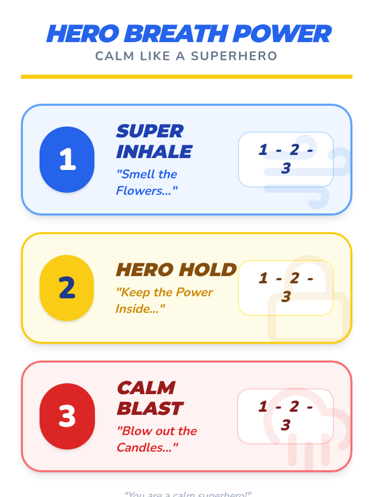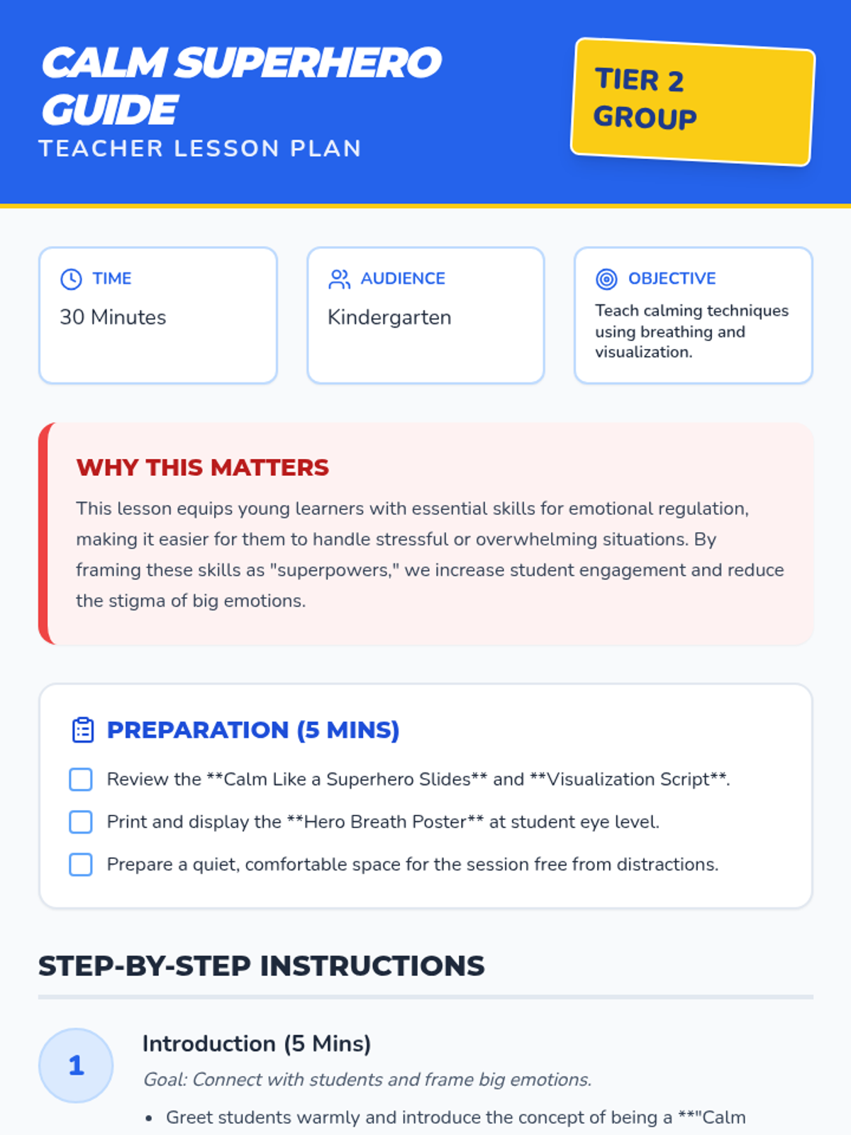 A Tier 2 group lesson for kindergarten students to learn emotional regulation through breathing and visualization, using a superhero theme to make skills engaging and memorable.