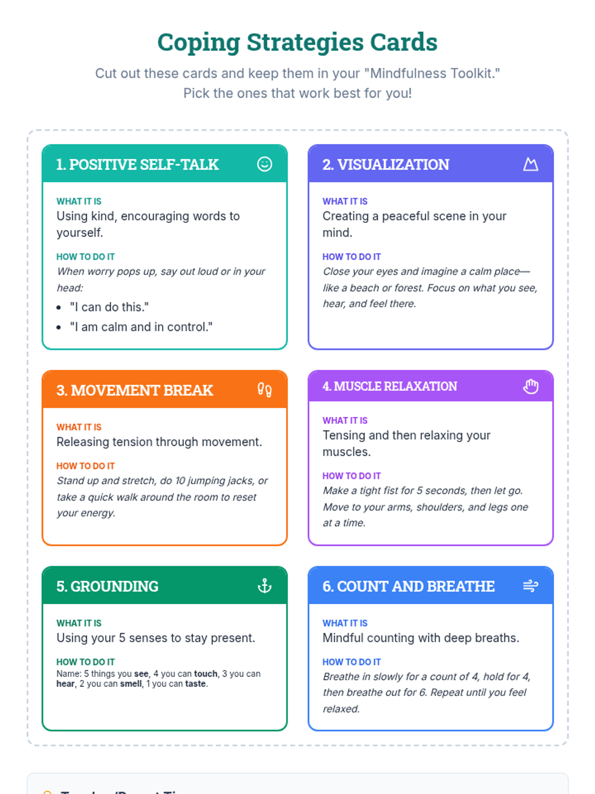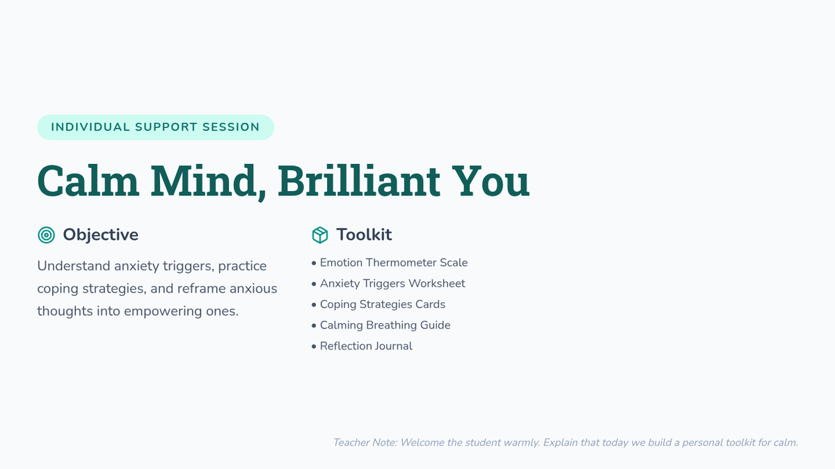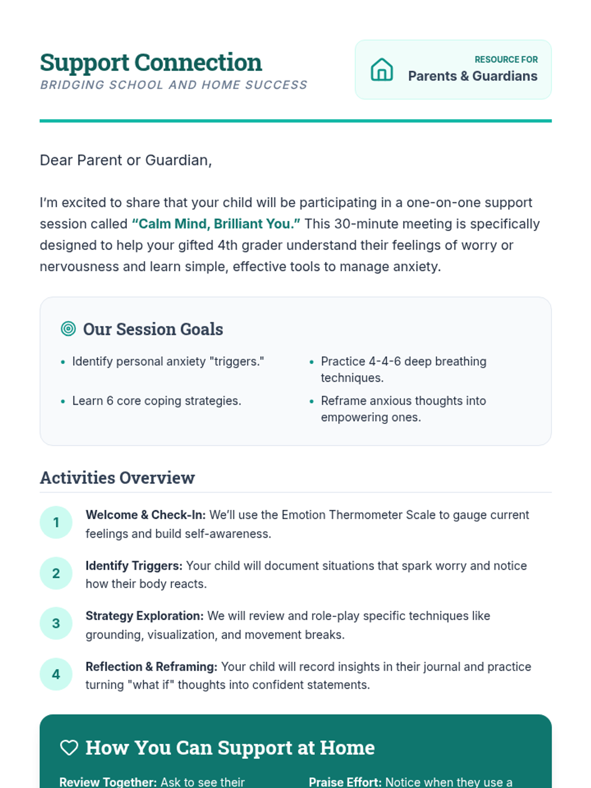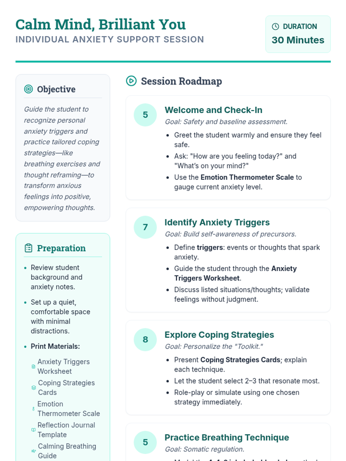 A one-on-one 30-minute session for 4th-grade gifted students to build self-awareness and anxiety-management skills. Students identify triggers, explore coping strategies, and practice reframing thoughts to boost emotional resilience and academic success.