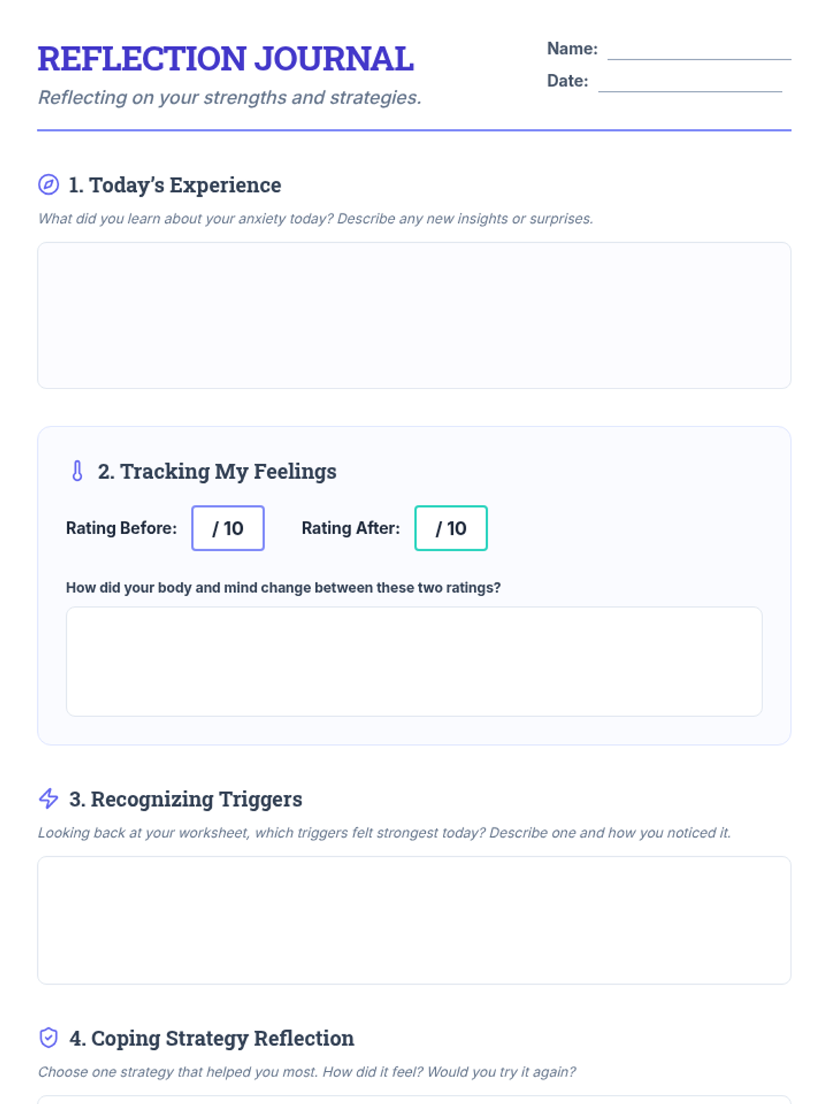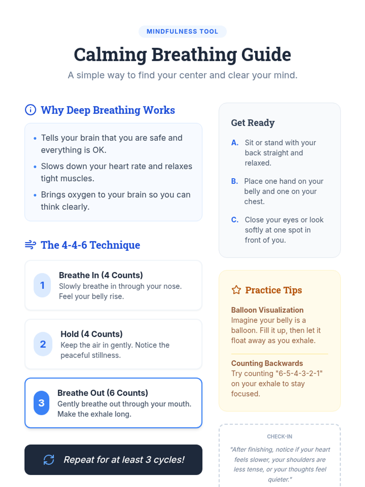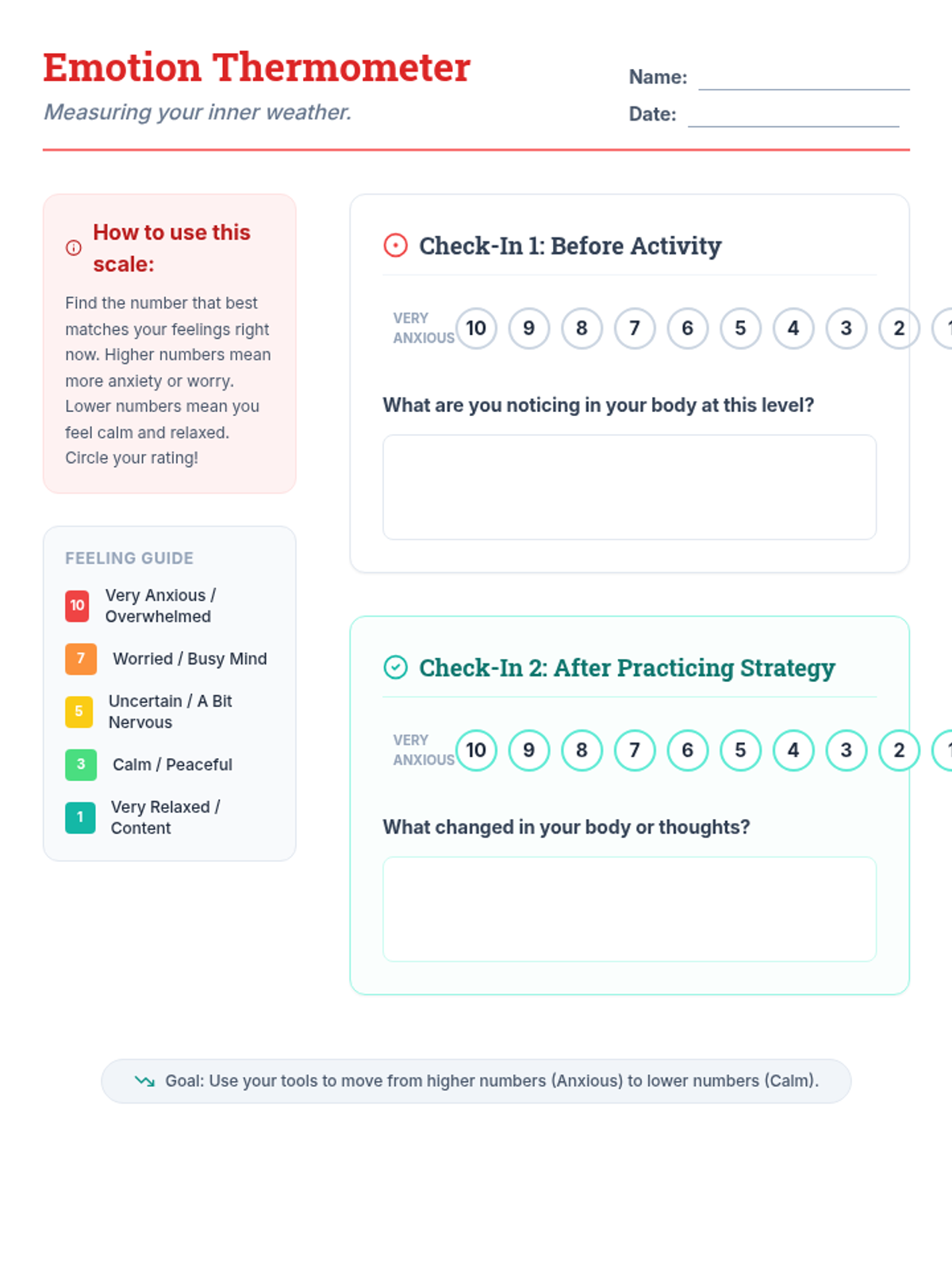 A one-on-one 30-minute session for 4th-grade gifted students to build self-awareness and anxiety-management skills. Students identify triggers, explore coping strategies, and practice reframing thoughts to boost emotional resilience and academic success.