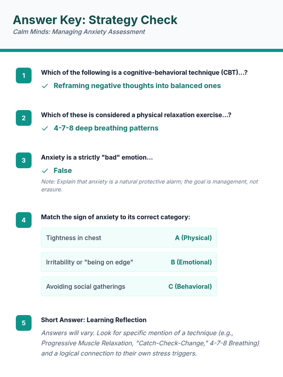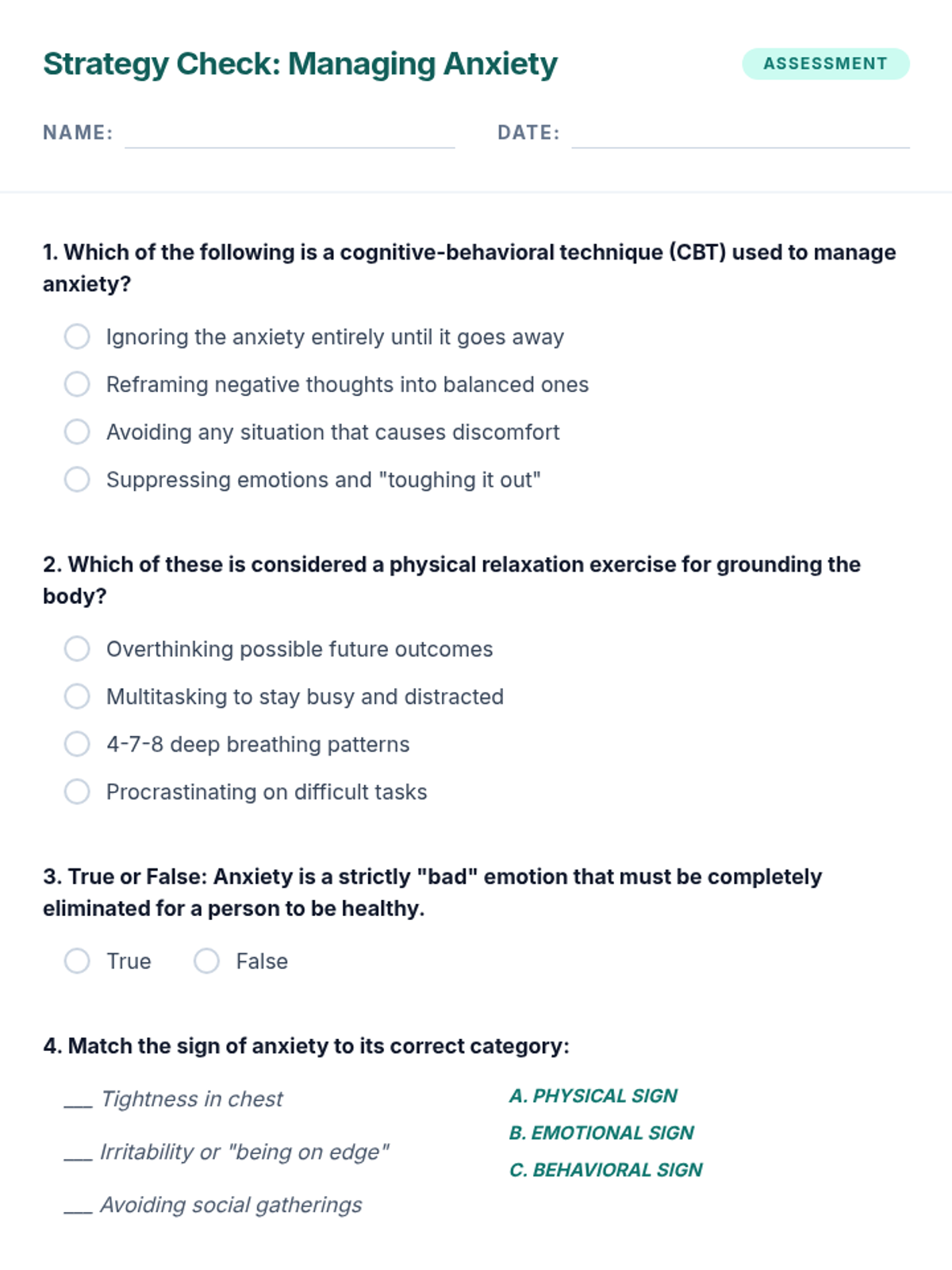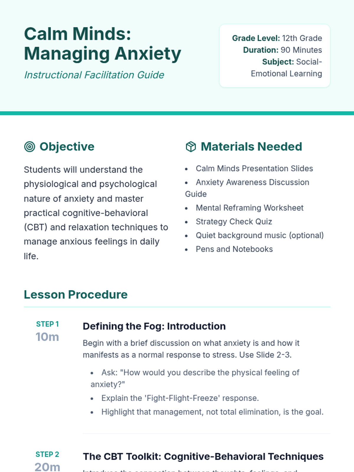 This lesson focuses on understanding and managing anxiety through cognitive-behavioral techniques and relaxation exercises for 12th-grade students. Students will learn practical strategies to cope with anxious feelings, which is crucial for their mental well-being and academic success.