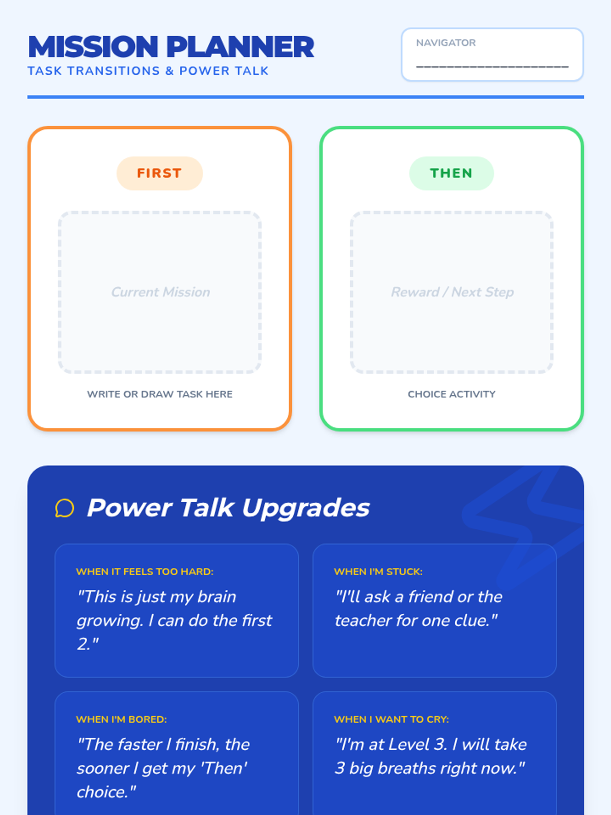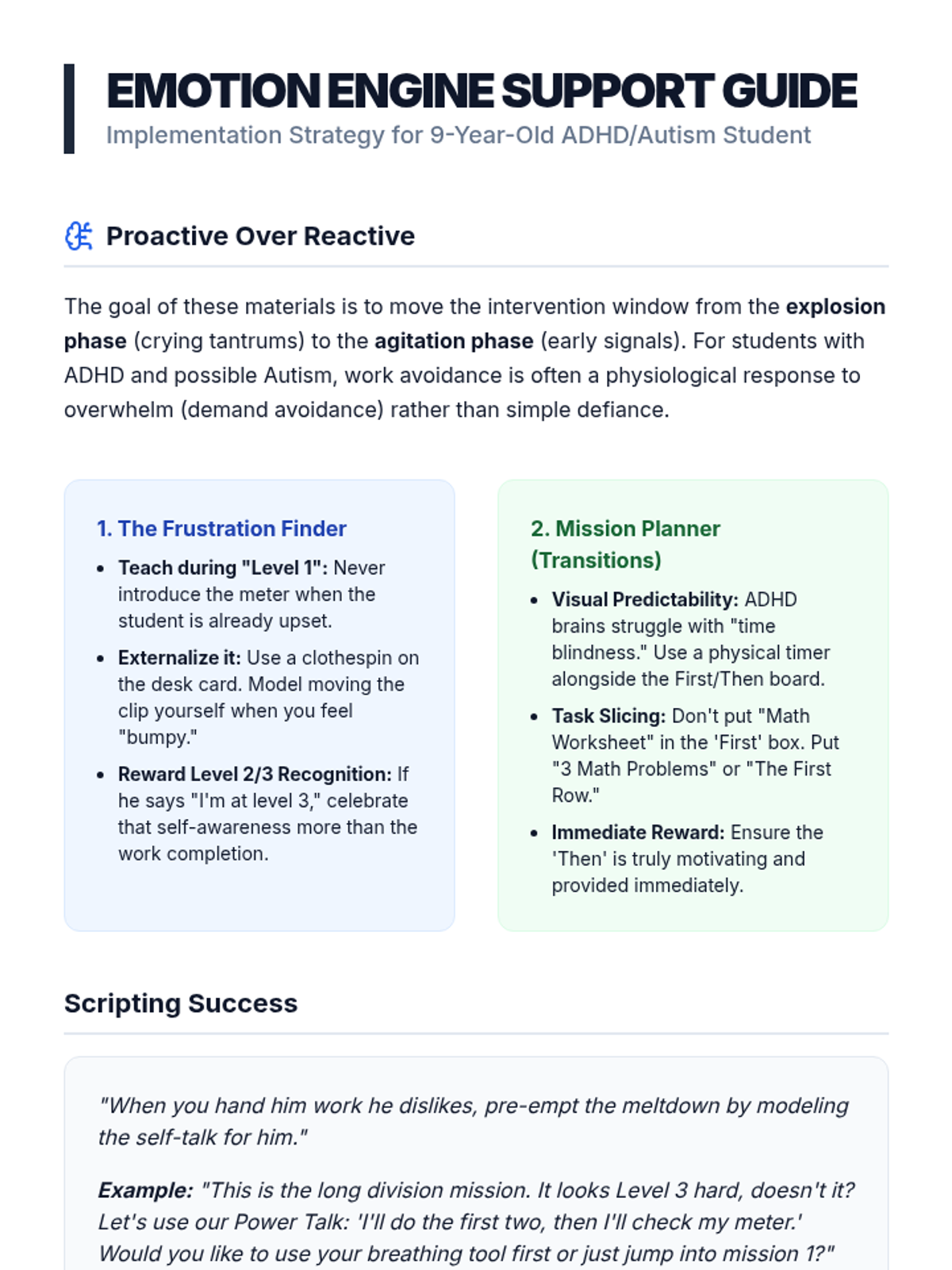 A behavioral and functional lesson designed for a 2nd-grade student with Autism and ADHD to master the 'Launch Sequence' of transitioning from preferred activities to academic tasks. It focuses on visual schedules, clear 'First-Then' contingencies, and a specific 3-step 'Ignition' process to overcome task initiation hurdles.
