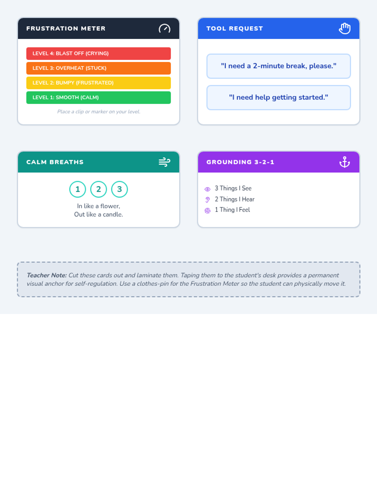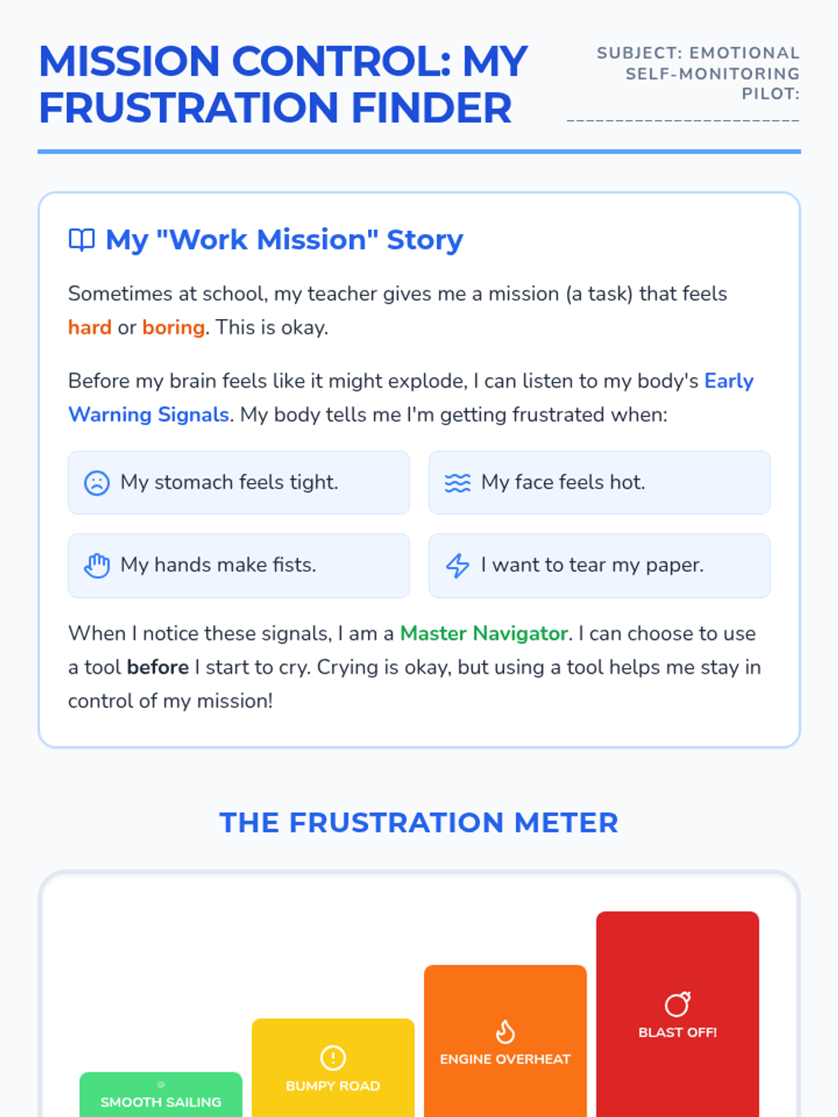 A set of visual supports and social stories designed to help a 9-year-old student with ADHD/Autism recognize frustration, use positive self-talk, and manage transitions more effectively.