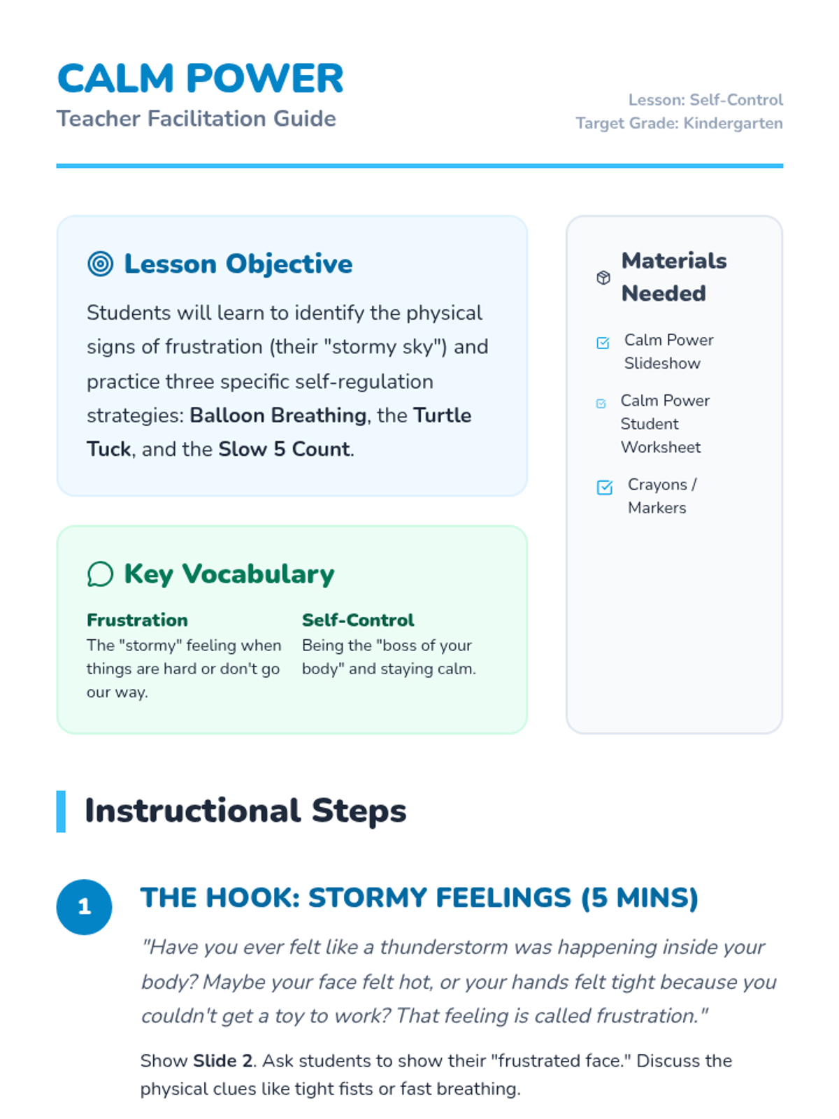 A comprehensive Social-Emotional Learning lesson for kindergarteners focused on identifying frustration and using simple strategies like belly breathing and the 'turtle tuck' to regain self-control.