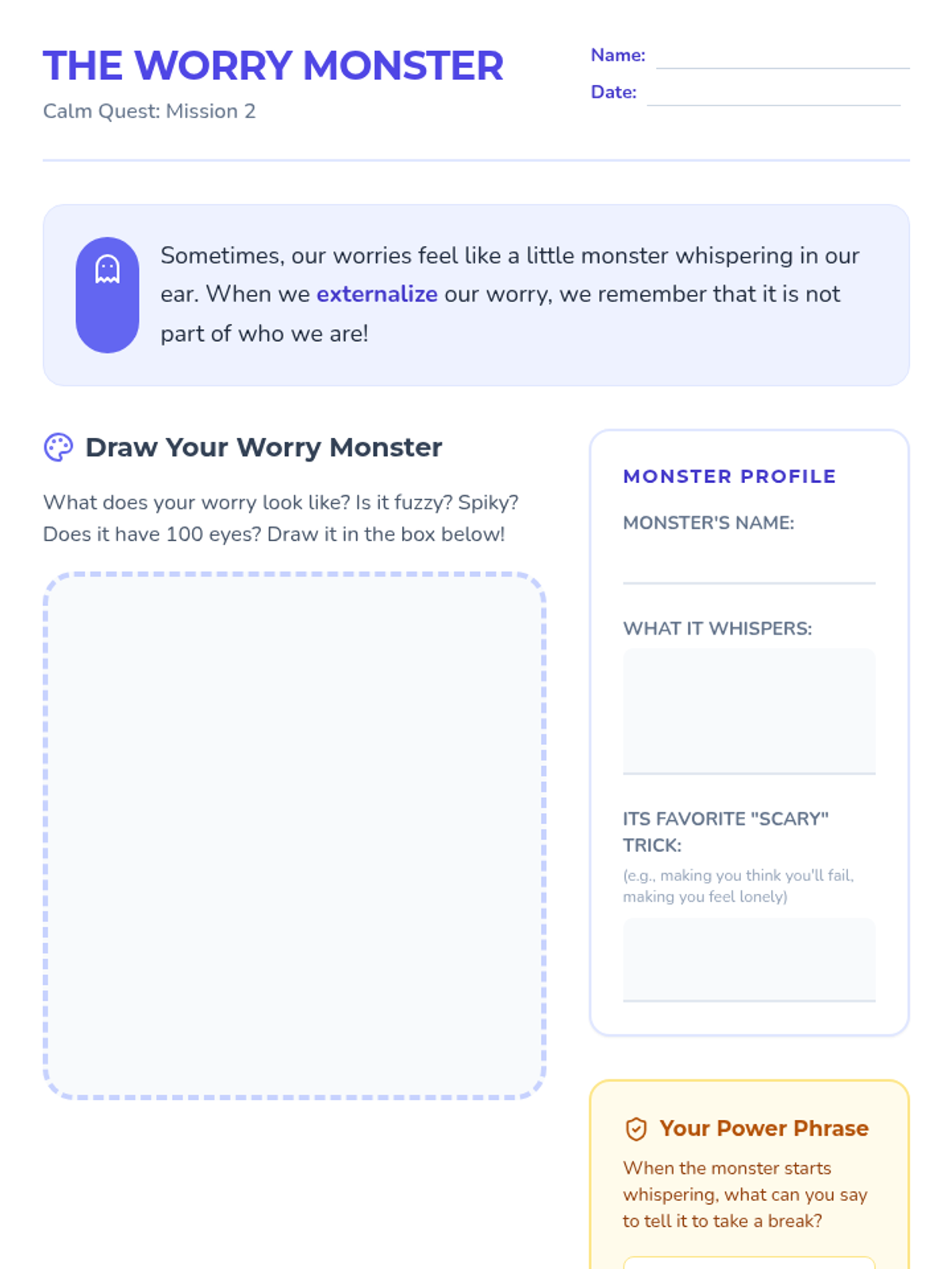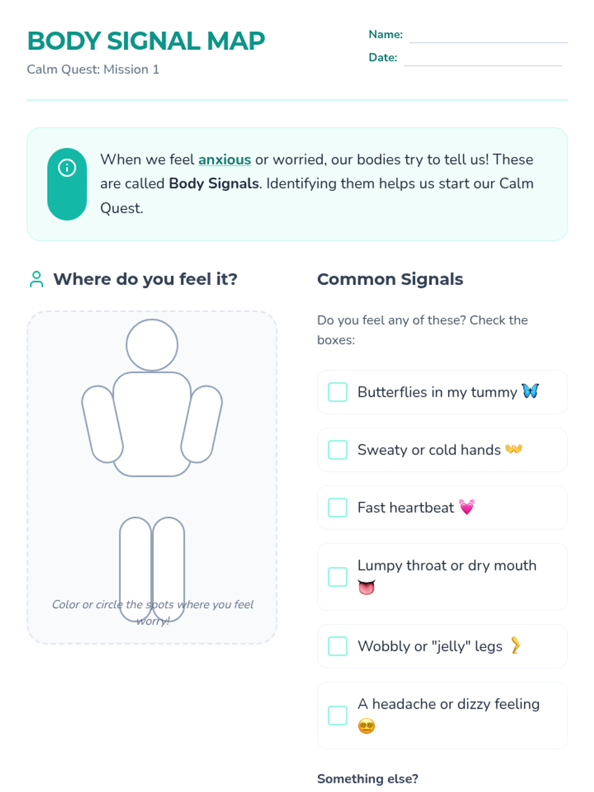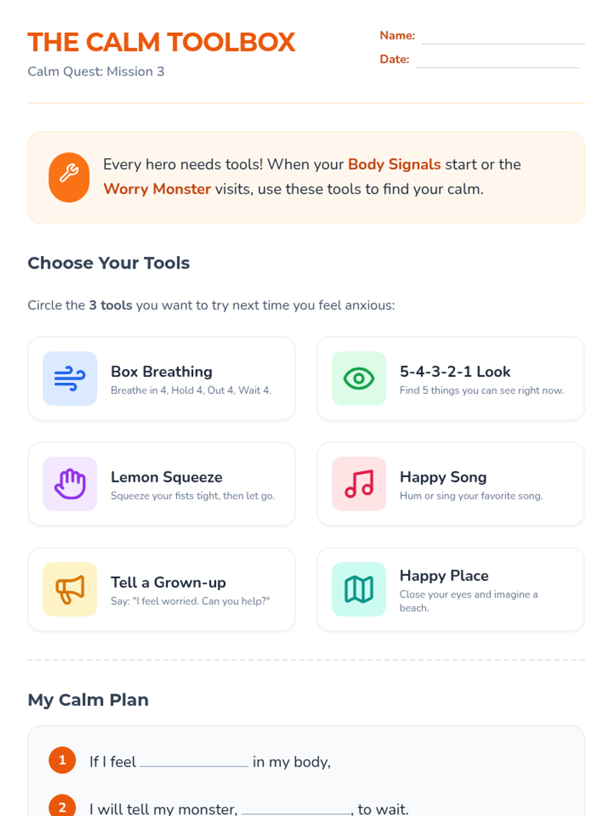 A set of interactive worksheets designed for second graders to identify physical anxiety signals, externalize their worries, and build a personalized toolkit of coping strategies.