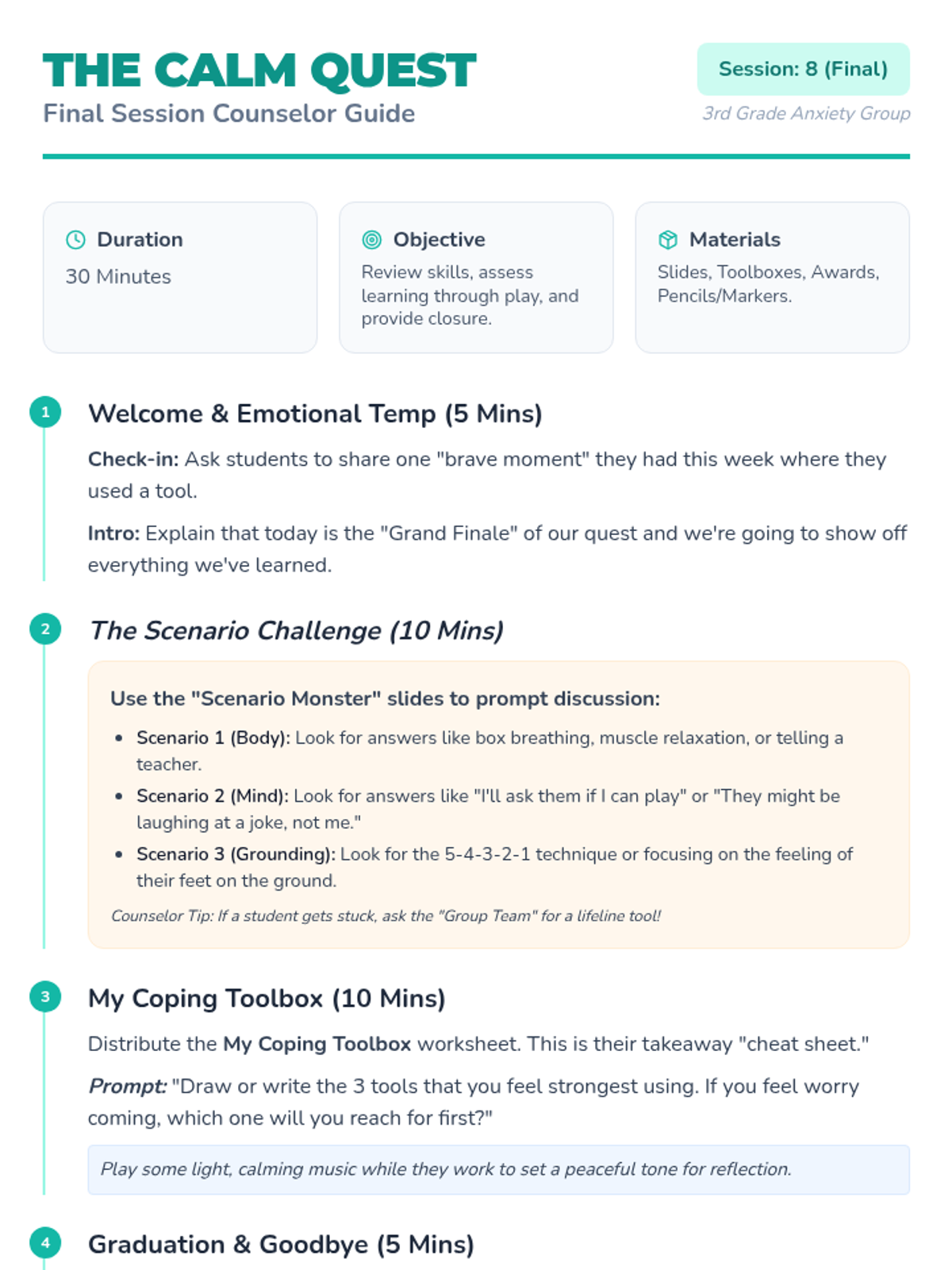 A final 30-minute counseling group session for 3rd graders focused on reviewing anxiety coping skills, celebrating progress, and providing closure. The session uses an 'Adventure' theme to make the assessment of skills engaging and fun.