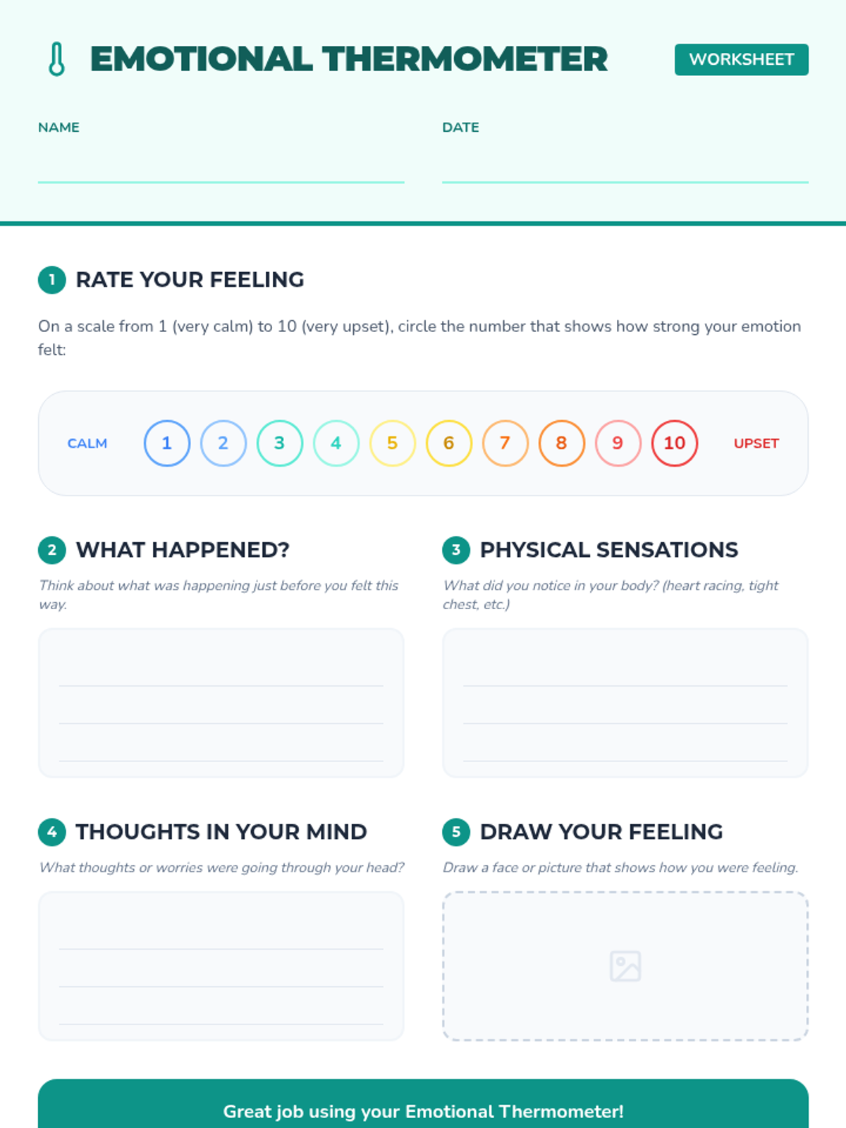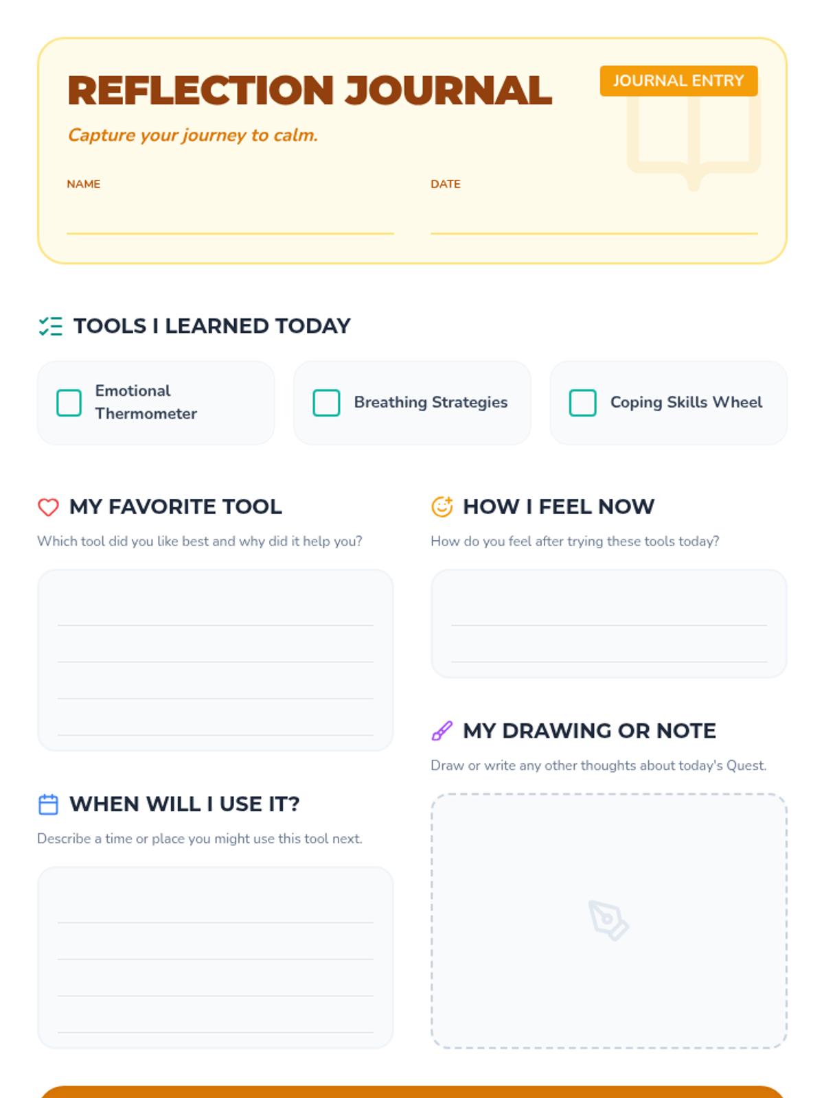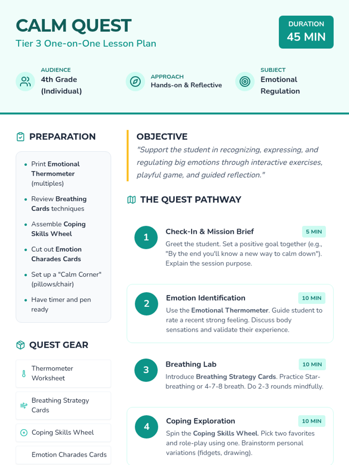 A 45-minute Tier 3 one-on-one lesson for a 9-year-old boy to develop emotional regulation through hands-on exercises, breathing techniques, and guided reflection.