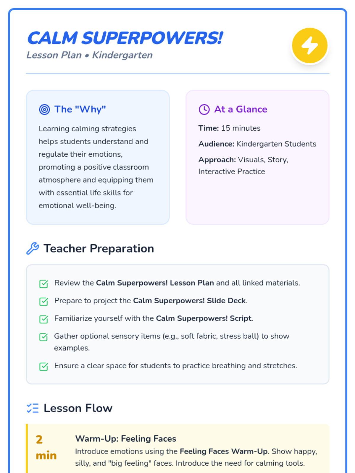 A 15-minute Kindergarten lesson introducing simple calming strategies like belly breathing and the starfish stretch to help students manage big emotions.