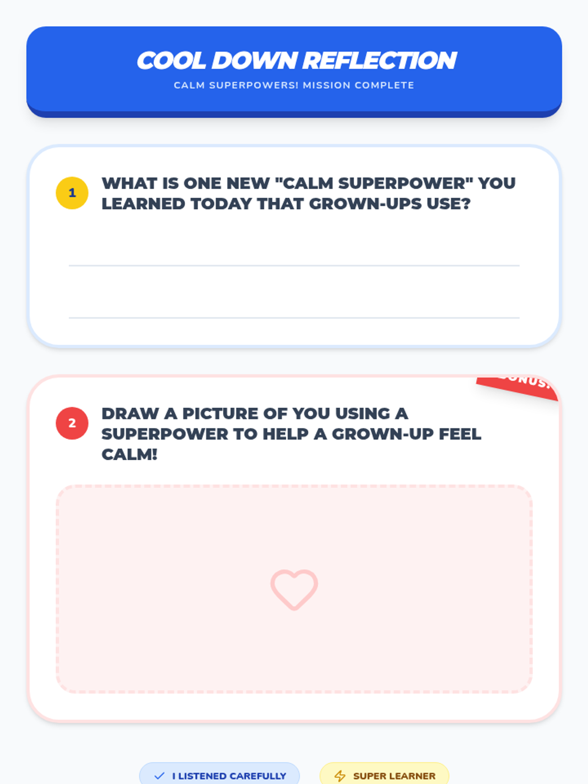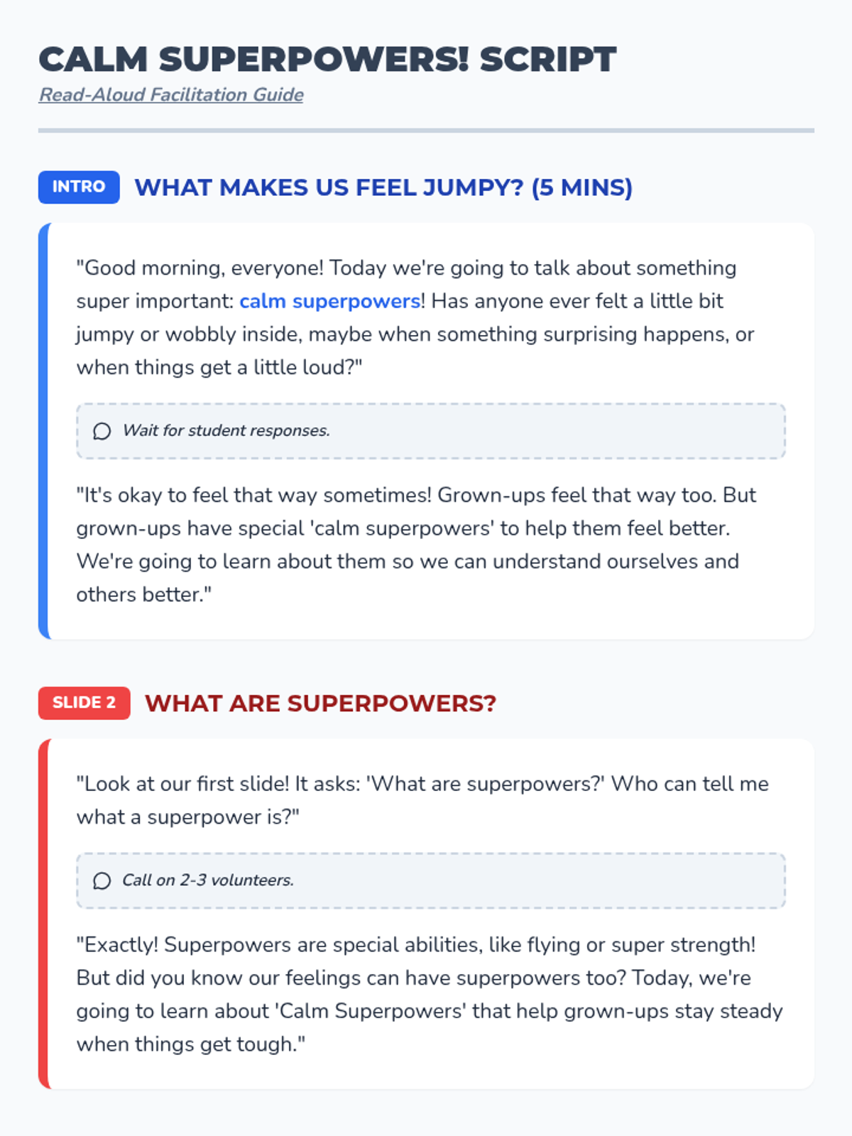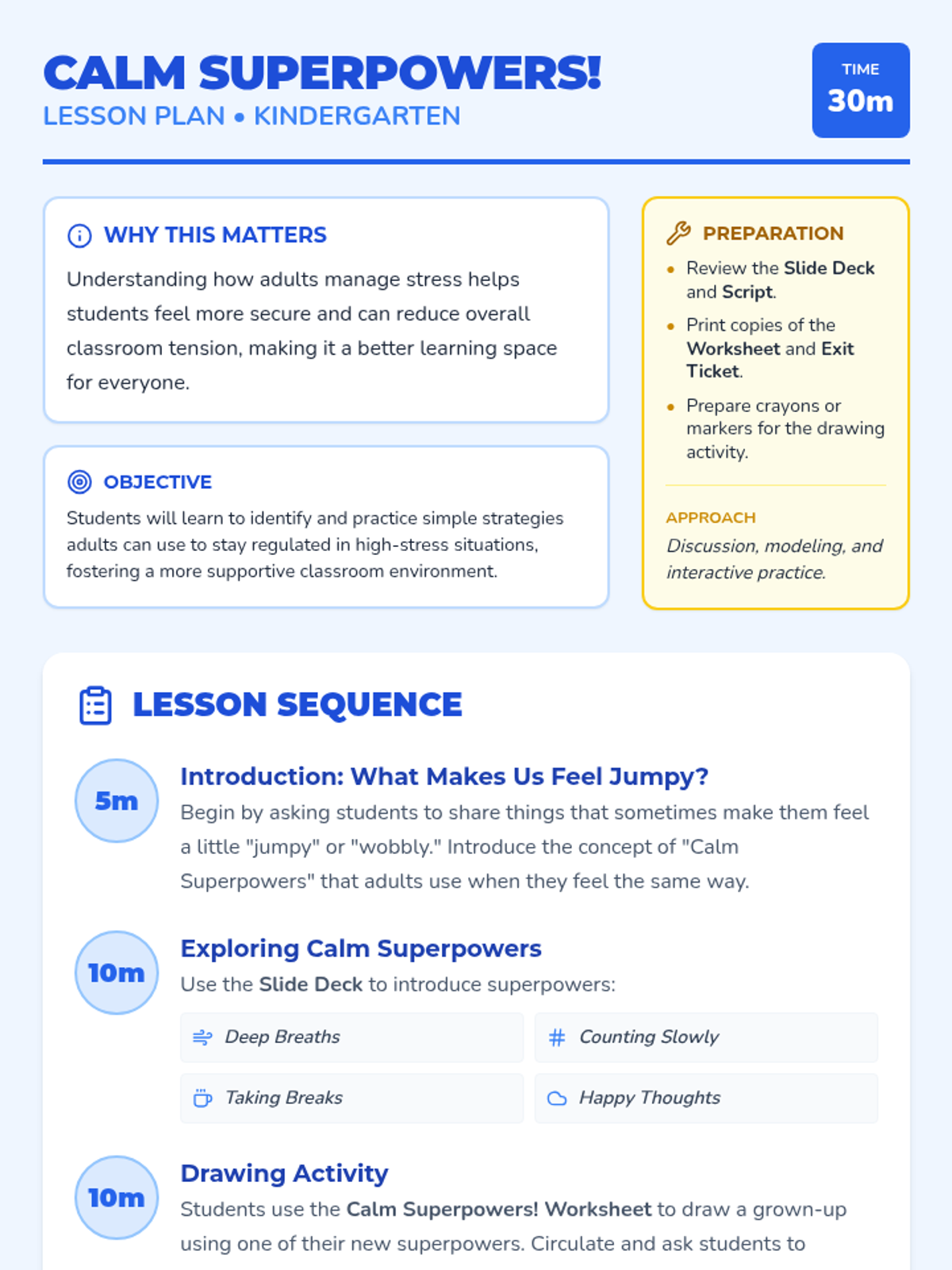 A 30-minute Tier 1 Kindergarten lesson that introduces the concept of 'calm superpowers'—strategies adults use to stay regulated—to help students build empathy and support a calm classroom environment.