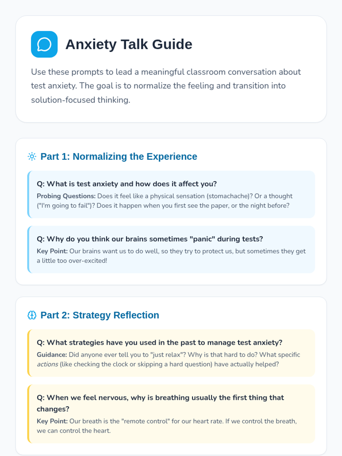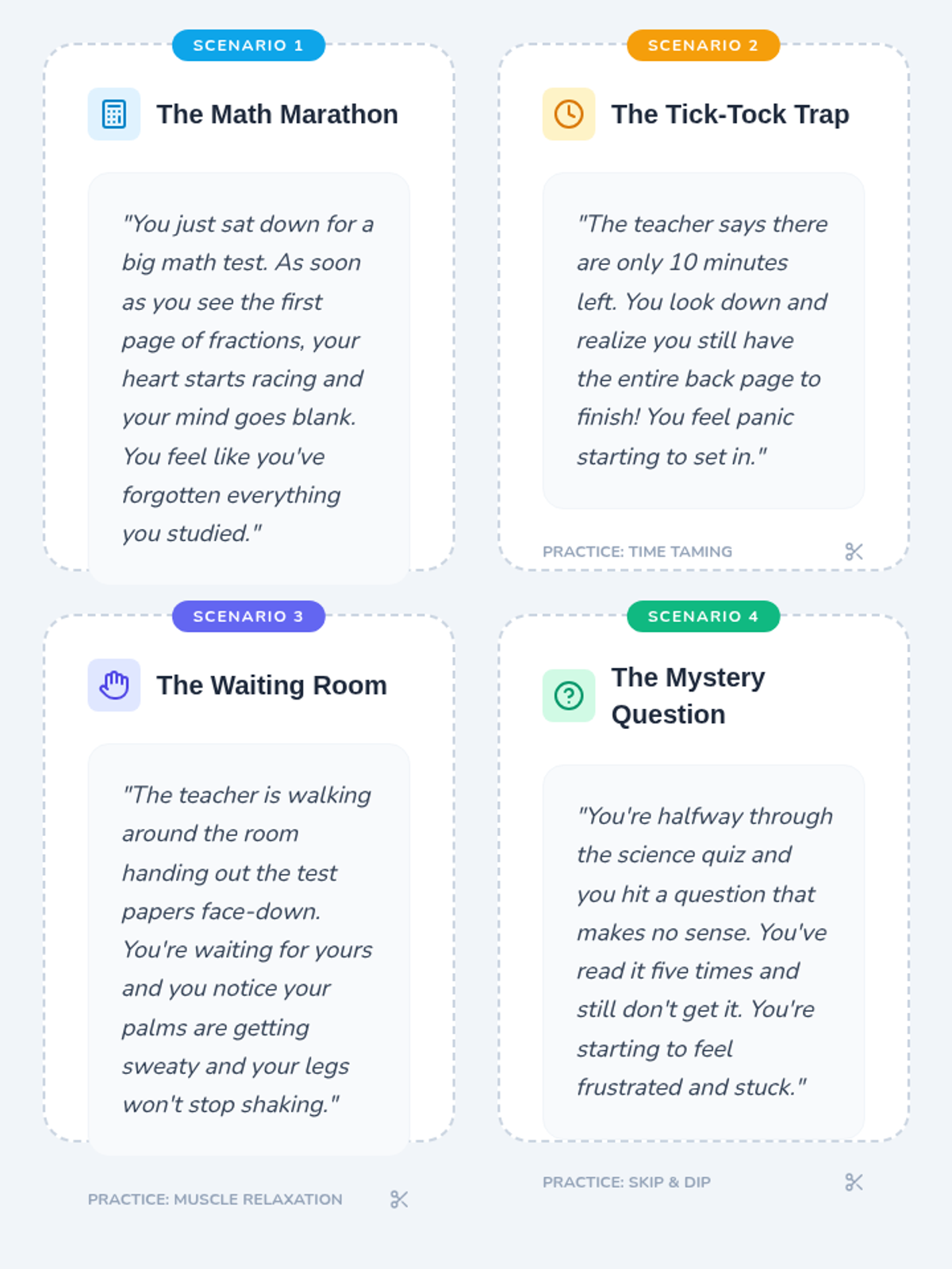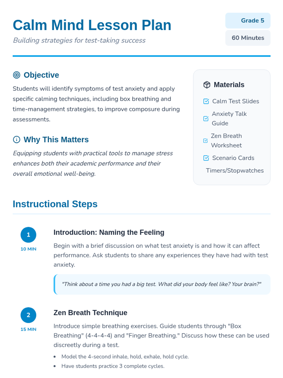 Students explore strategies to reduce test anxiety, including breathing exercises, time management, and role-playing scenarios to build confidence and composure during assessments.