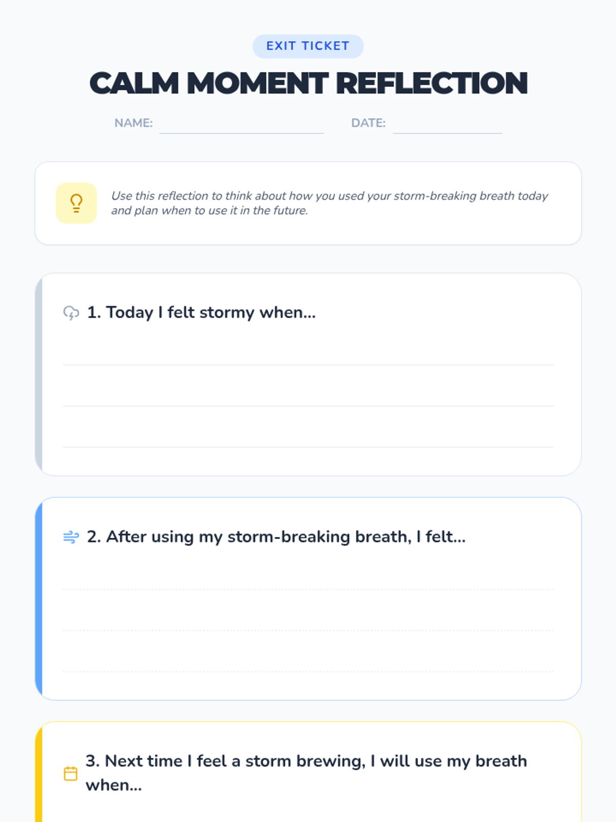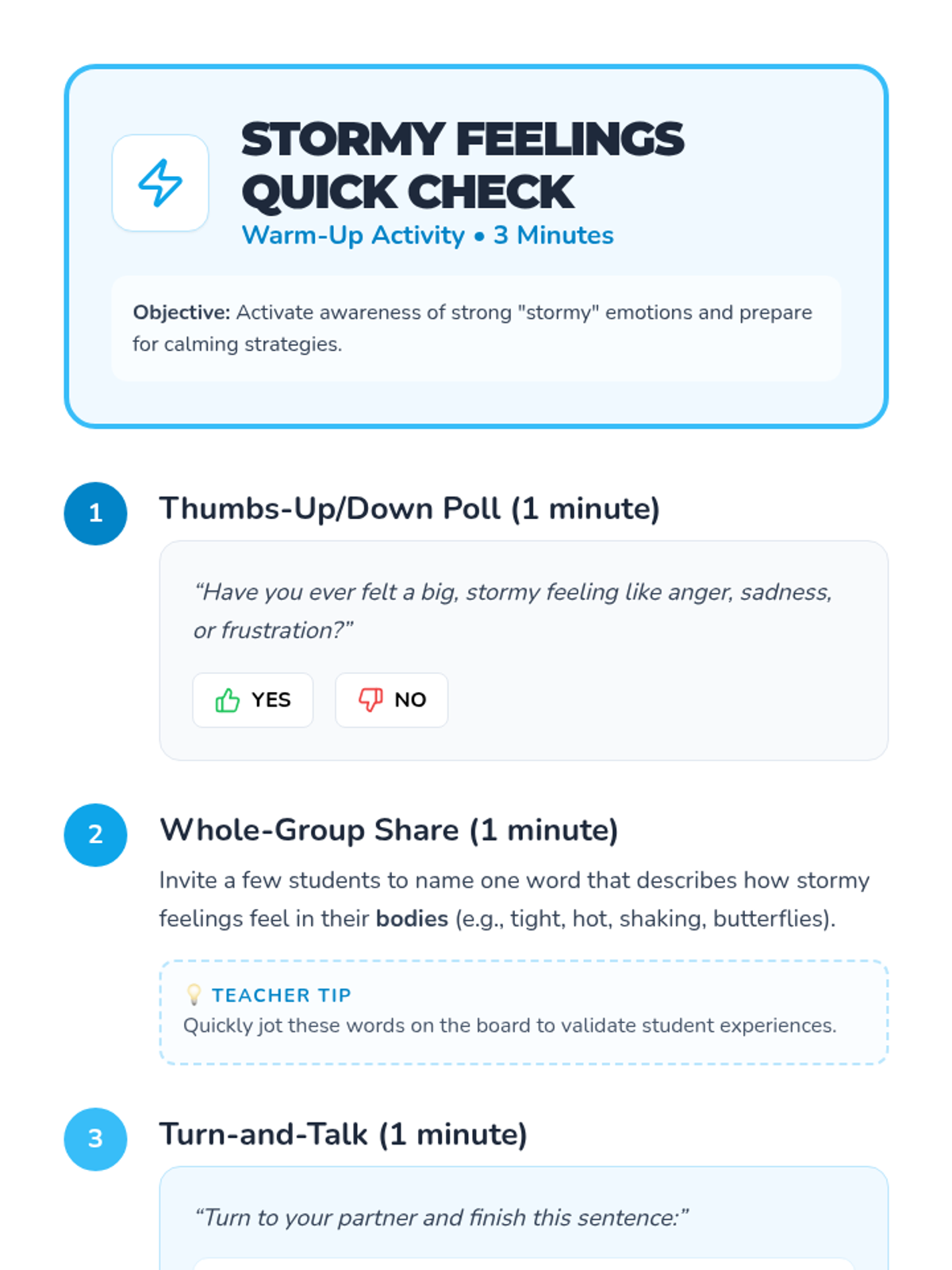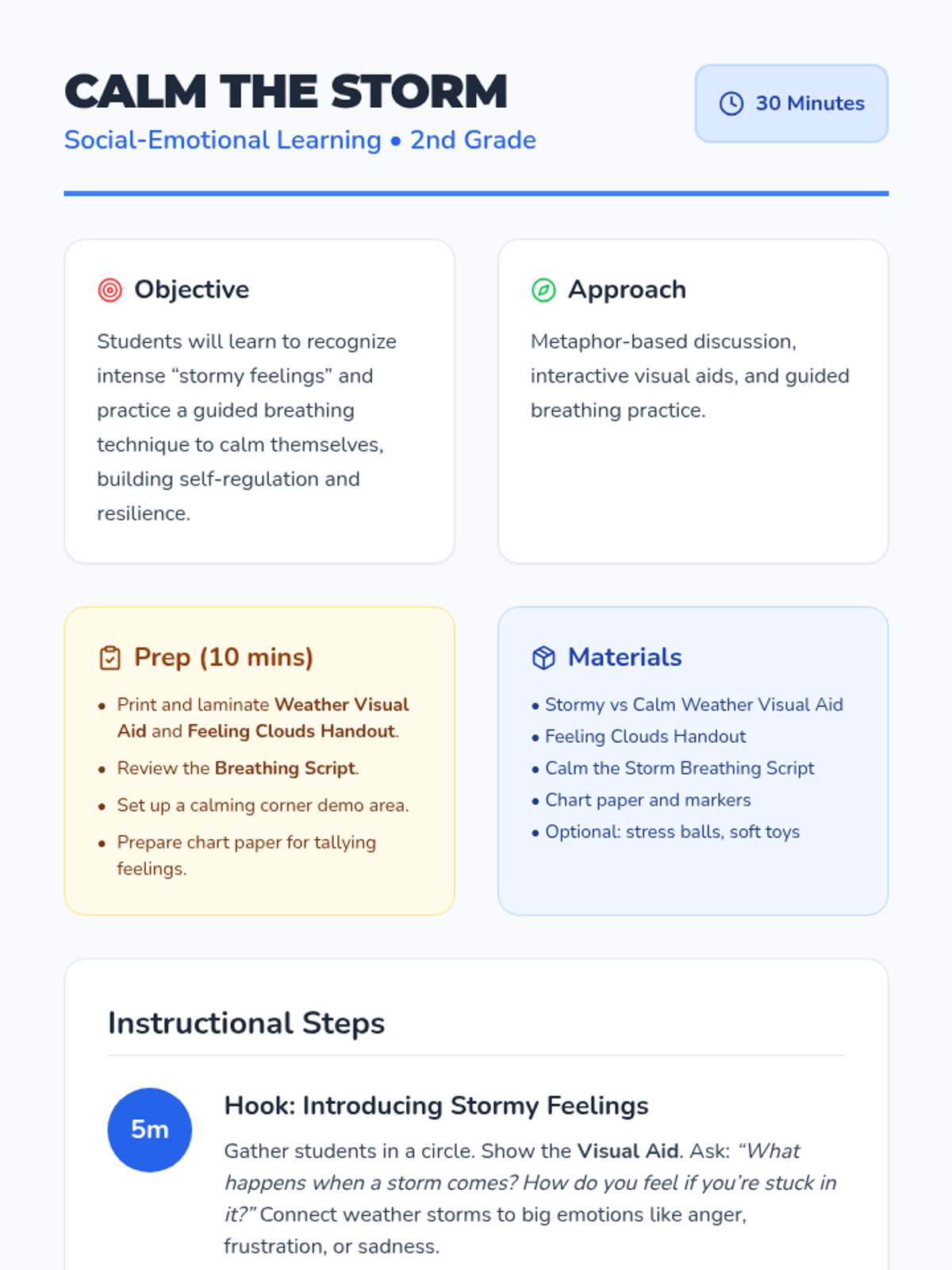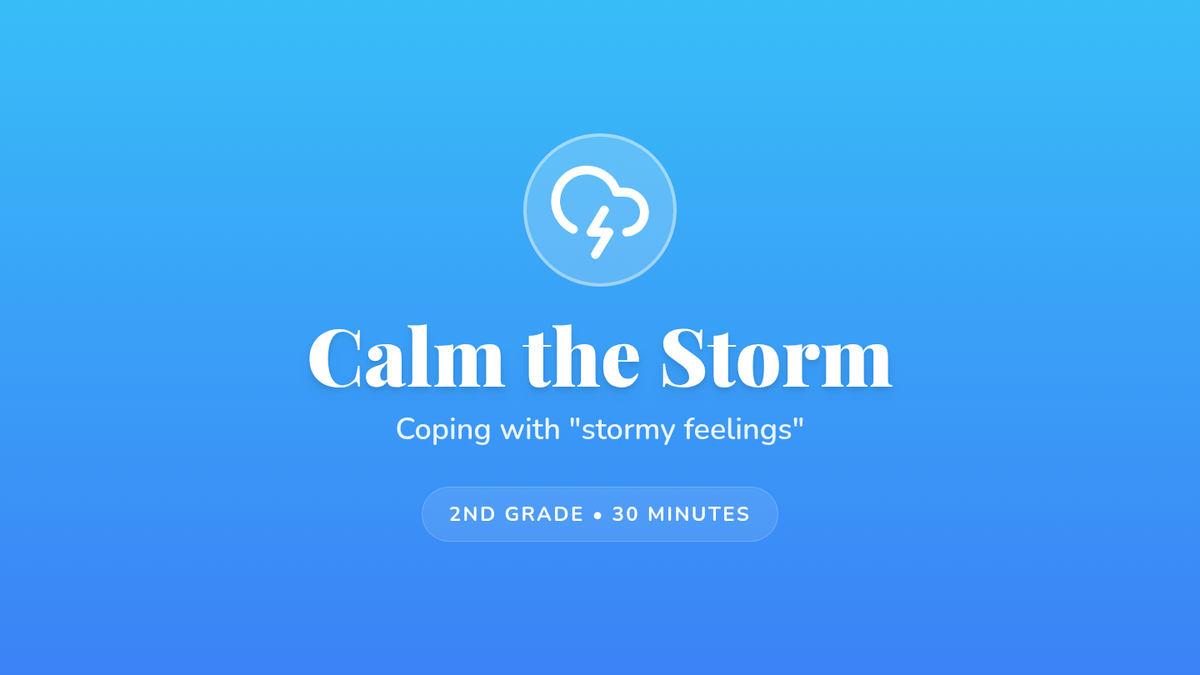 A 30-minute social-emotional lesson for 2nd graders to help them identify intense emotions using a weather metaphor and learn a 'storm-breaking' breathing technique for self-regulation.