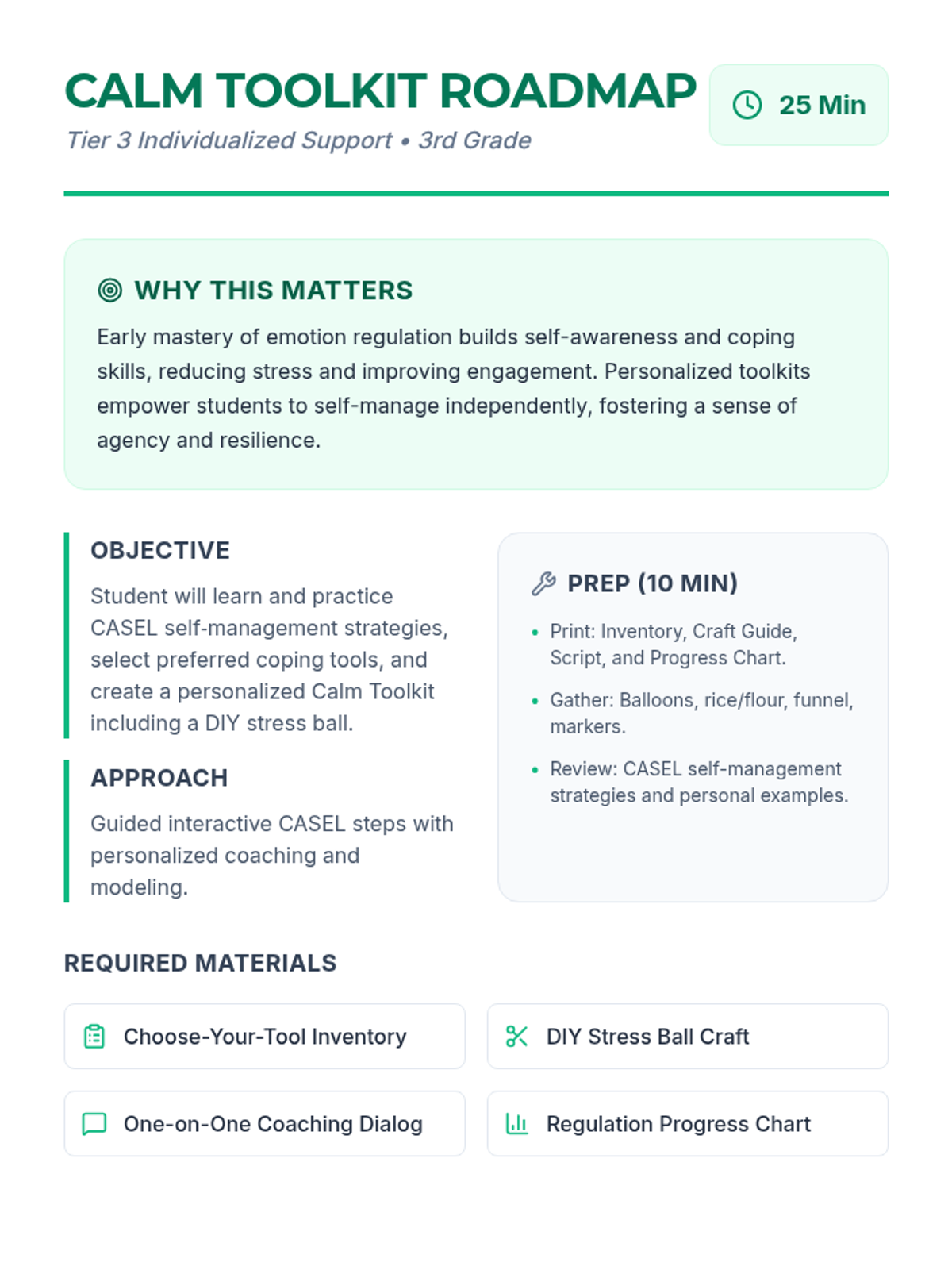 An individualized Tier 3 lesson for 3rd graders focusing on emotion regulation through the CASEL framework. Students develop self-awareness and self-management skills by creating a personalized Calm Toolkit and practicing coping strategies.