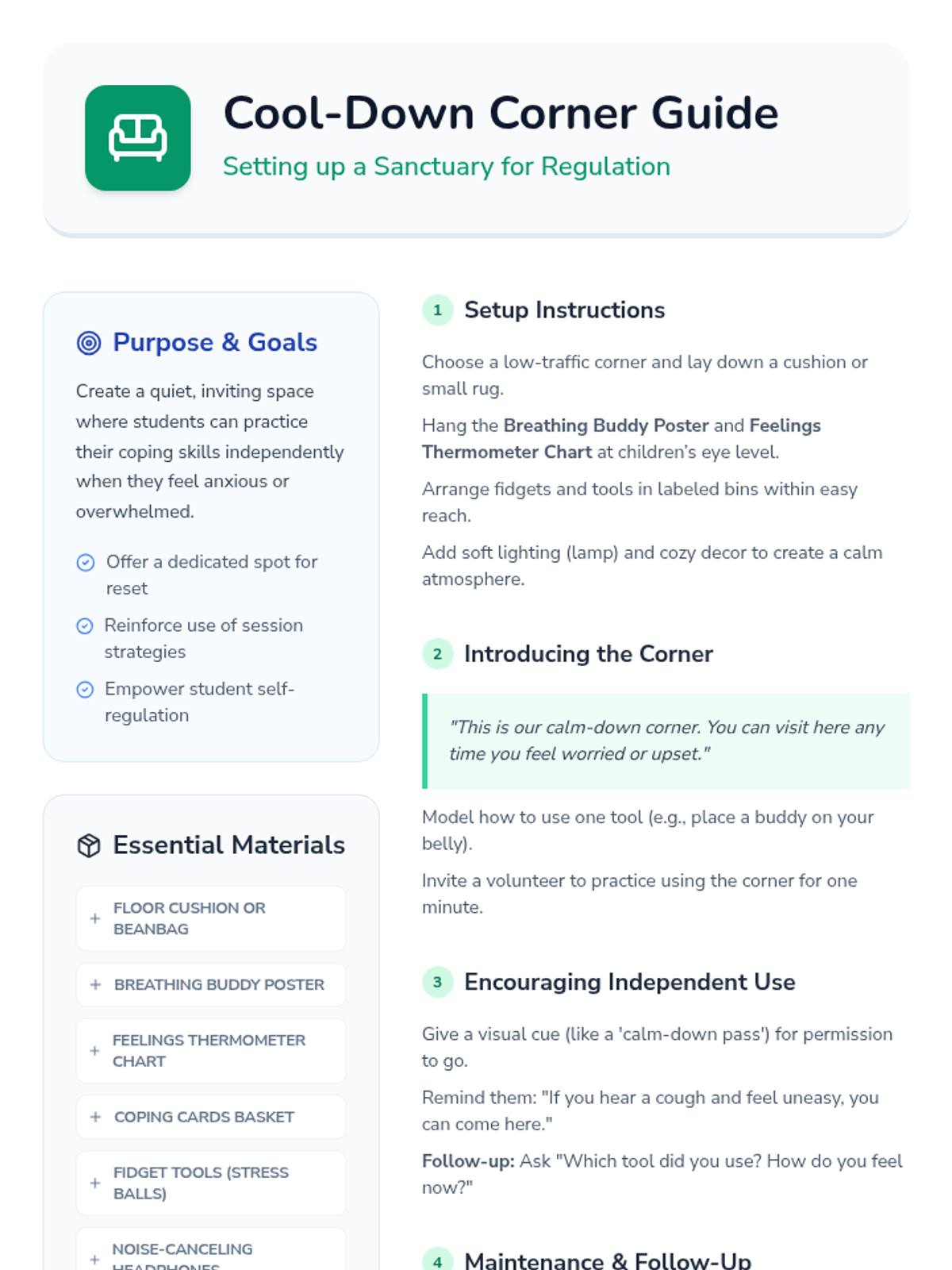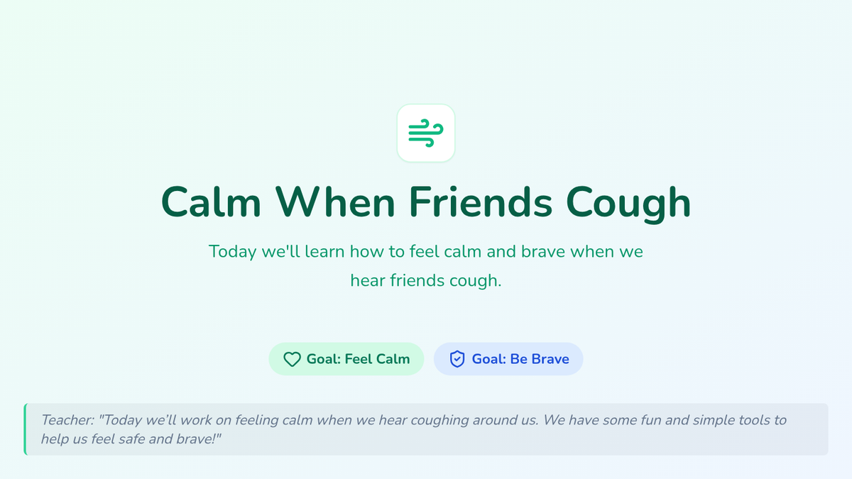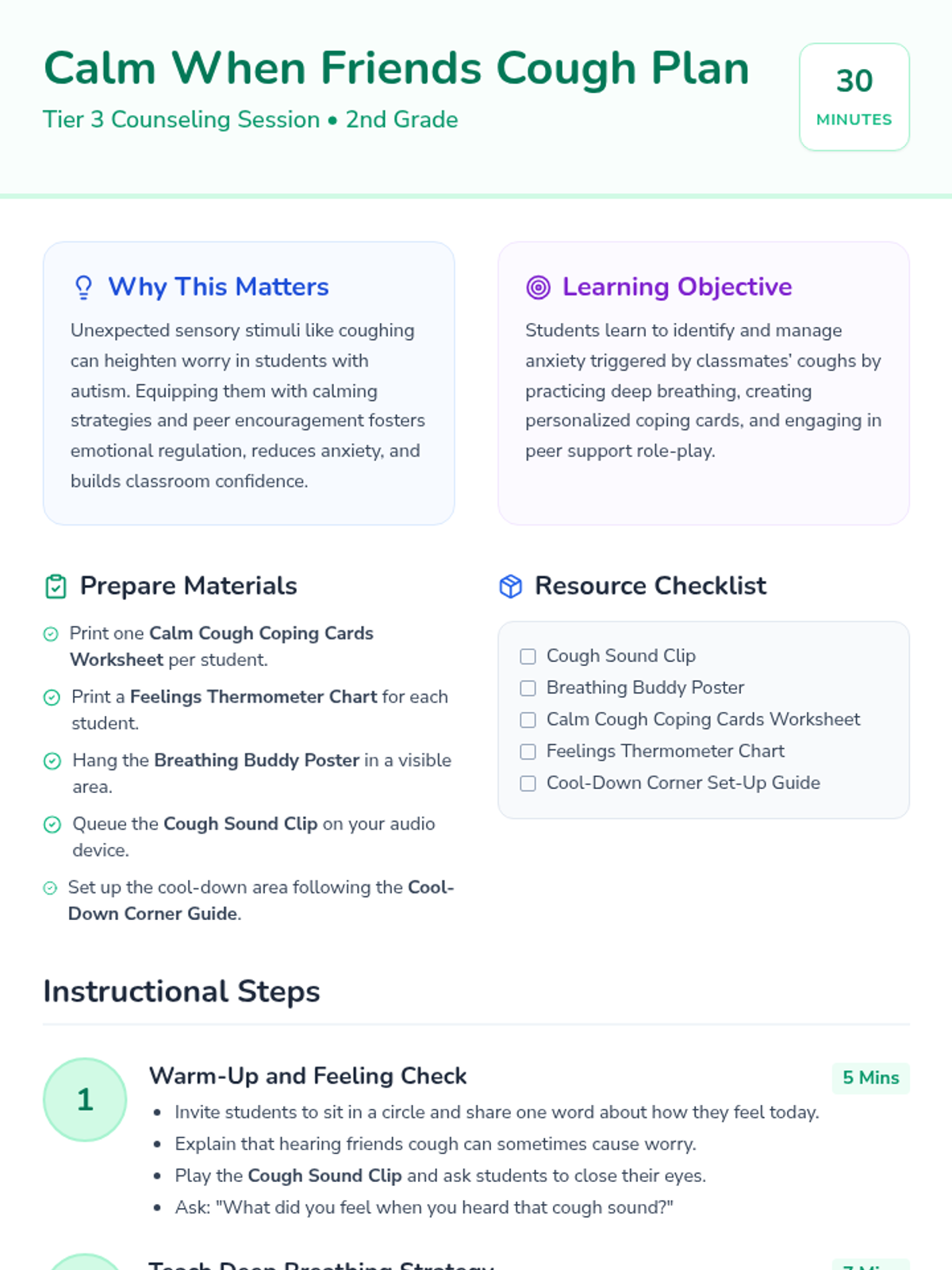A 30-minute Tier 3 counseling session for 2nd grade students with autism. The lesson teaches emotional regulation and coping strategies to manage anxiety triggered by sensory stimuli like coughing.