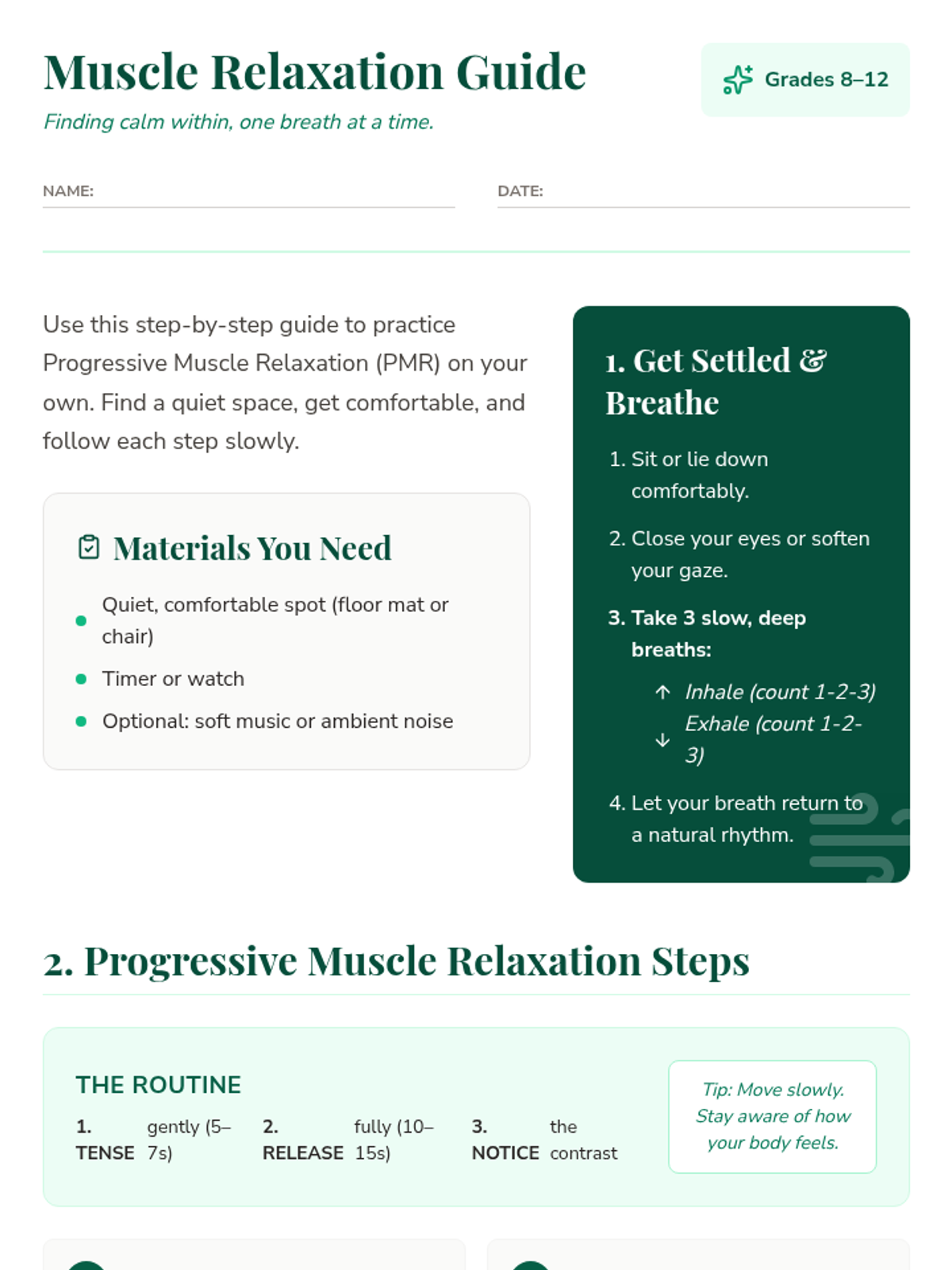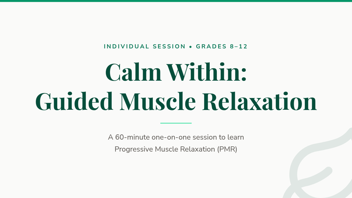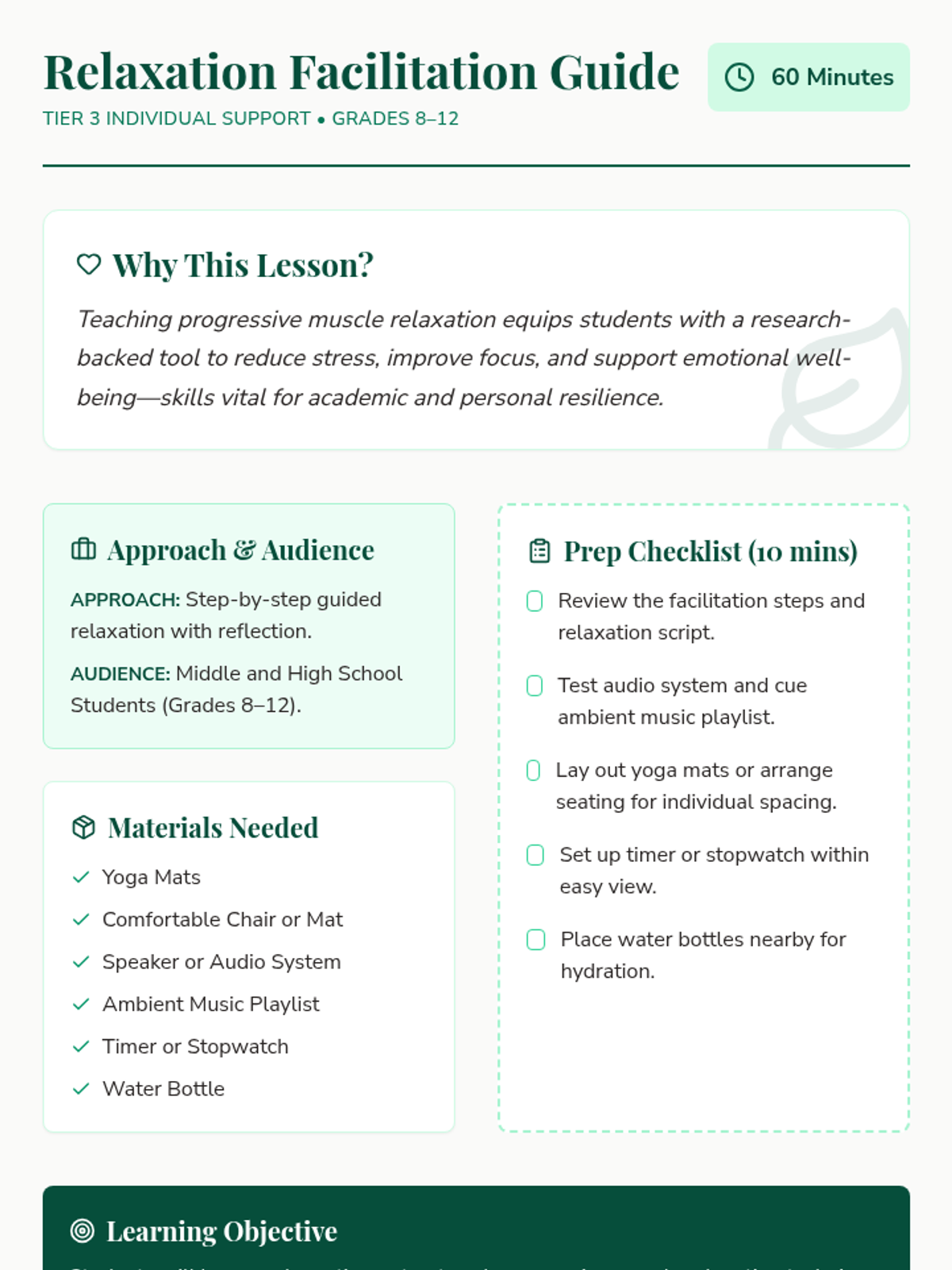A 60-minute individual Tier 3 session for students in grades 8–12, focusing on Progressive Muscle Relaxation (PMR) to identify and release physical tension, promoting emotional regulation and stress resilience.