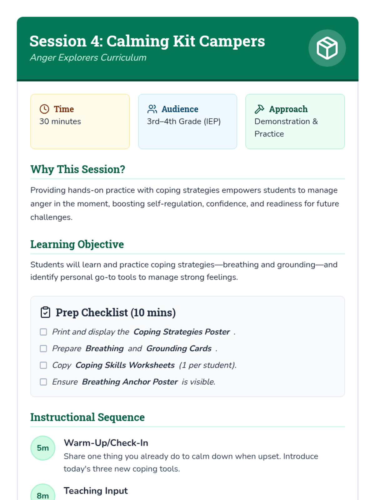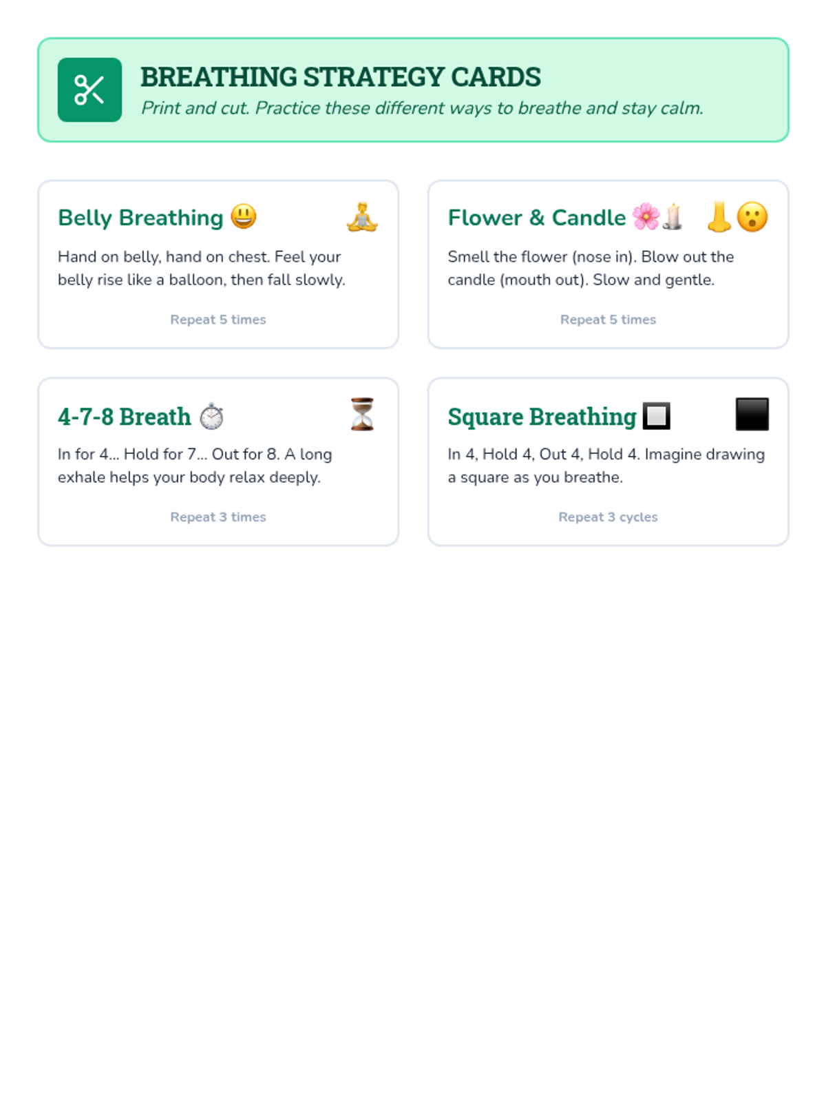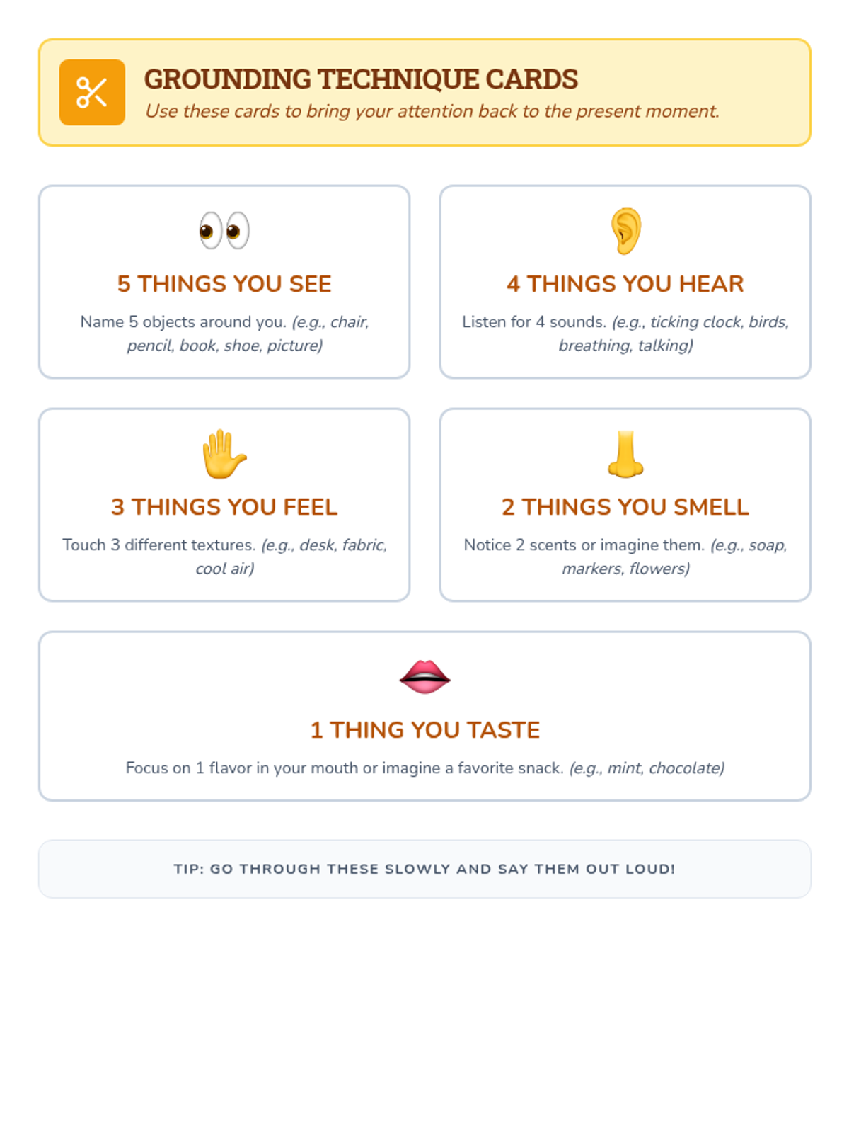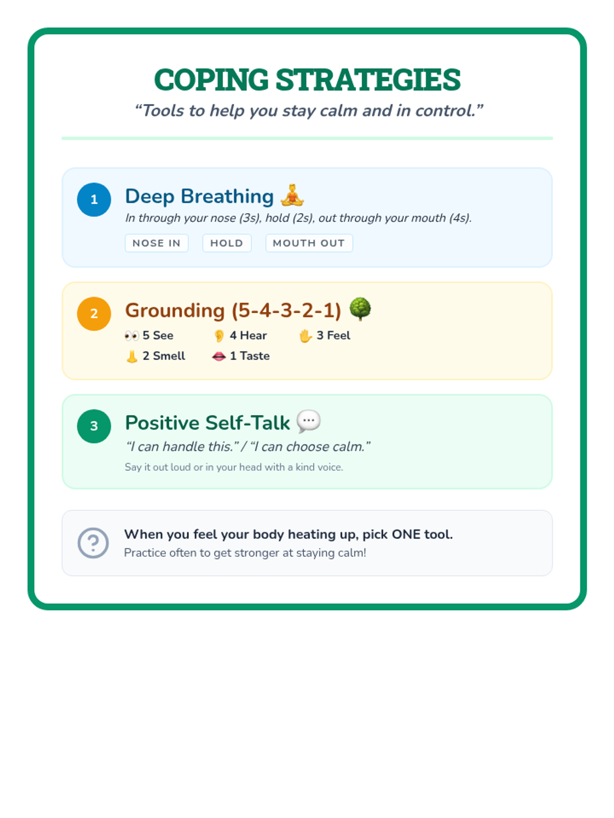Students practice and select personal coping strategies, including breathing and grounding techniques.