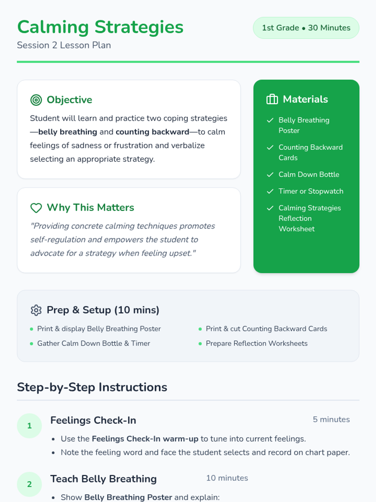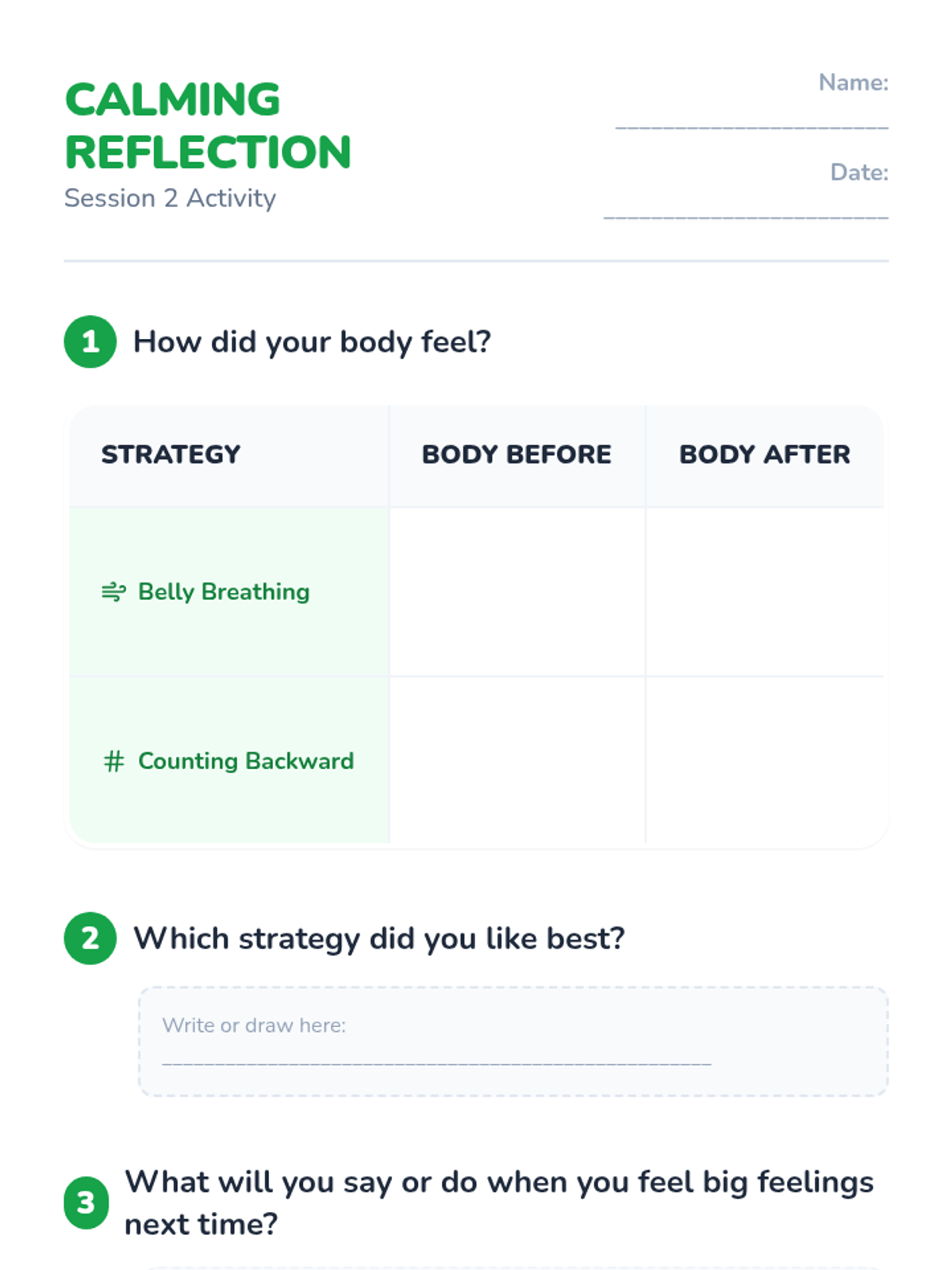 Students will learn and practice two specific coping strategies: belly breathing and counting backward, helping them regulate big emotions.