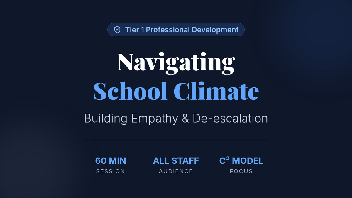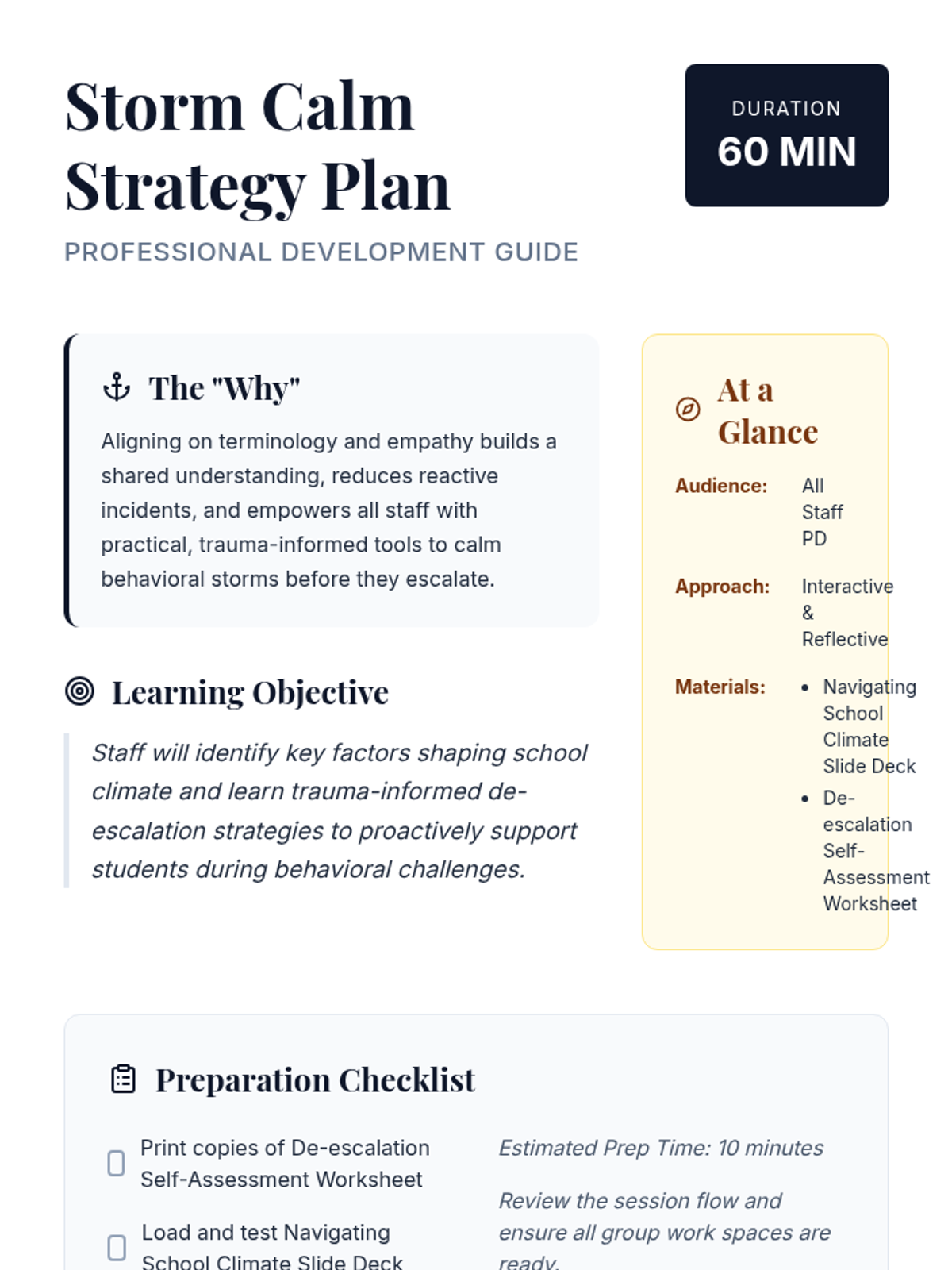 This 60-minute professional development session for all school staff focuses on trauma-informed de-escalation strategies and building a positive school climate to support student behavioral needs.