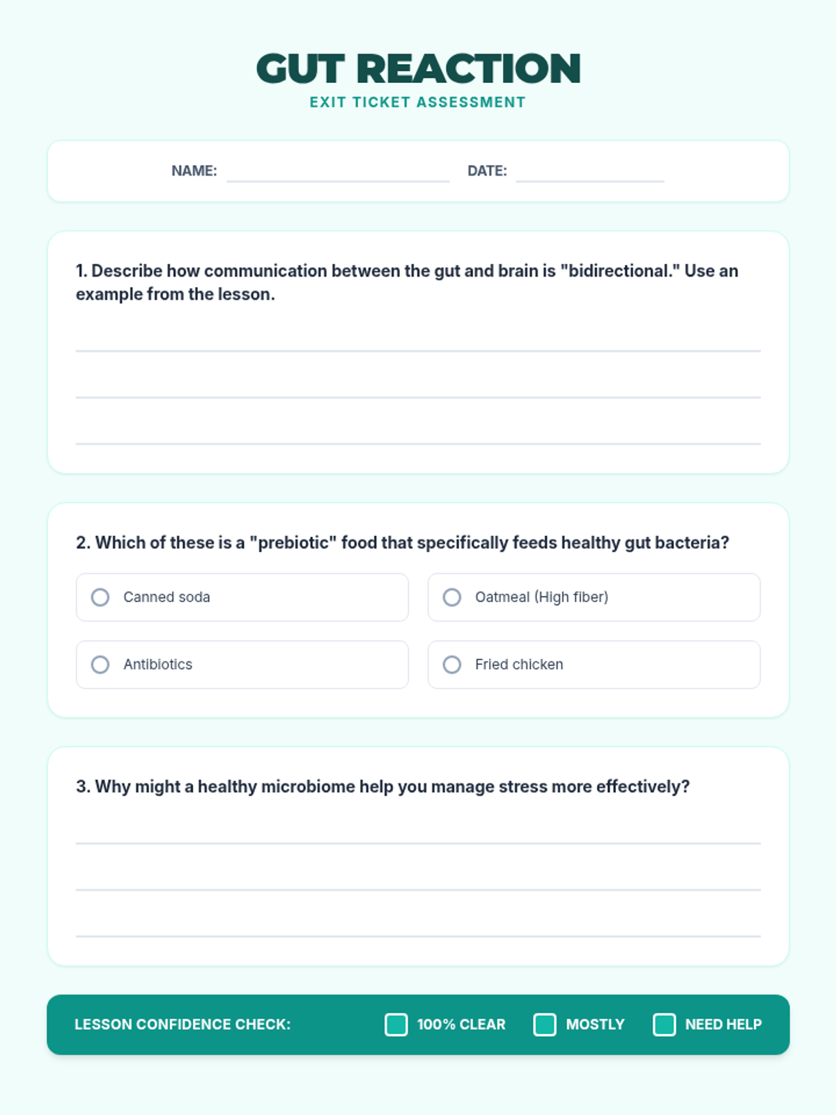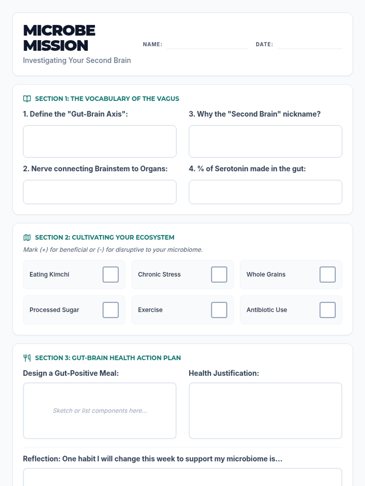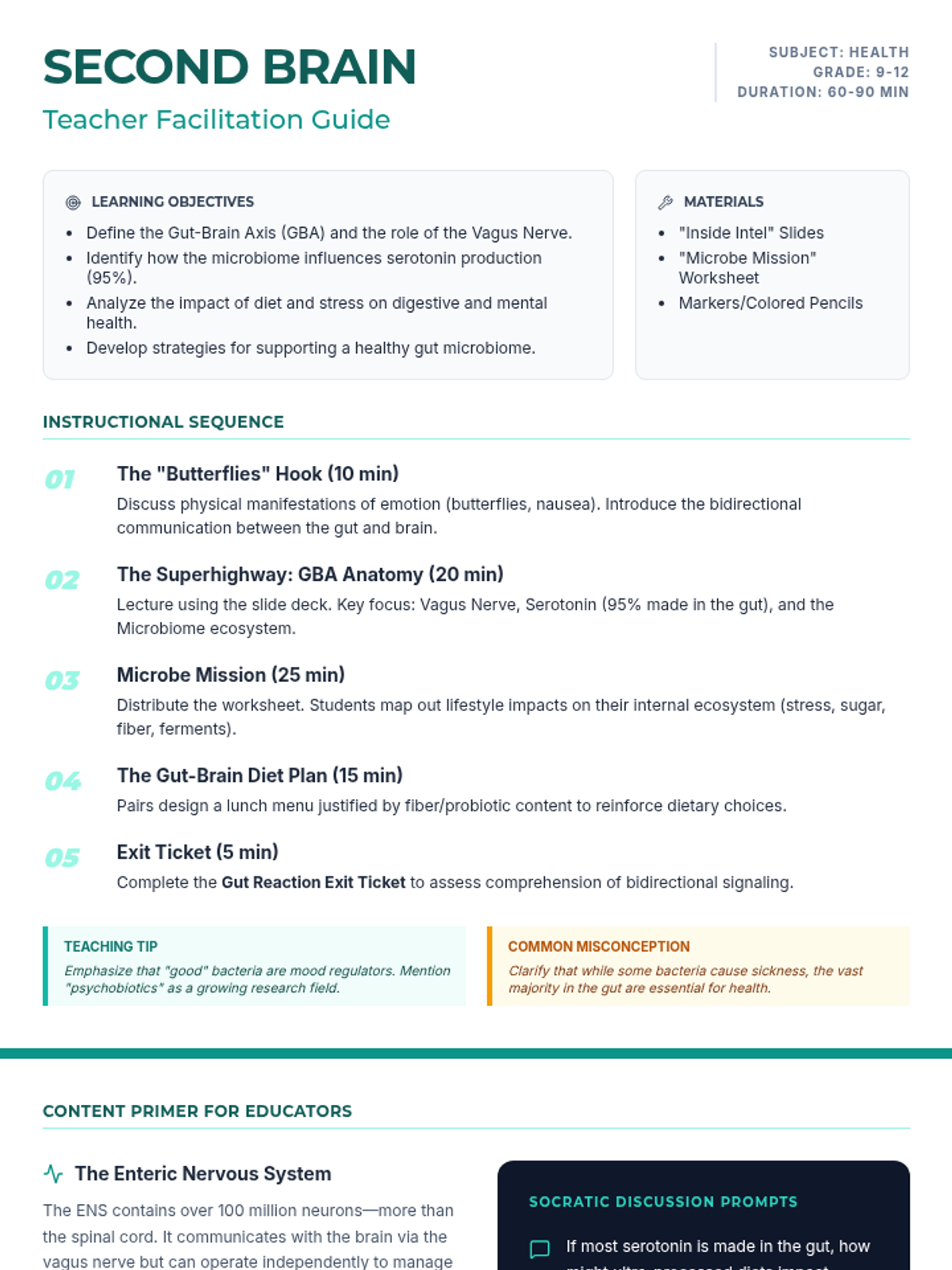 A comprehensive lesson exploring the gut-brain axis and how the microbiome influences mental health, neurotransmitter production, and emotional well-being.