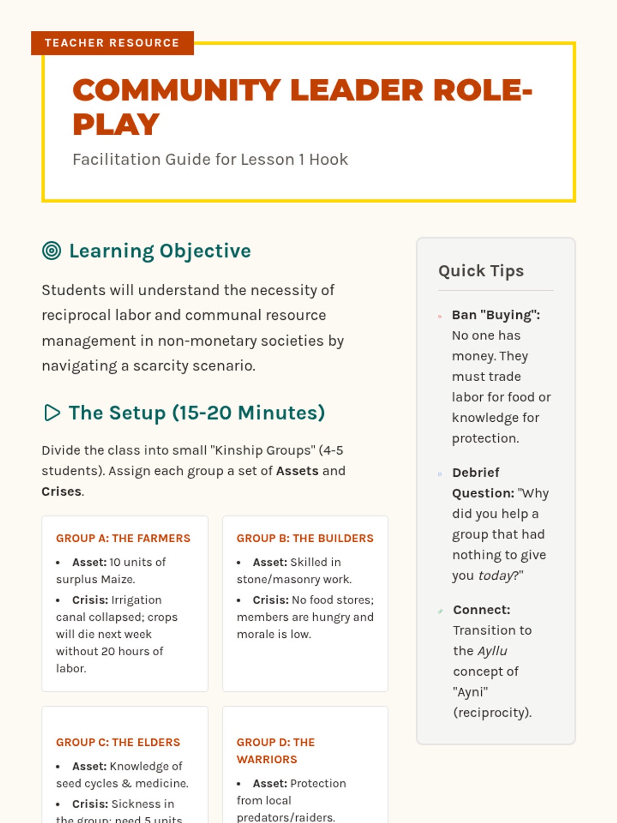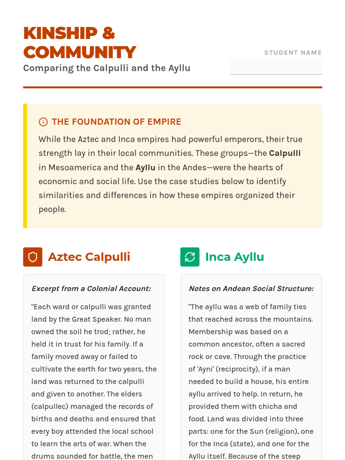 Students compare the fundamental social units of the Aztec (calpulli) and Inca (ayllu), analyzing how these kinship groups managed land distribution and communal labor.
