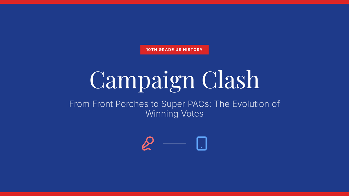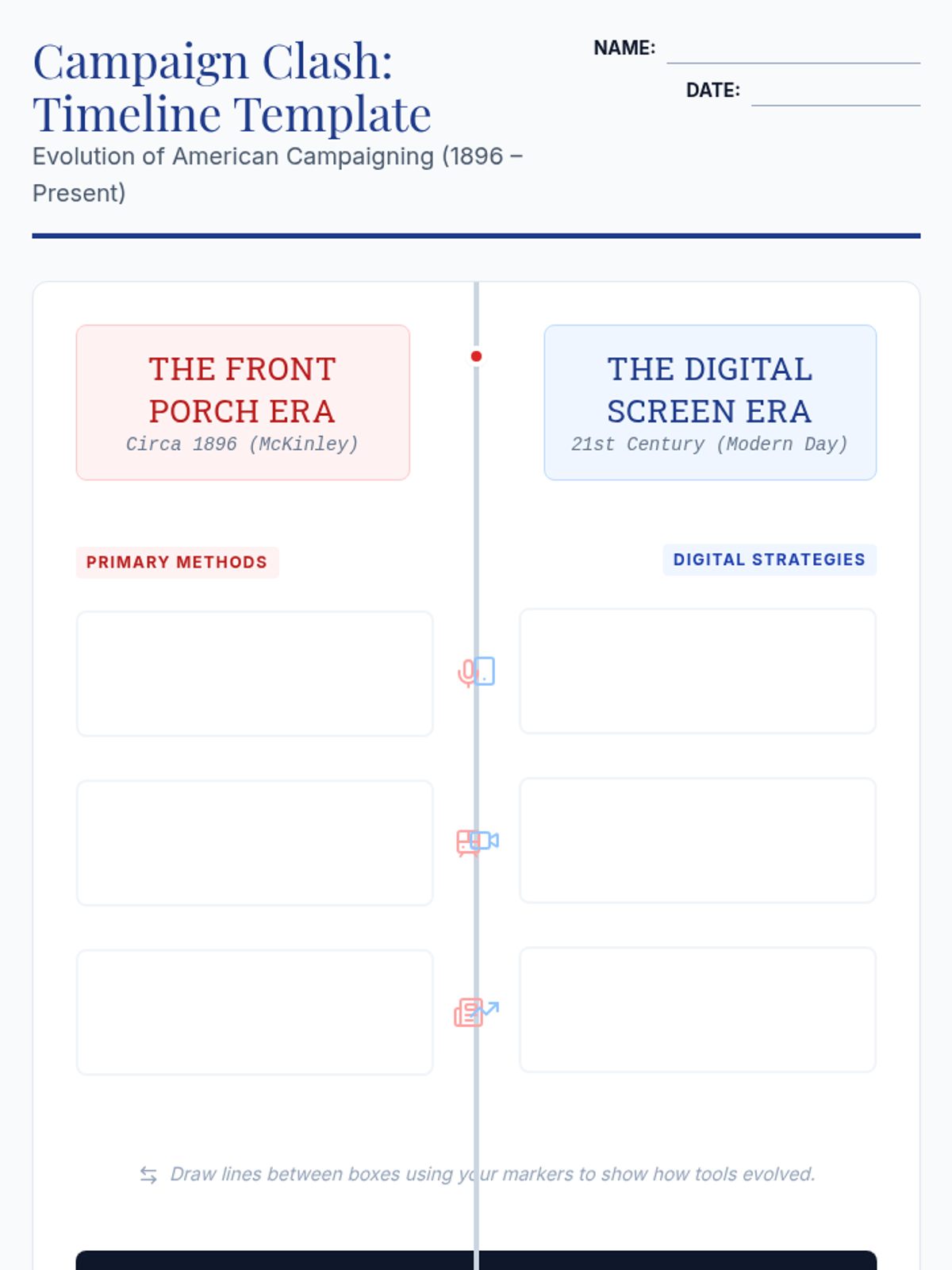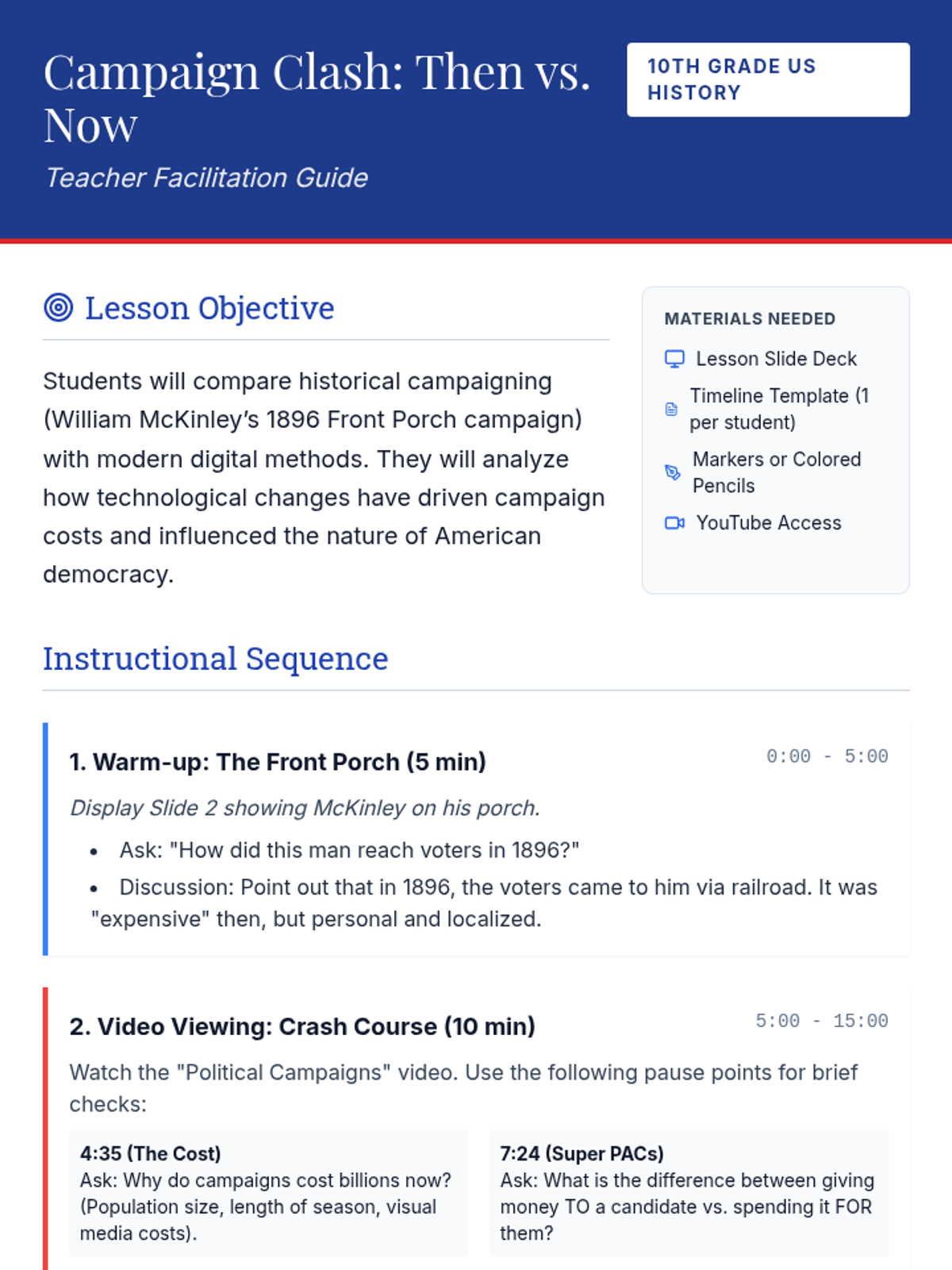 A 10th-grade US History lesson comparing the 'Front Porch' campaign style of William McKinley with modern, high-cost digital campaigning, focusing on the evolution of political communication and finance.