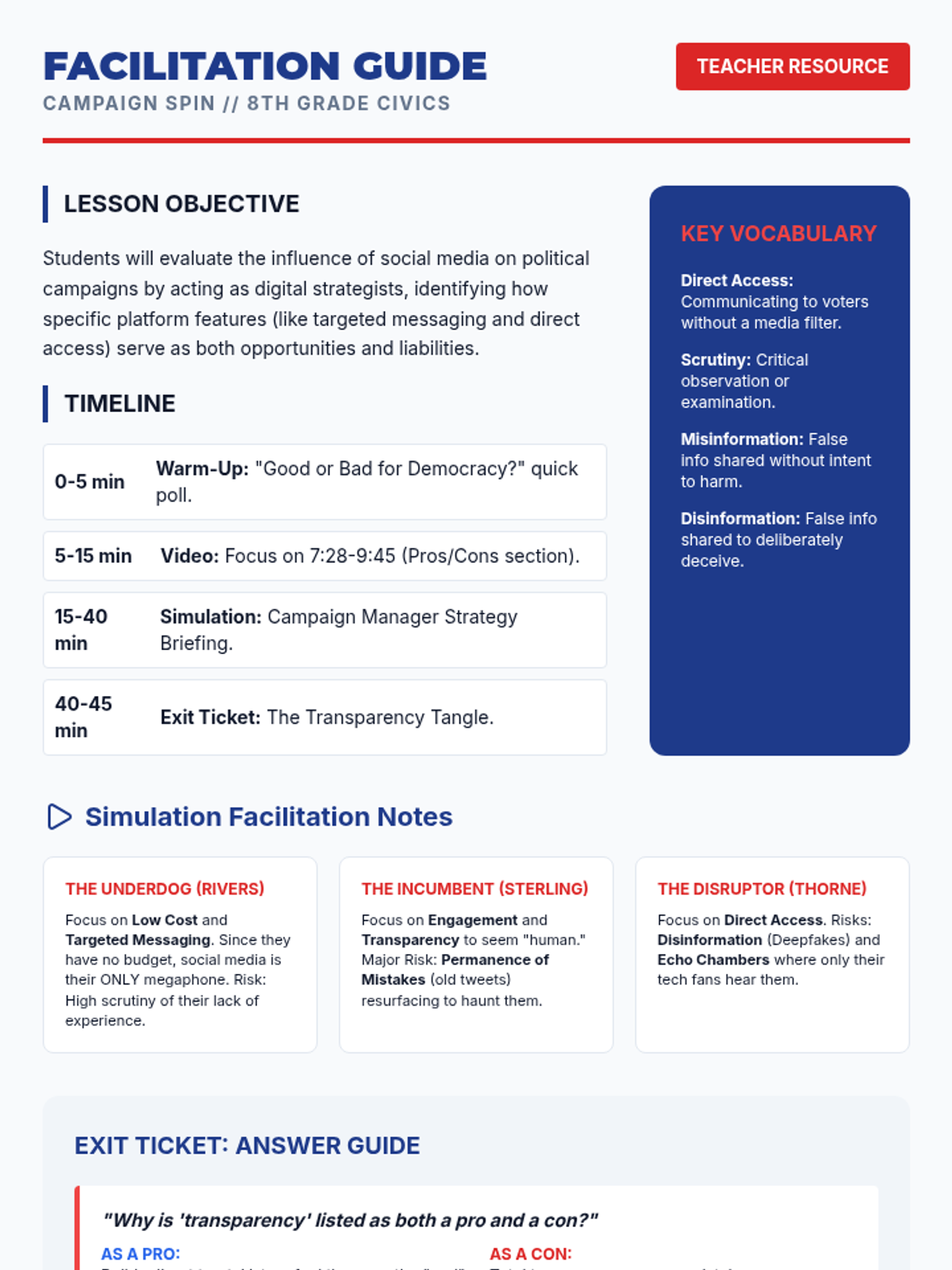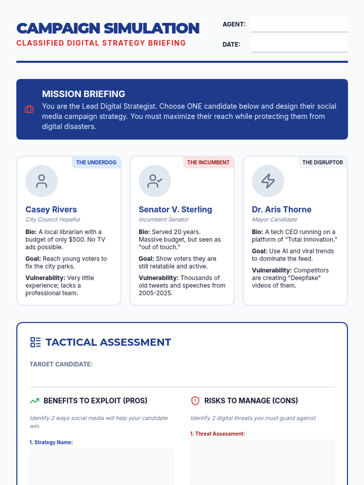 A civics lesson evaluating the impact of social media on modern political campaigns through a campaign manager simulation and video analysis.