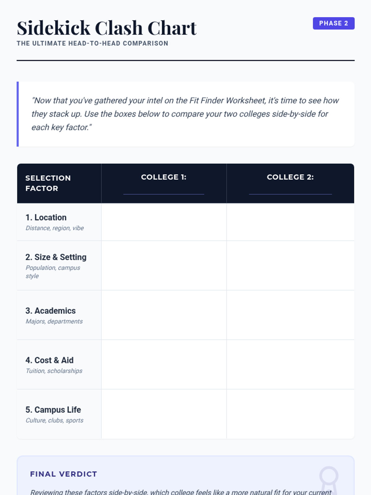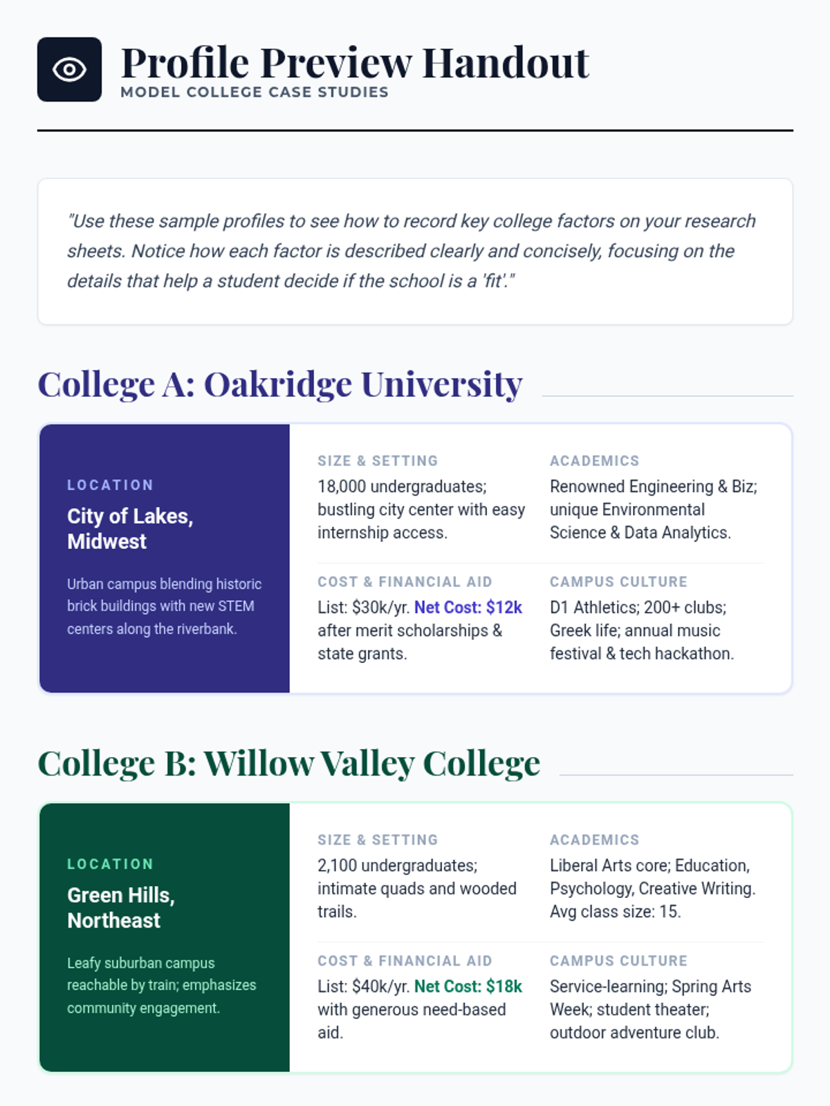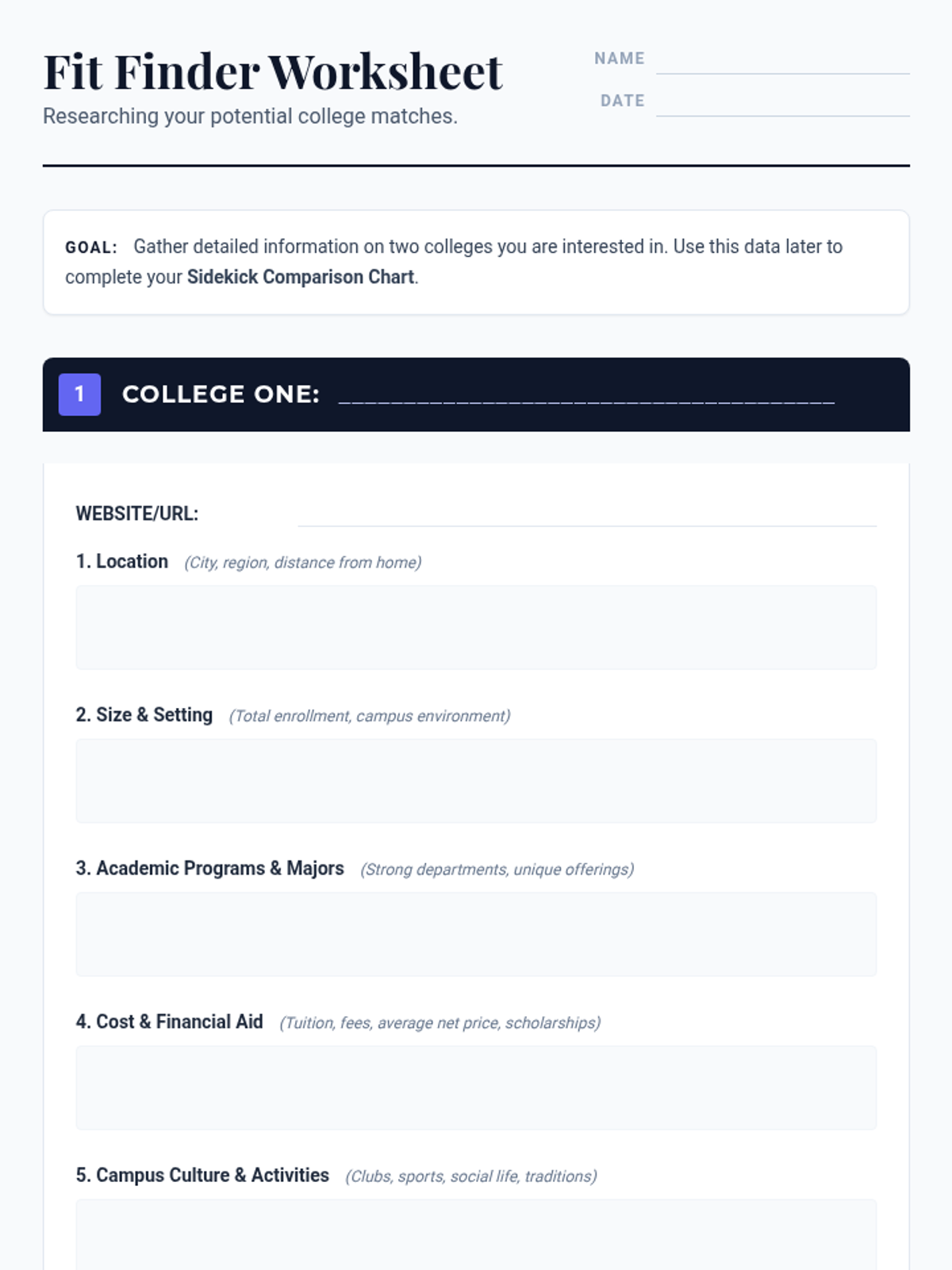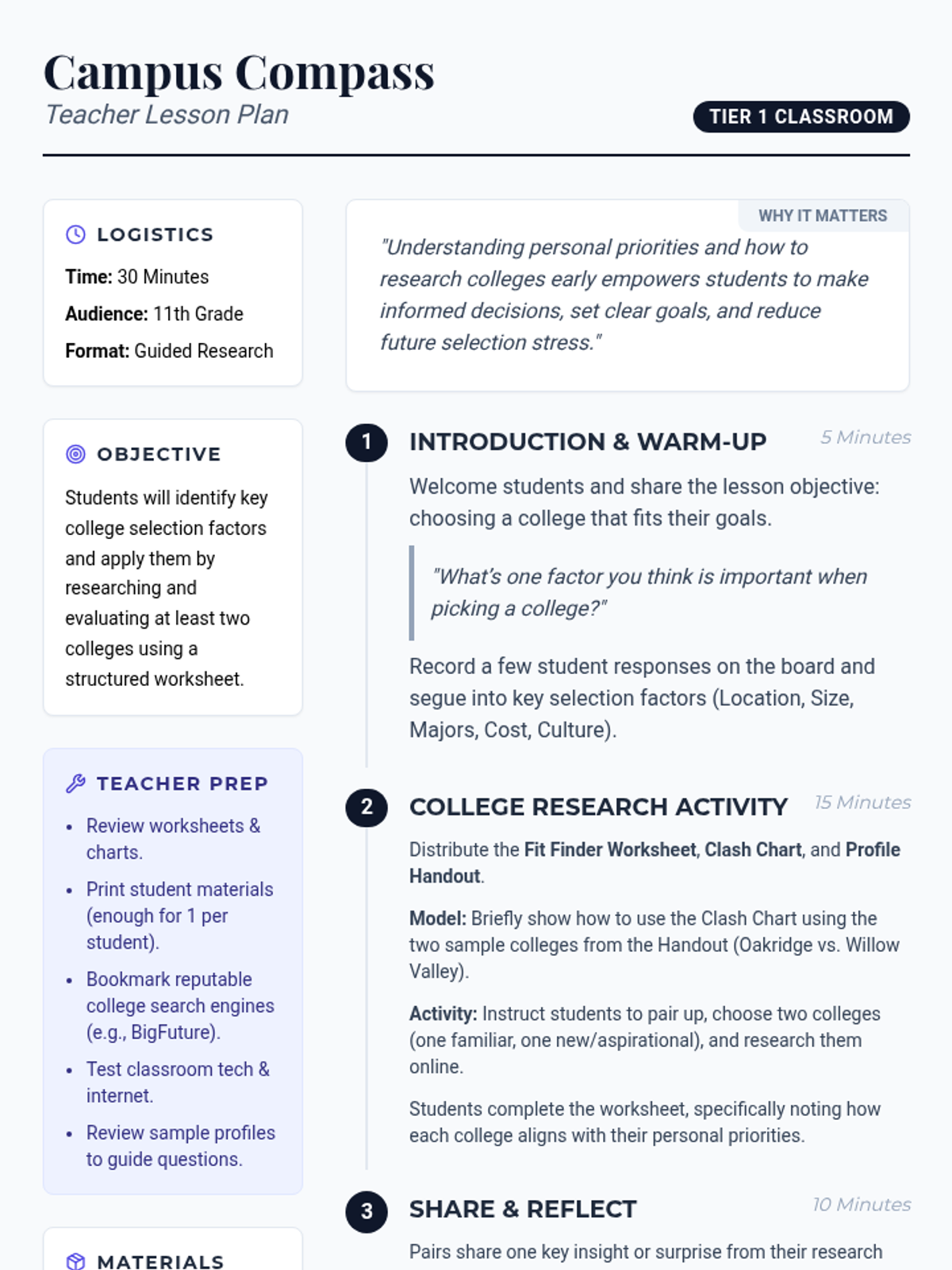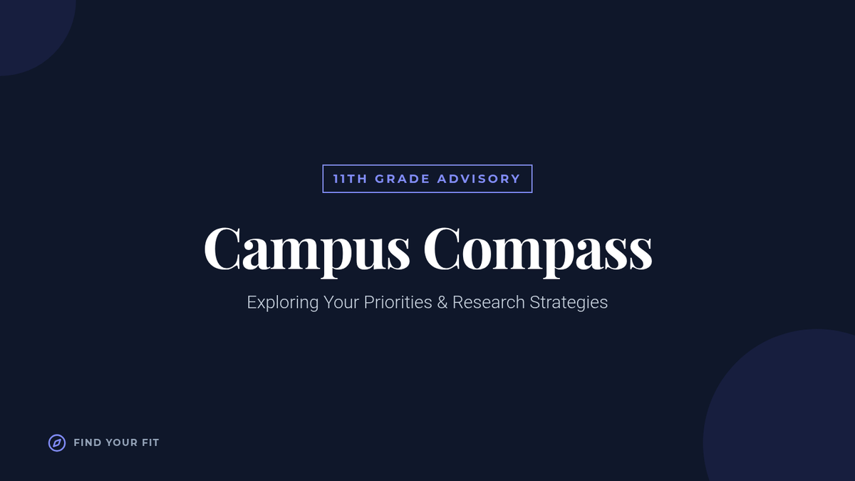 A 30-minute session for 11th graders to explore and compare colleges based on personal priorities like location, size, and cost. Students will use research tools to evaluate potential matches and plan their next steps in the college search process.