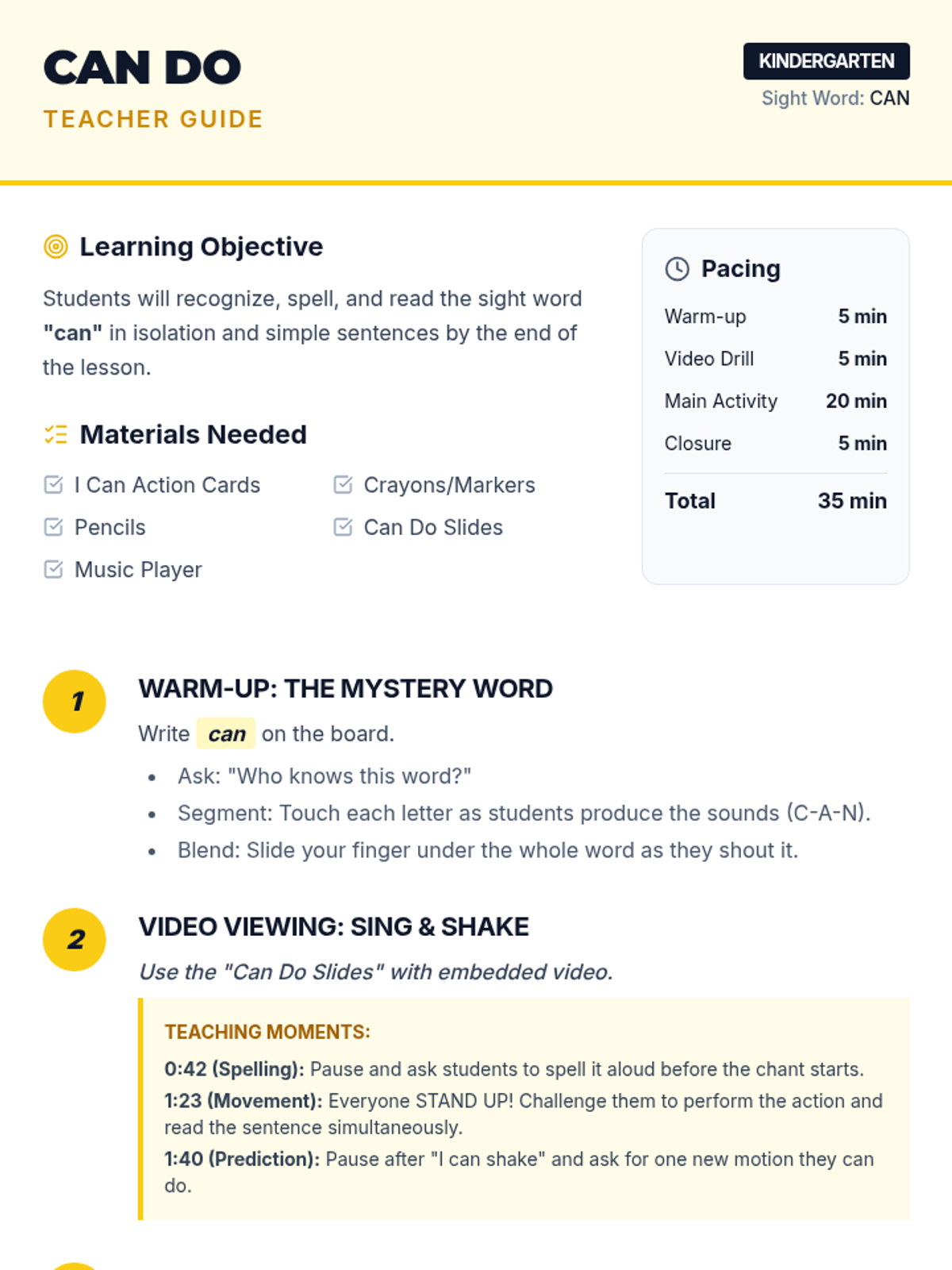A high-energy Kindergarten lesson focused on mastering the sight word 'can' through music, movement, and personal expression. Students will recognize, spell, and use the word in original sentences.