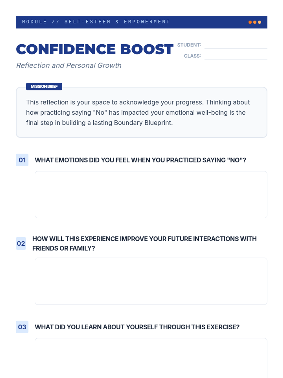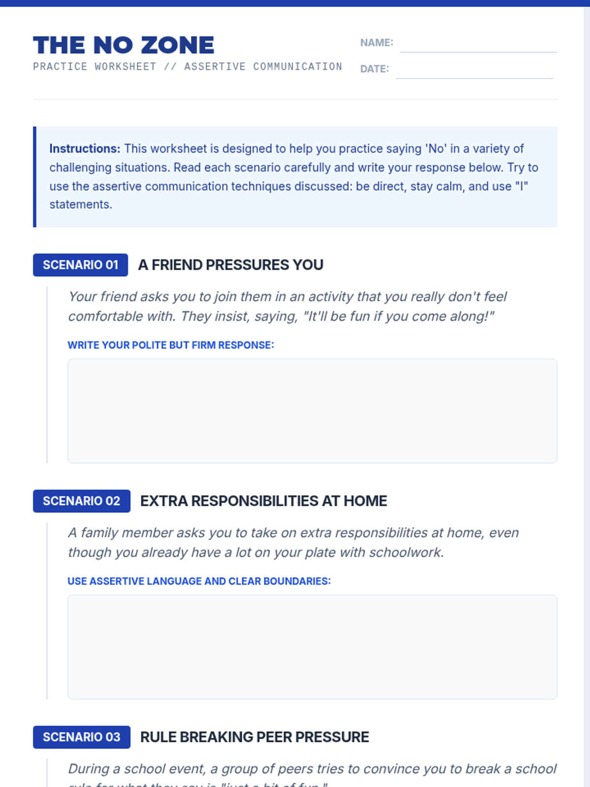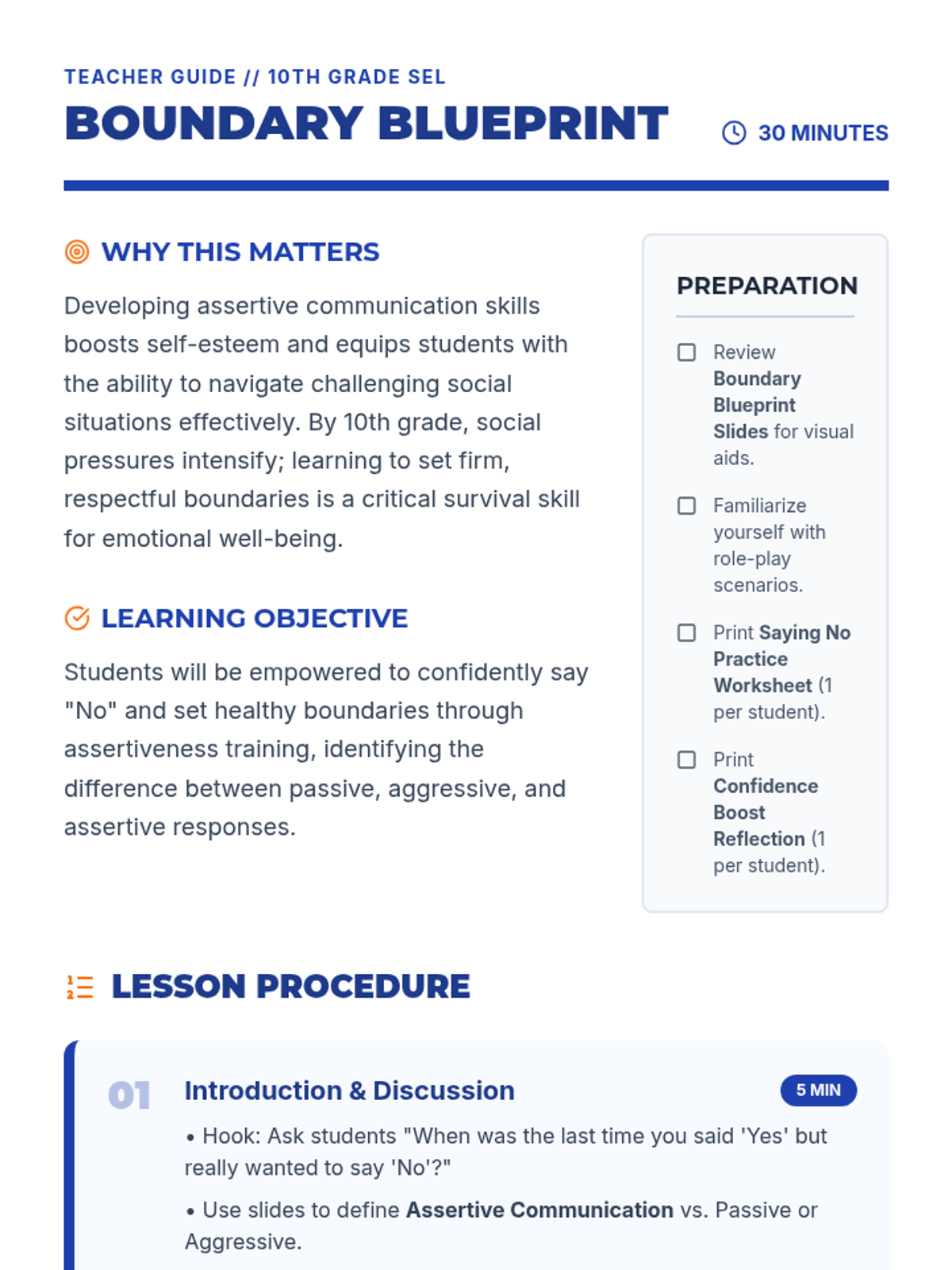 A lesson empowering 10th-grade students to use assertive communication and set healthy boundaries. Through role-play and reflection, students develop self-esteem and the confidence to say 'No' in challenging social situations.