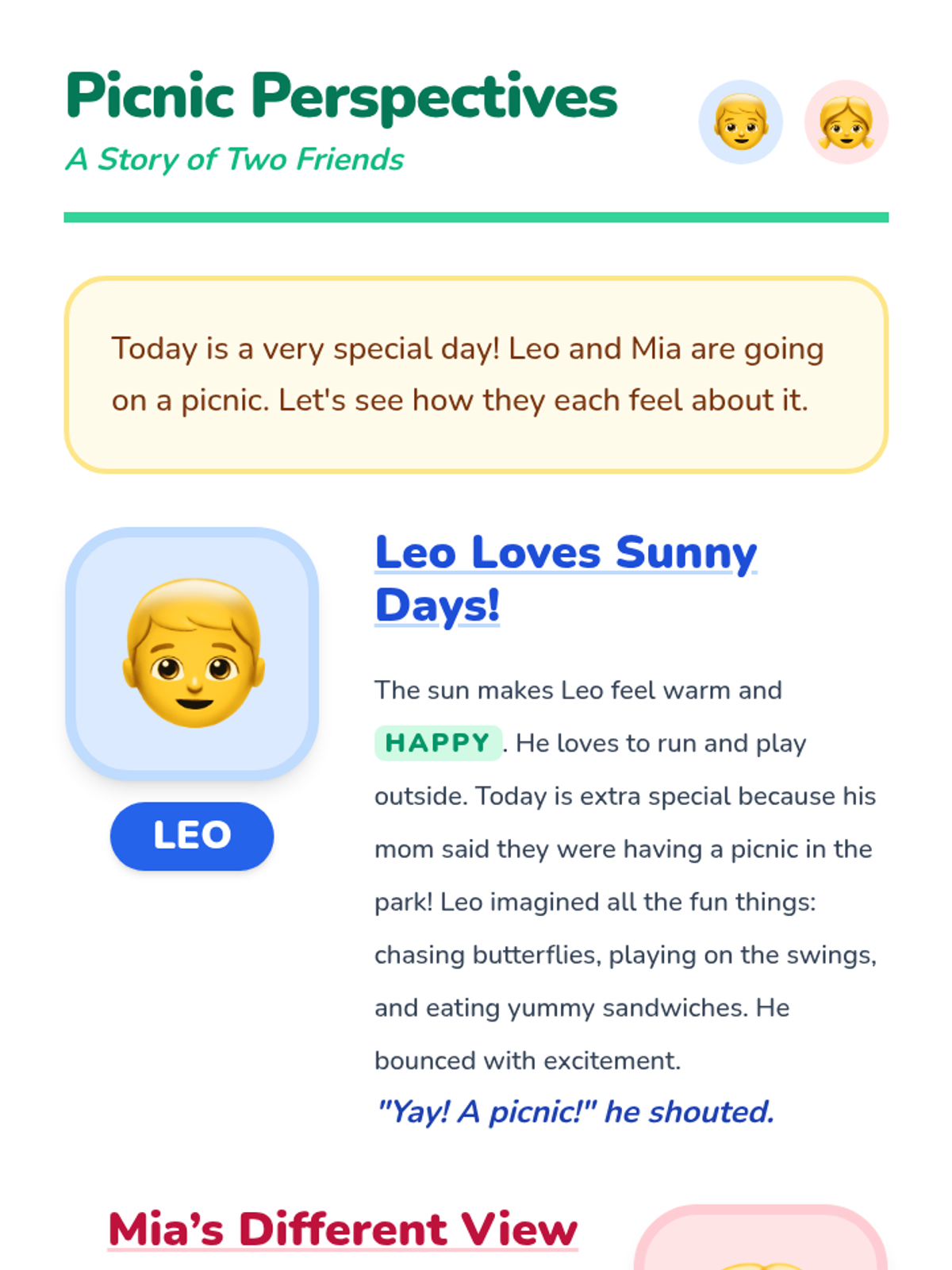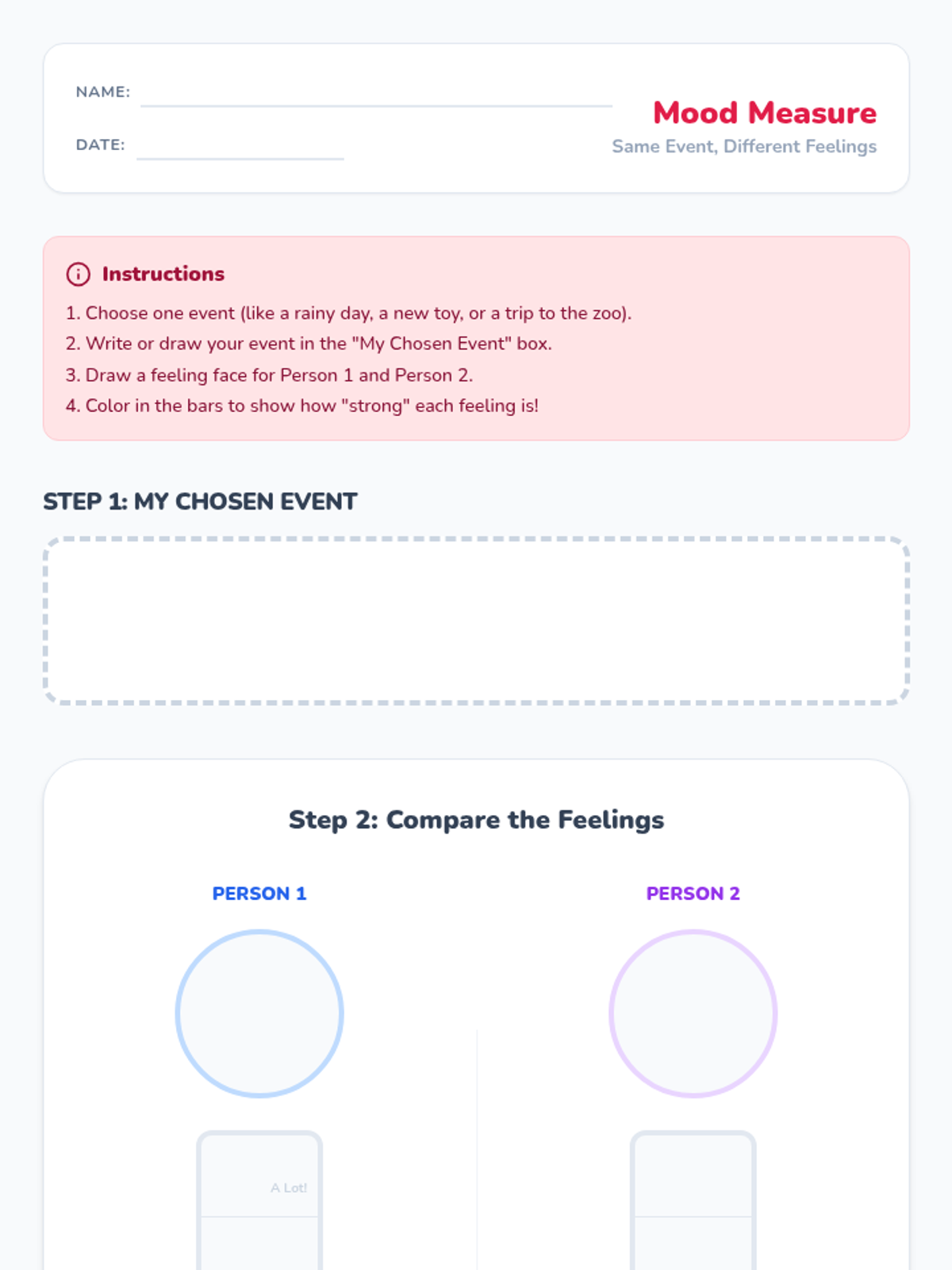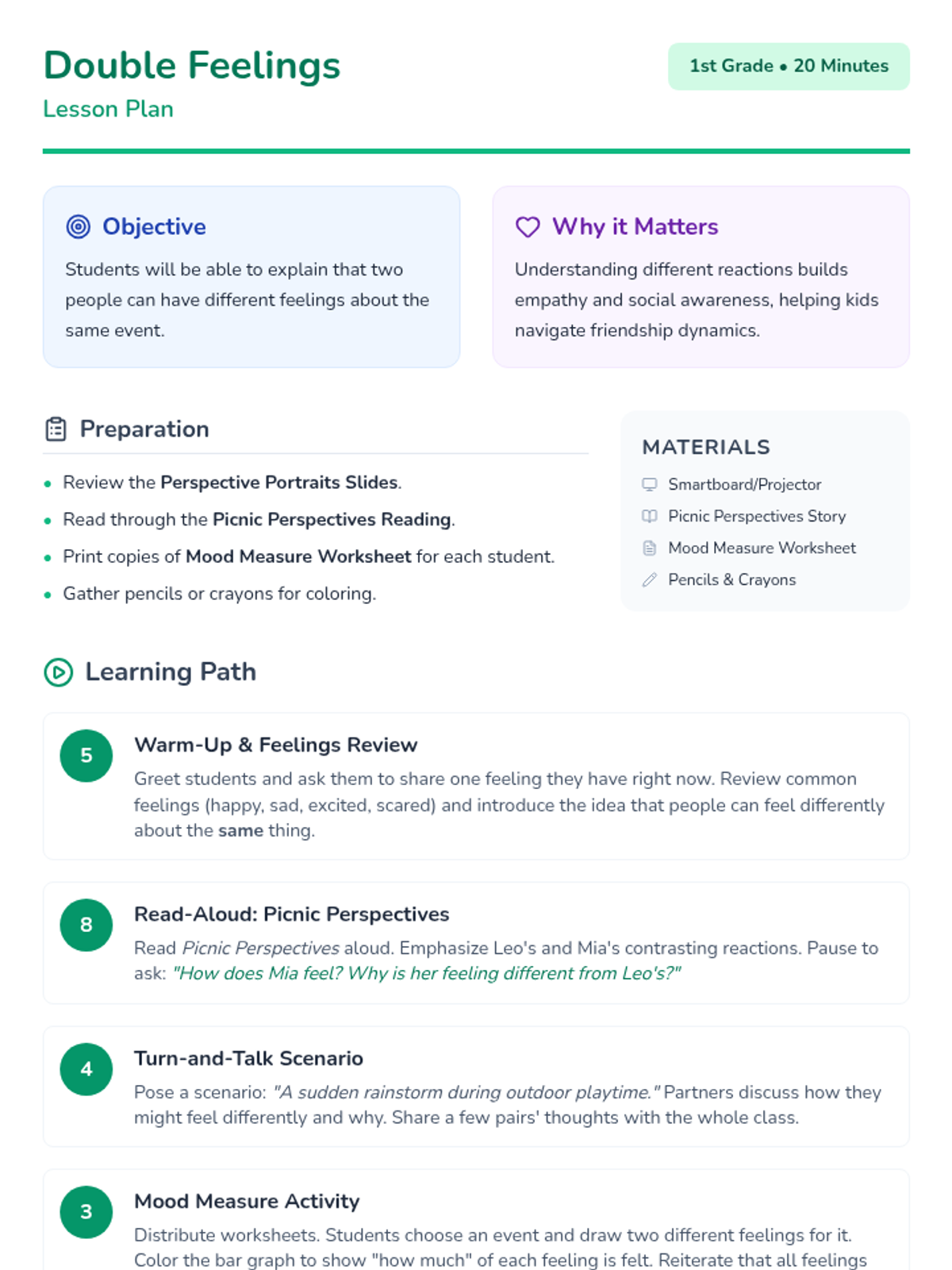 A 20-minute social-emotional learning lesson for 1st graders that explores empathy and perspective-taking, helping students understand that two people can have different emotional responses to the same situation.