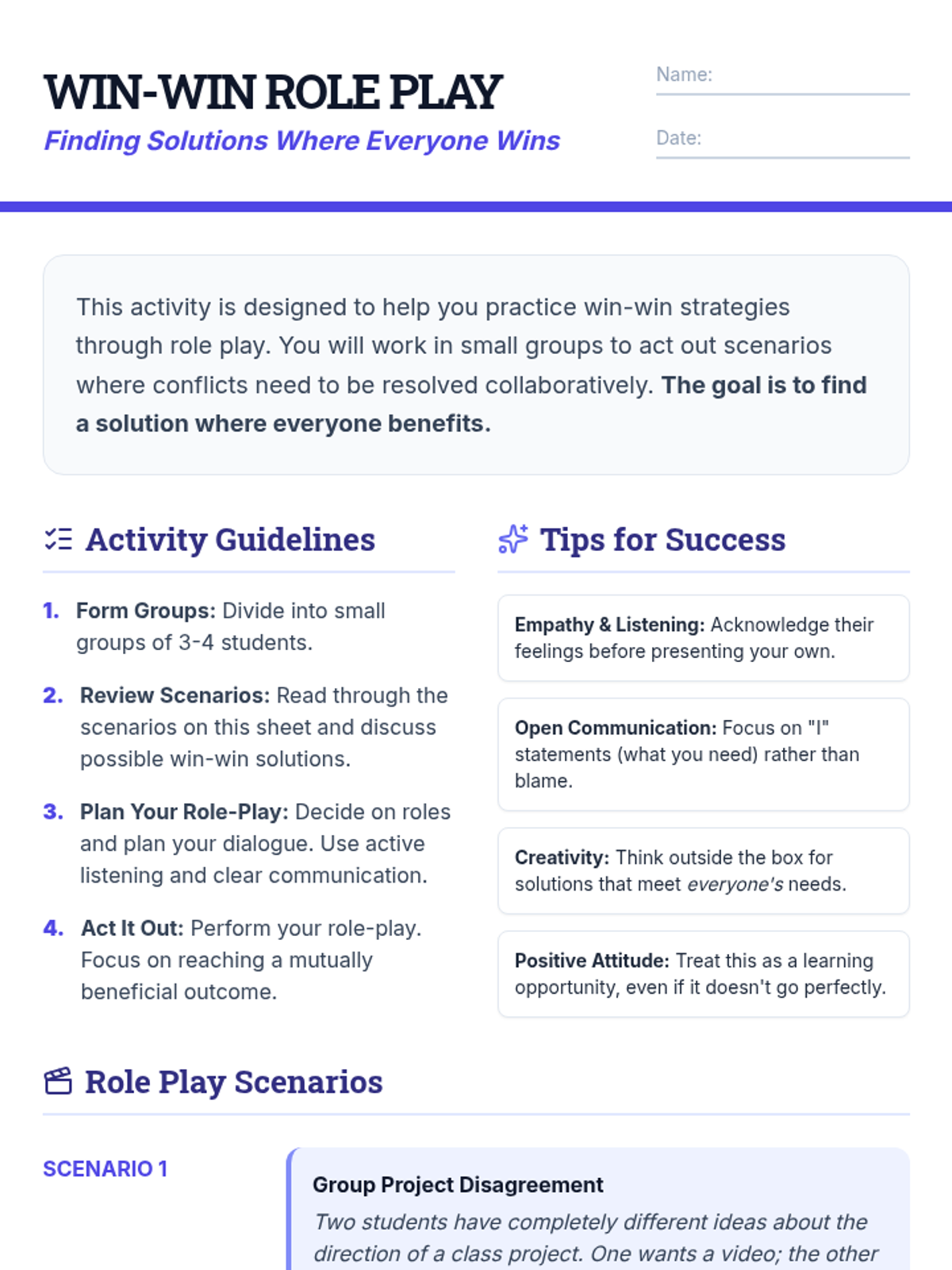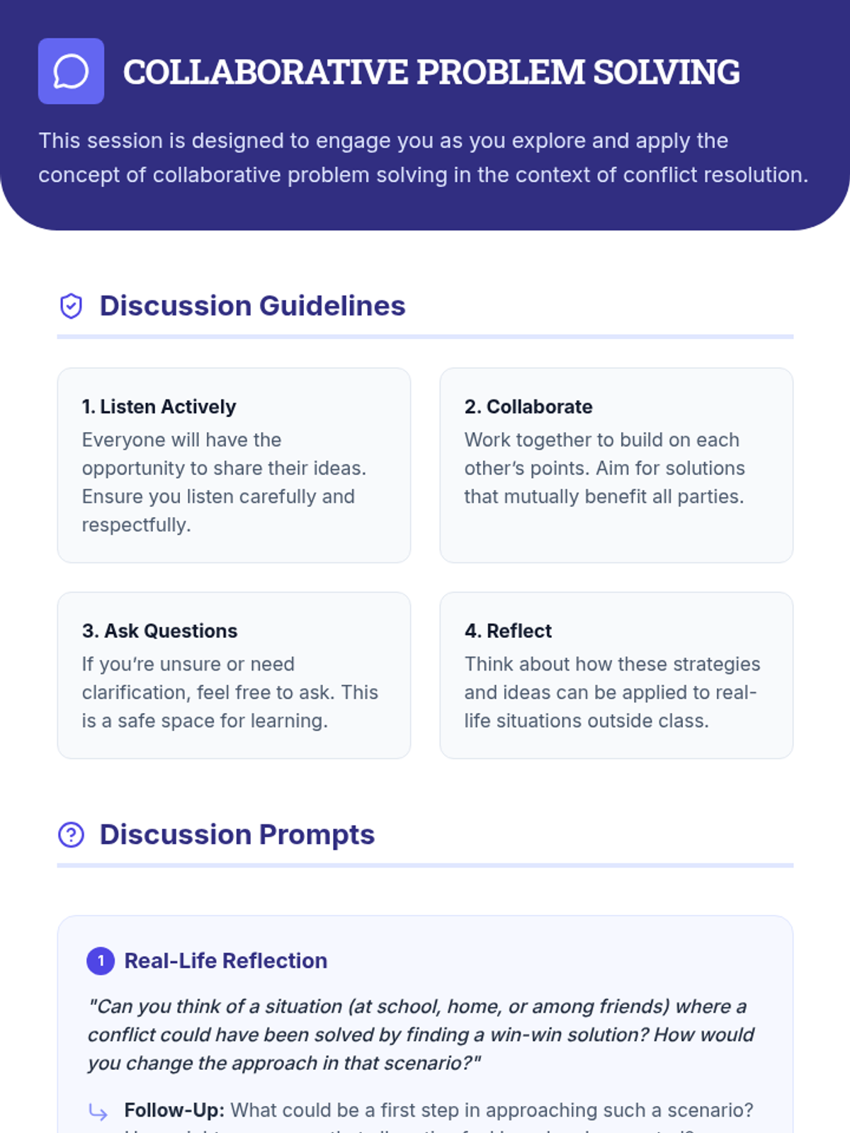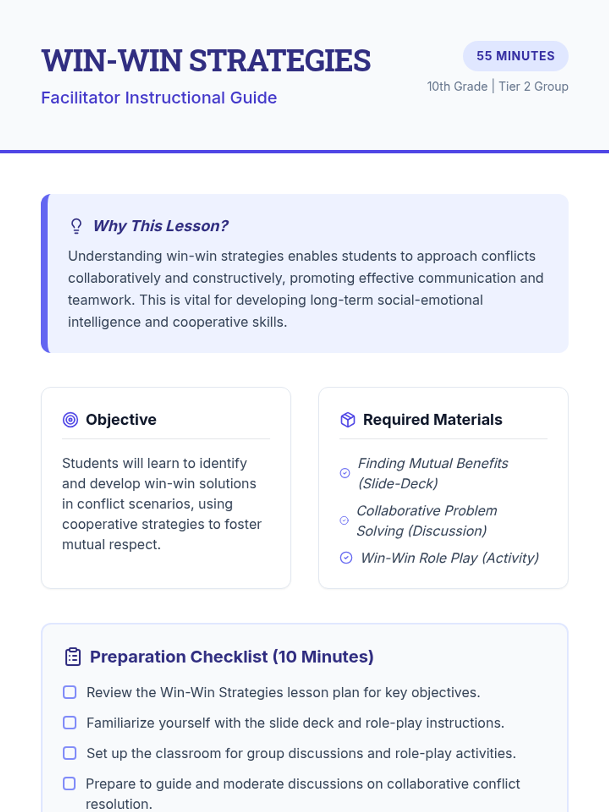 A 55-minute Tier 2 group lesson for 10th graders focused on identifying and implementing win-win solutions in conflicts through collaboration and mutual respect.