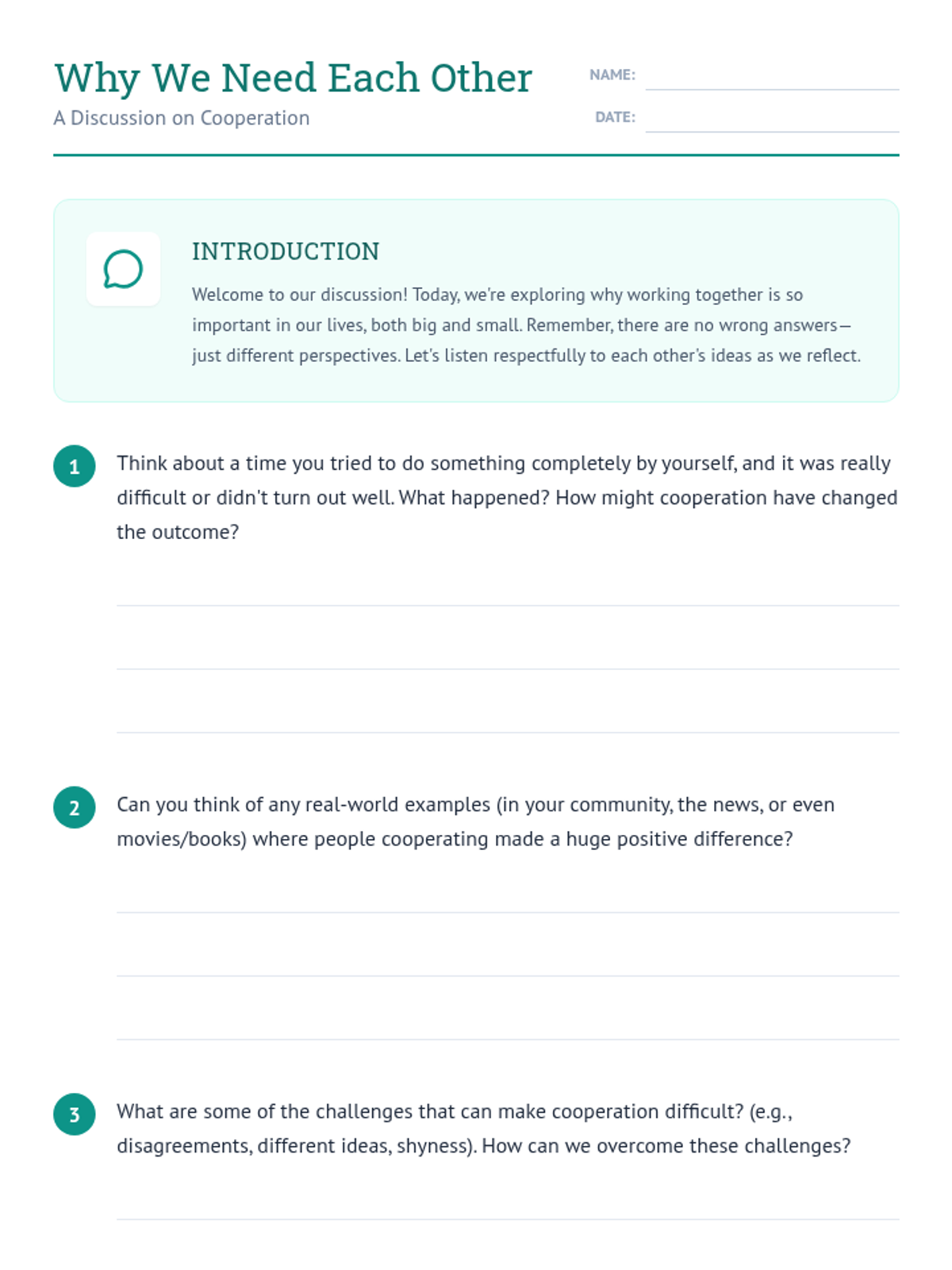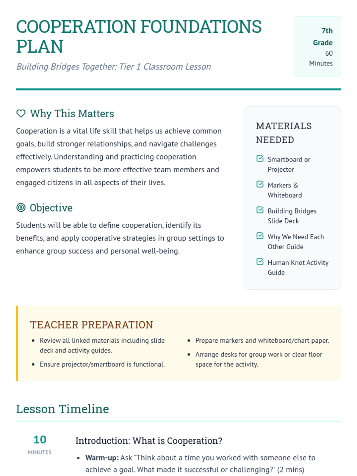 A 60-minute lesson for 7th graders that introduces cooperation as a core life skill through discussion and a hands-on physical challenge. Students define cooperation, explore its benefits, and practice collaborative problem-solving.