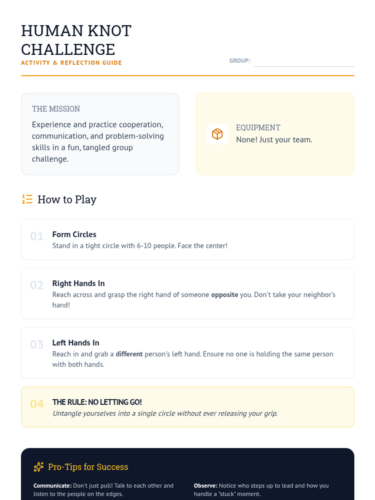 Practical team-based synergy challenges to apply collaborative problem-solving skills.