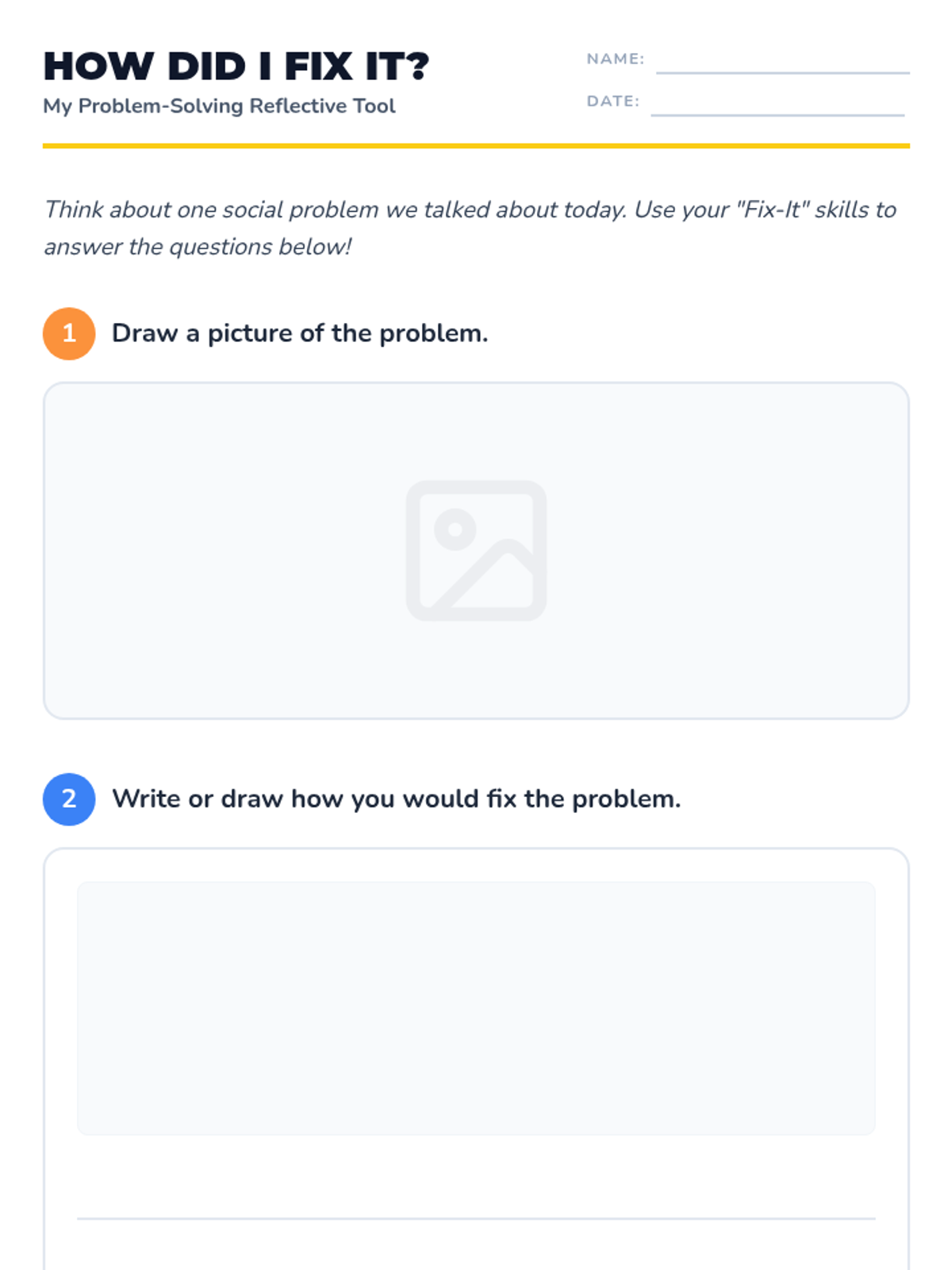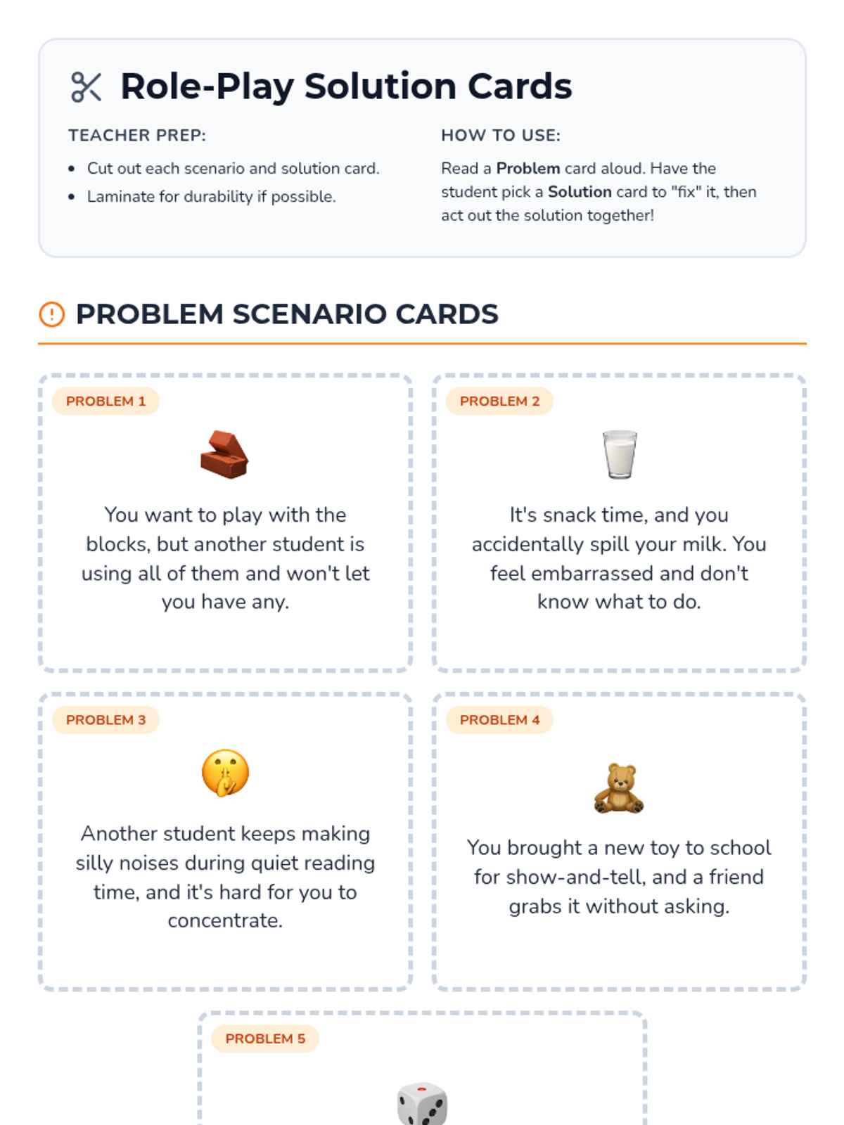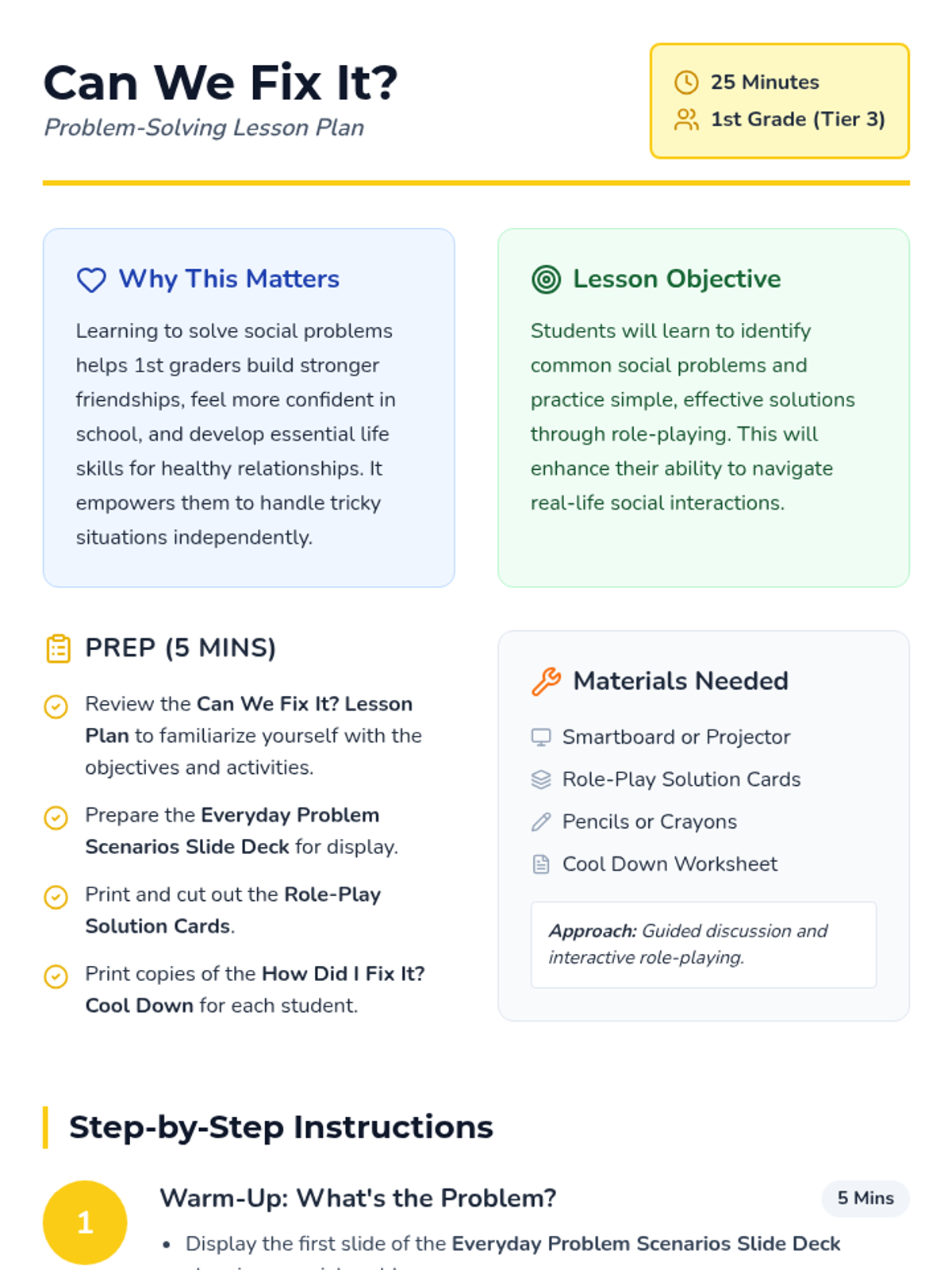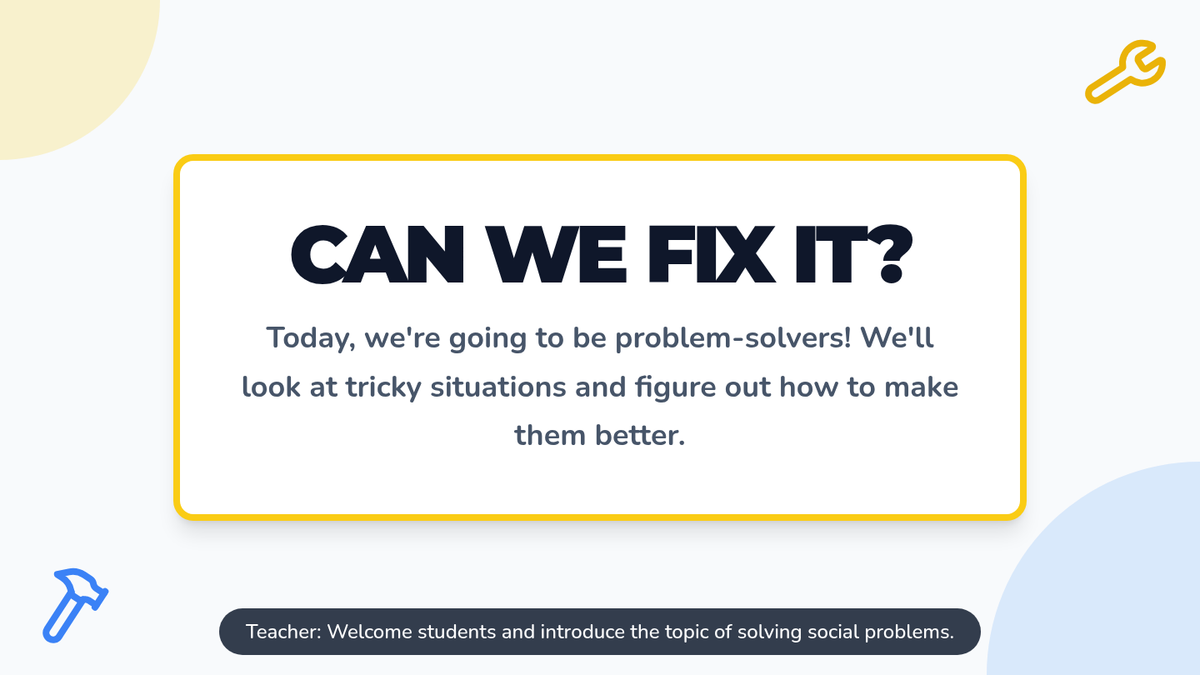 A Tier 3 social-emotional learning lesson for 1st graders focused on identifying social problems and practicing effective solutions through role-play. Students will build a 'toolbox' of strategies like sharing, taking turns, and using their words.