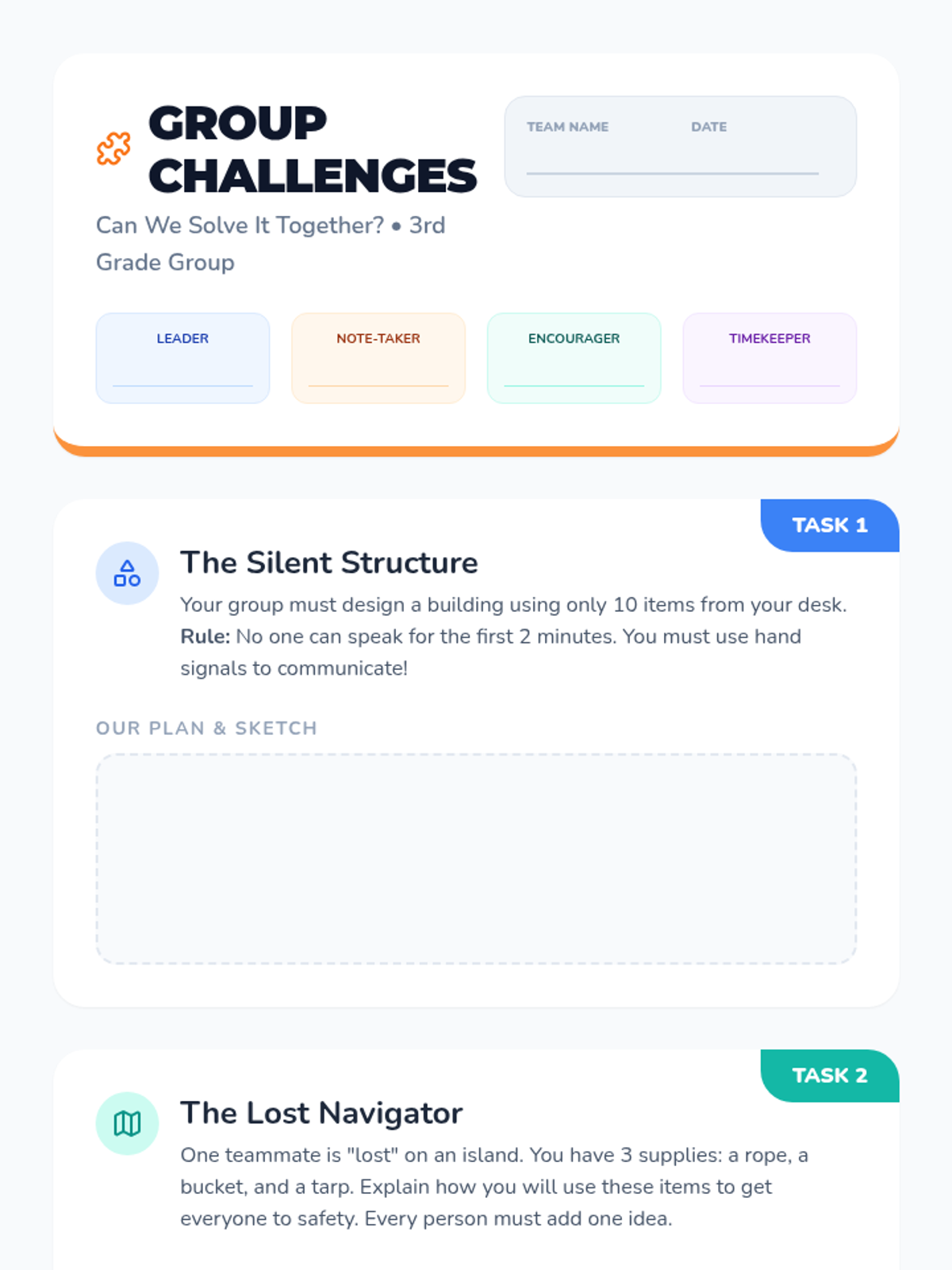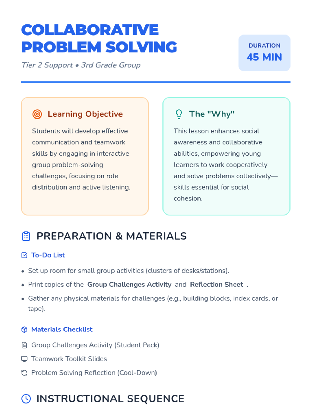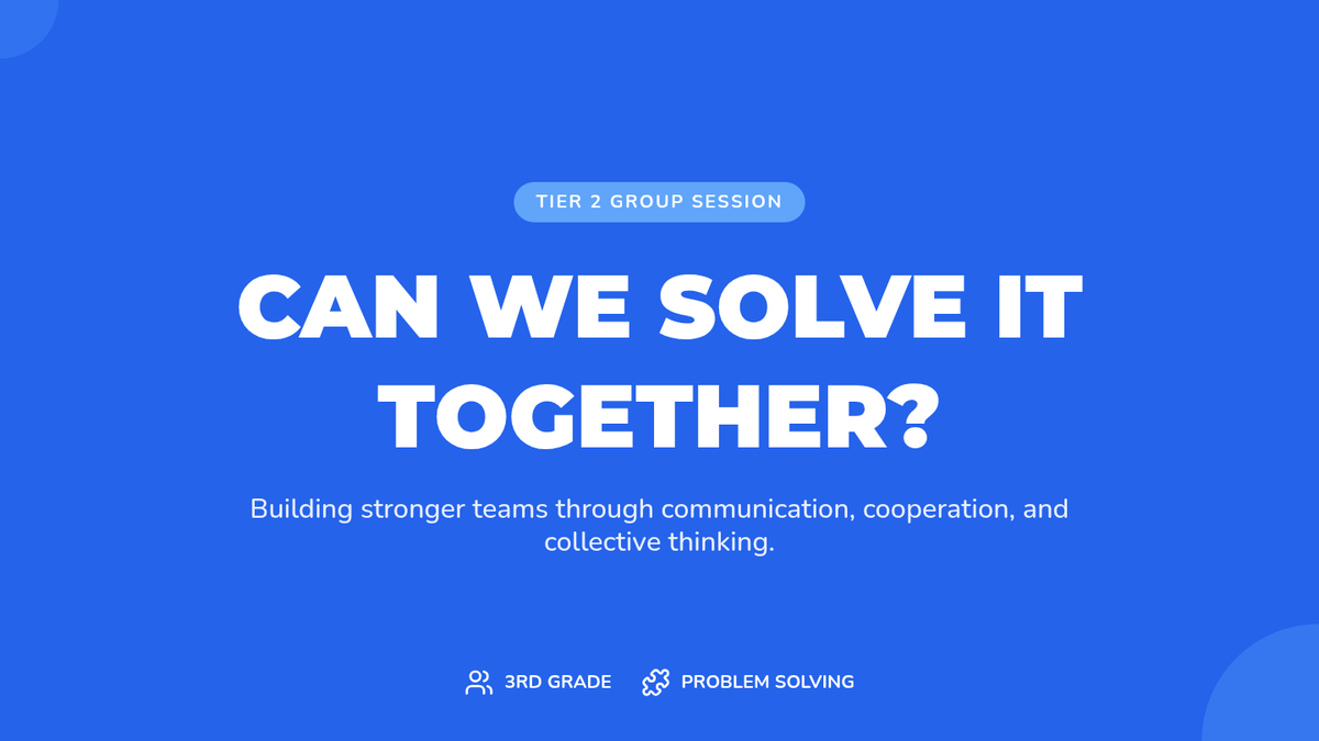 A Tier 2 social-emotional learning lesson for 3rd graders focused on collaborative problem-solving, communication, and teamwork through interactive group challenges.