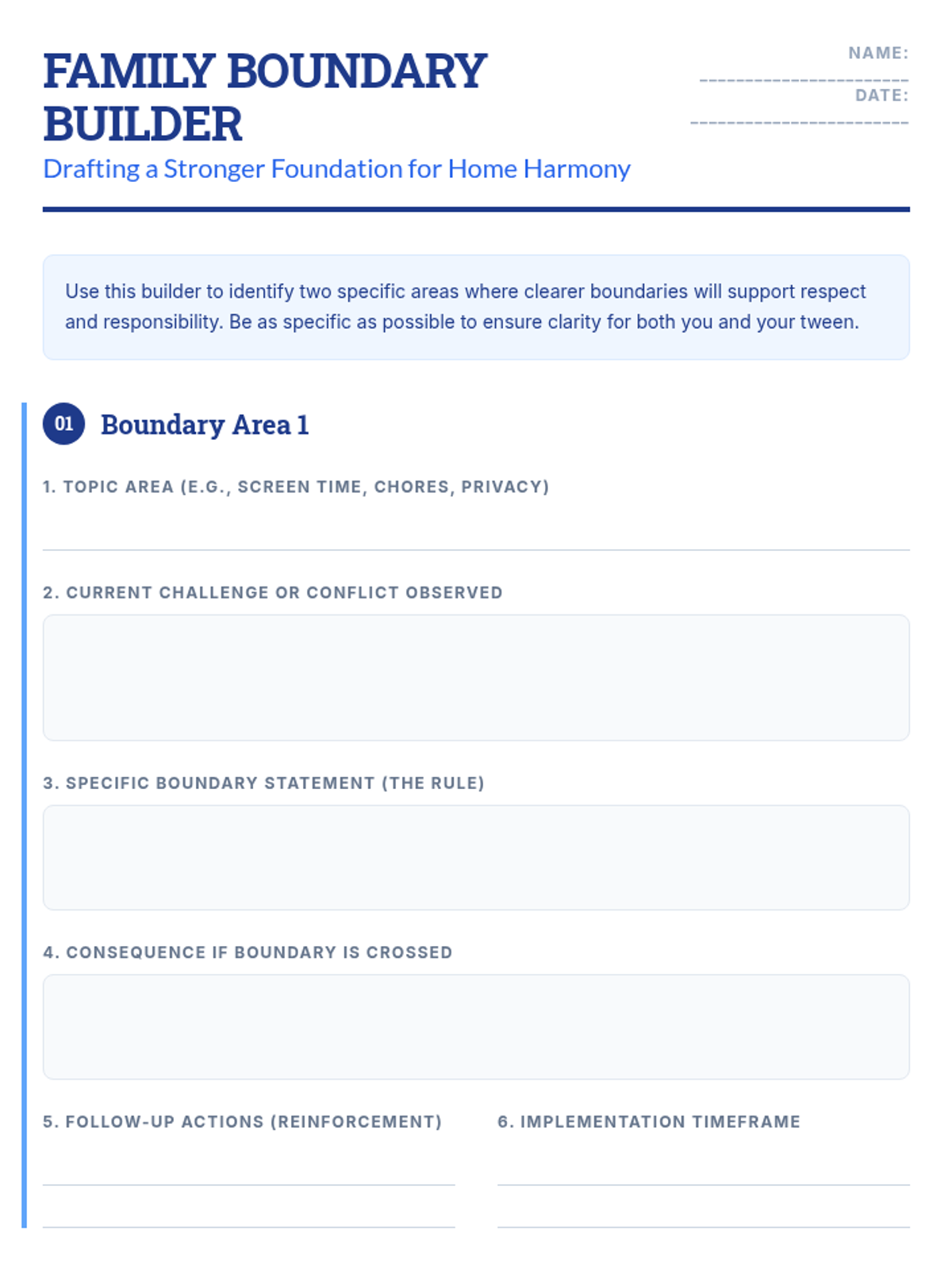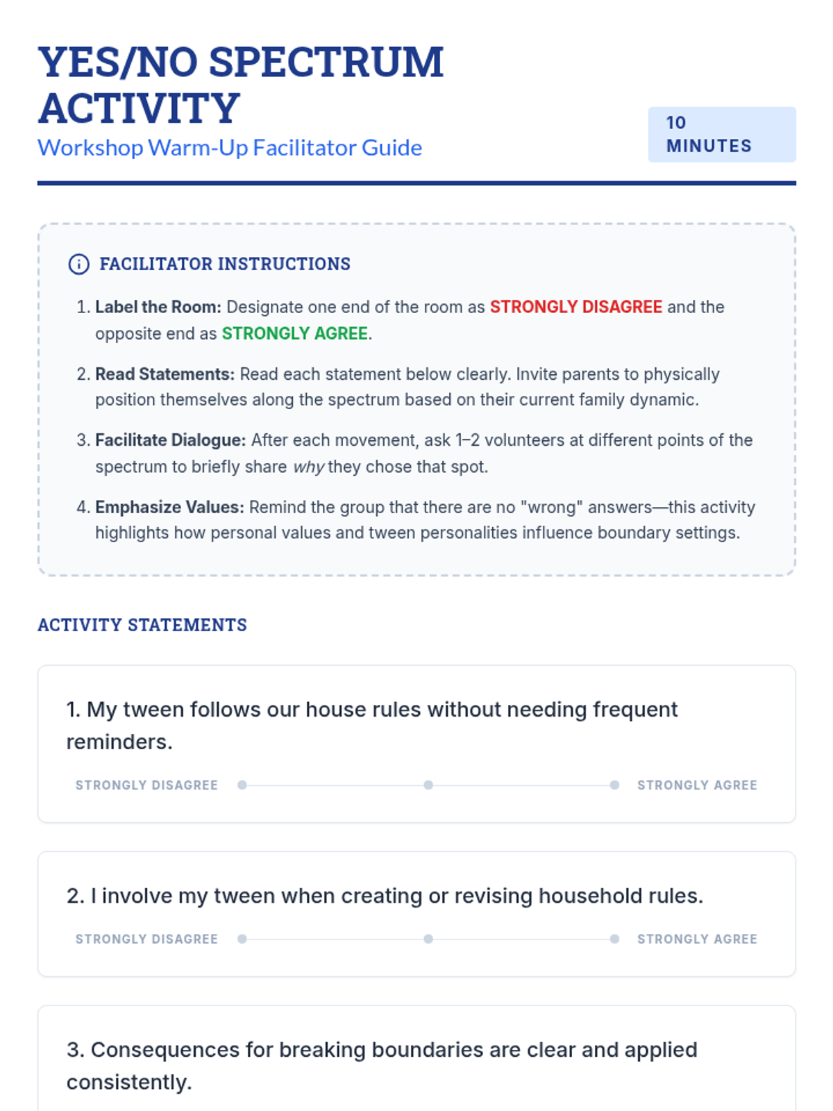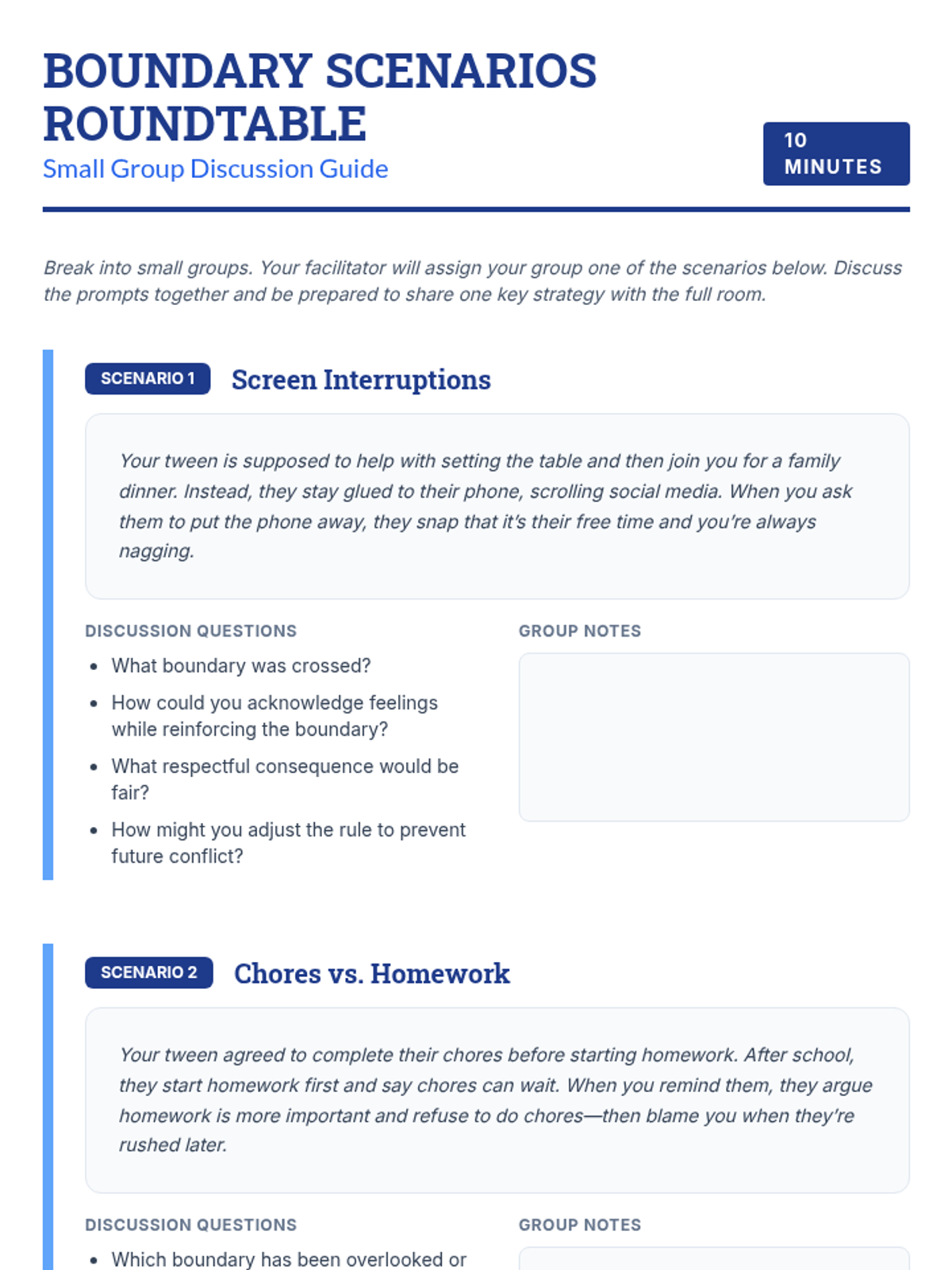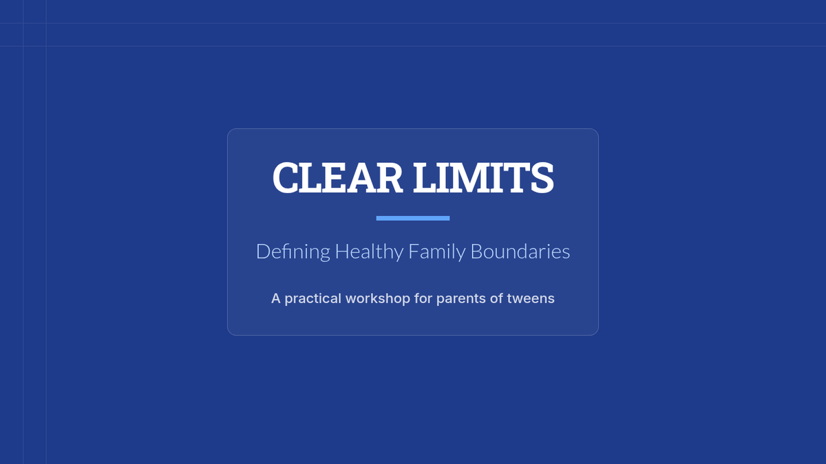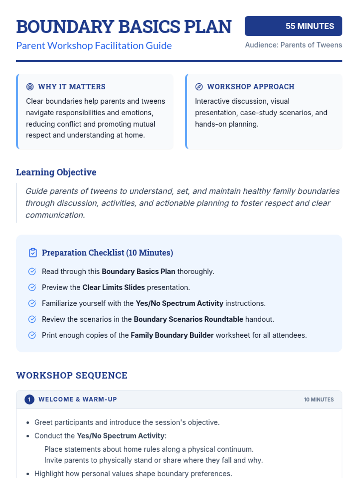 A 55-minute workshop for parents of tweens focusing on establishing and maintaining healthy family boundaries to reduce conflict and foster mutual respect.