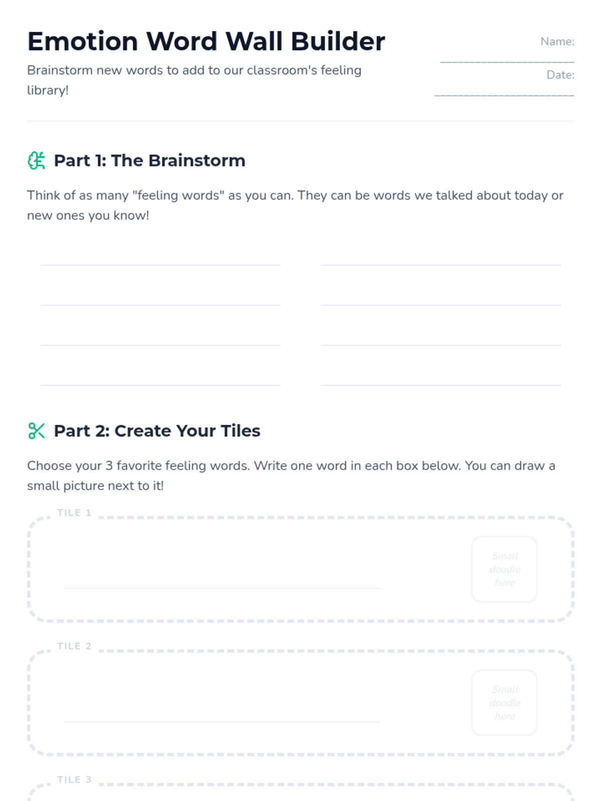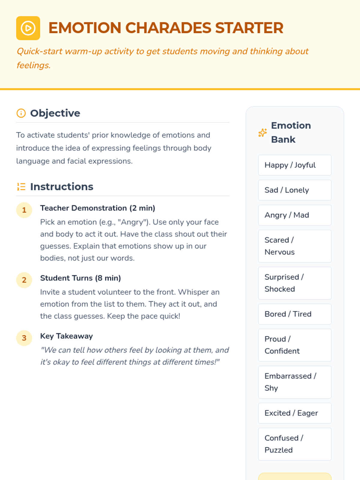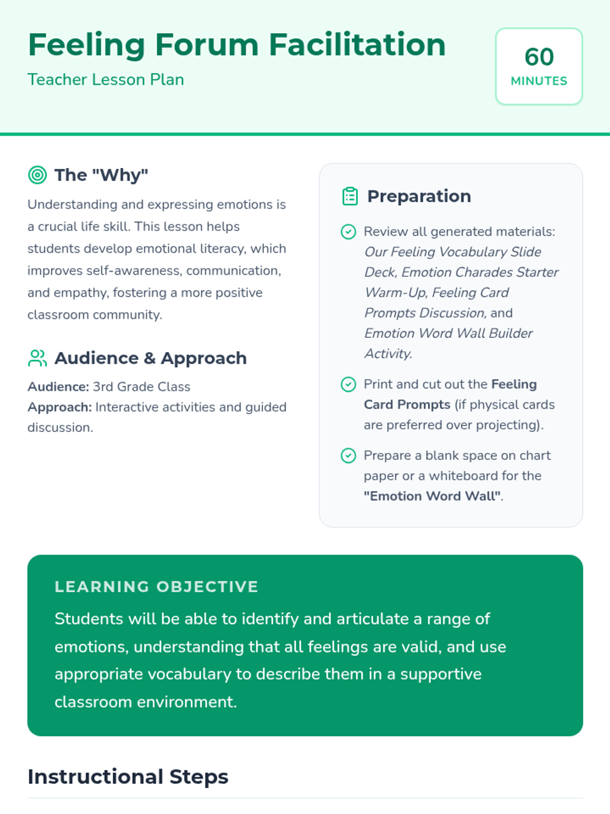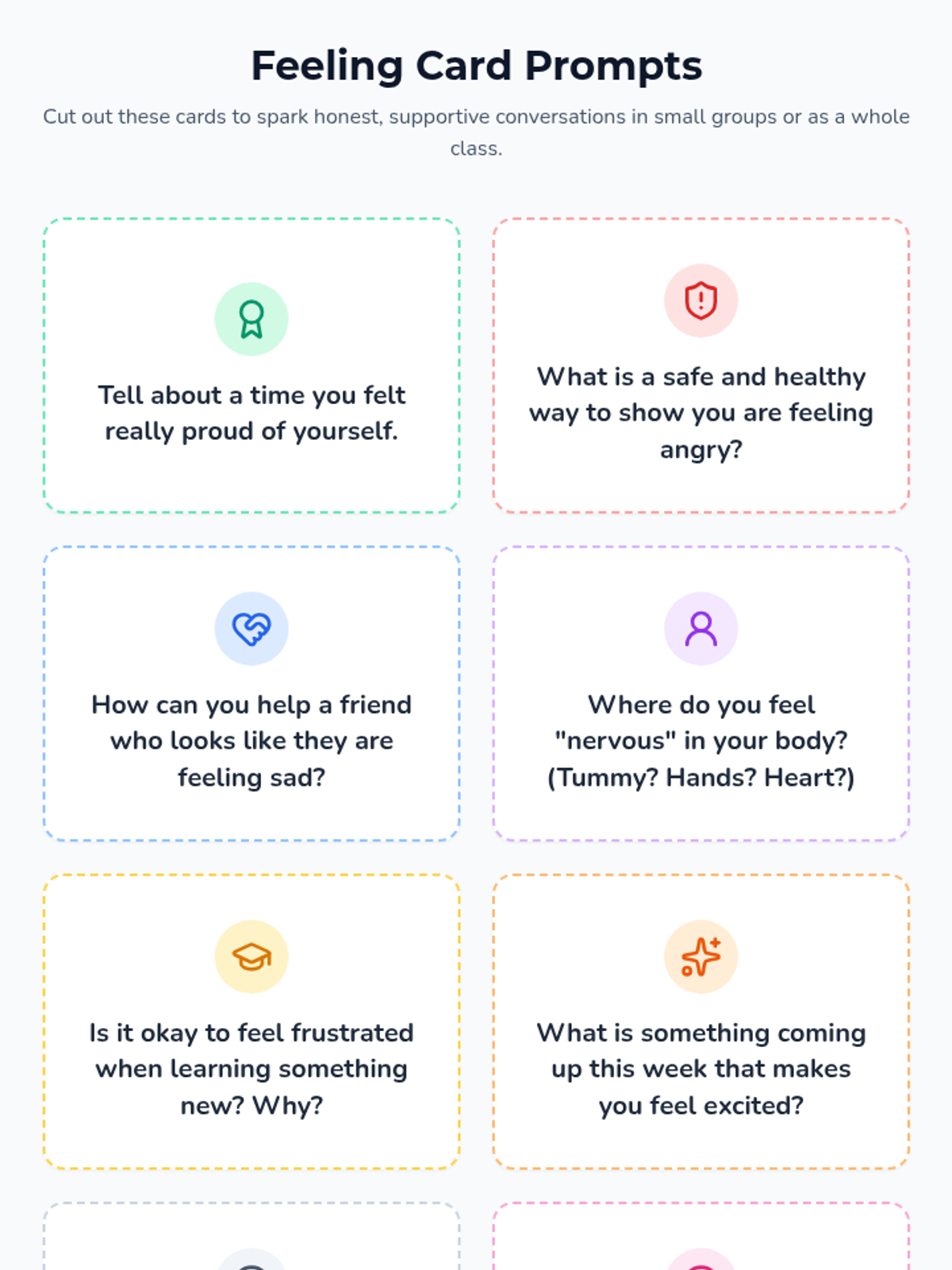 A 60-minute session for 3rd graders focused on expanding emotional vocabulary, validating all feelings, and building a supportive classroom community through interactive activities.