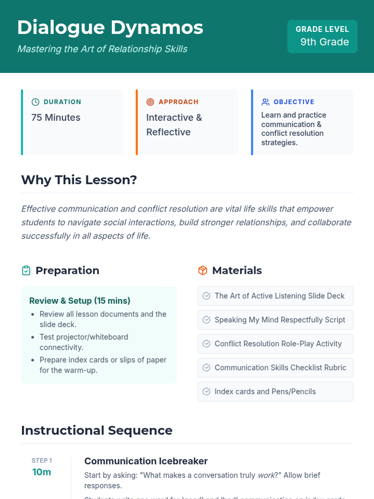 This lesson empowers 9th-grade students with essential relationship skills, focusing on active listening, 'I' statements, and respectful disagreement to navigate conflict effectively.
