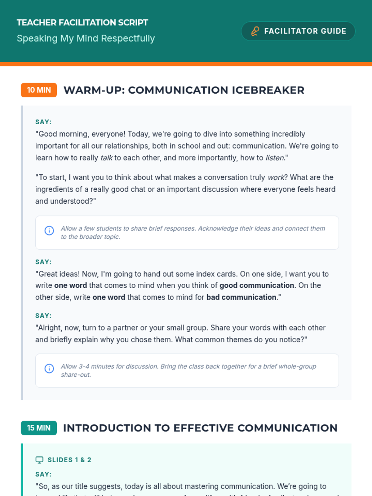 Developing teacher communication skills. Students practice scripts for asking for help, clarifying assignments, and negotiating deadlines.