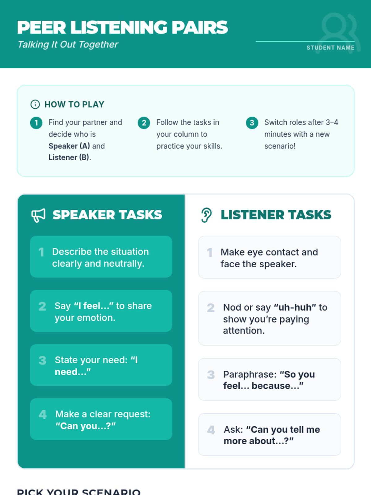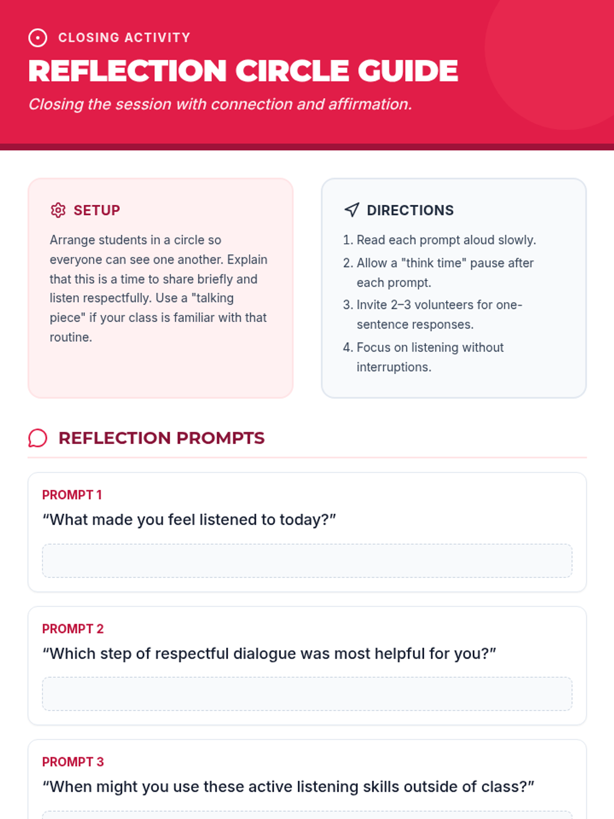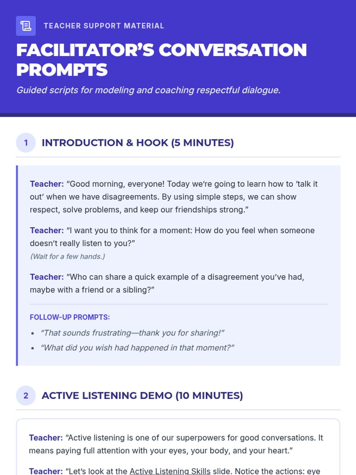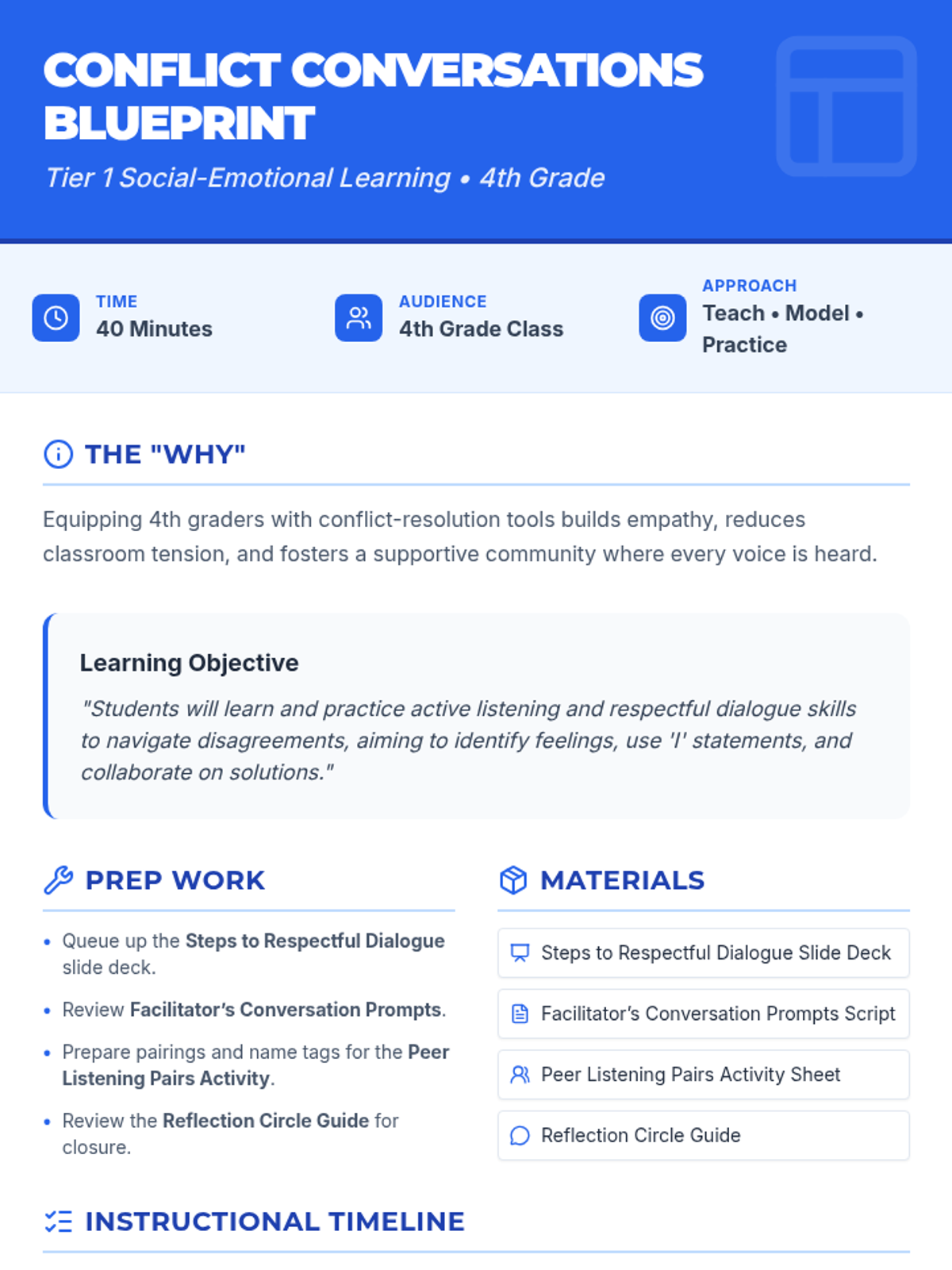 A 40-minute Tier 1 lesson for 4th graders focused on active listening and respectful dialogue to navigate disagreements and build a supportive classroom community.